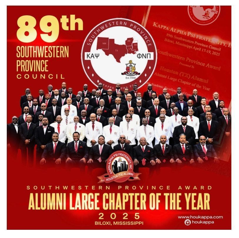THE HOUSTON (TX) ALUMNI CHAPTER OF KAPPA ALPHA PSI FRATERNITY, INC. CHARTERED MARCH 31. 1928. HAS STOOD AS A BEACON OF ACHIEVEMENT. BROTHERHOOD. AND COMMUNITY SERVICE FOR ALMOST A CENTURY NOW!