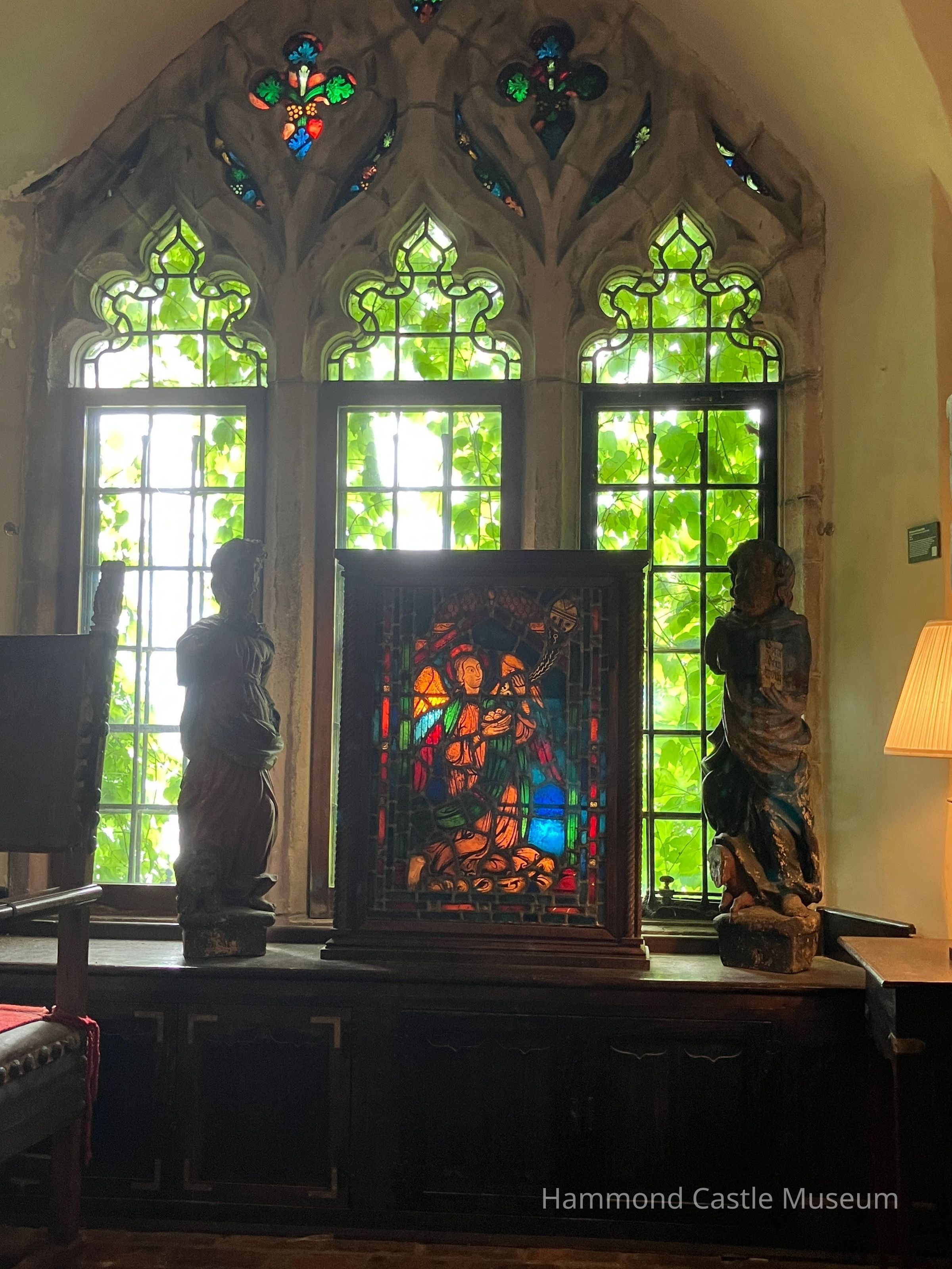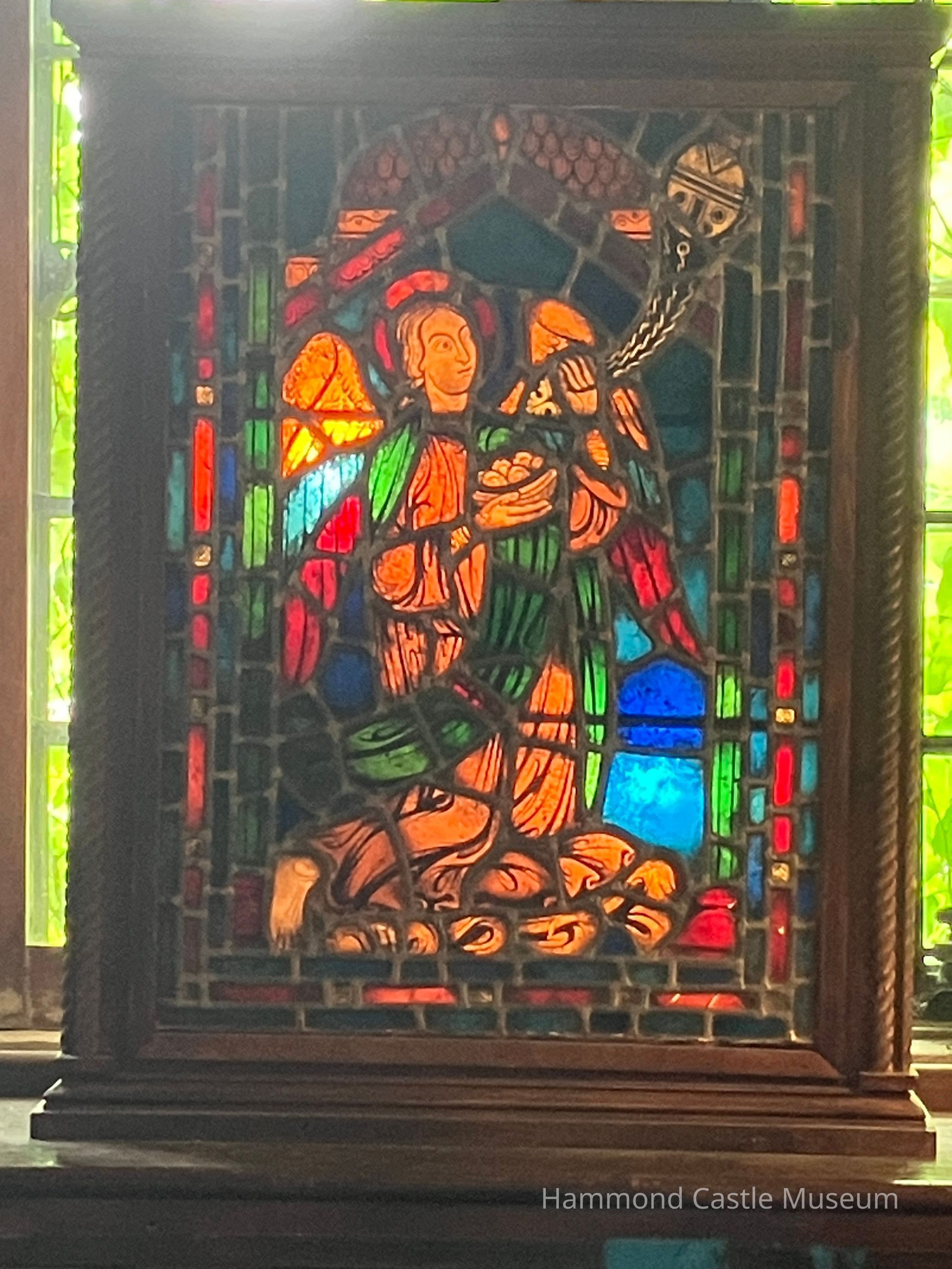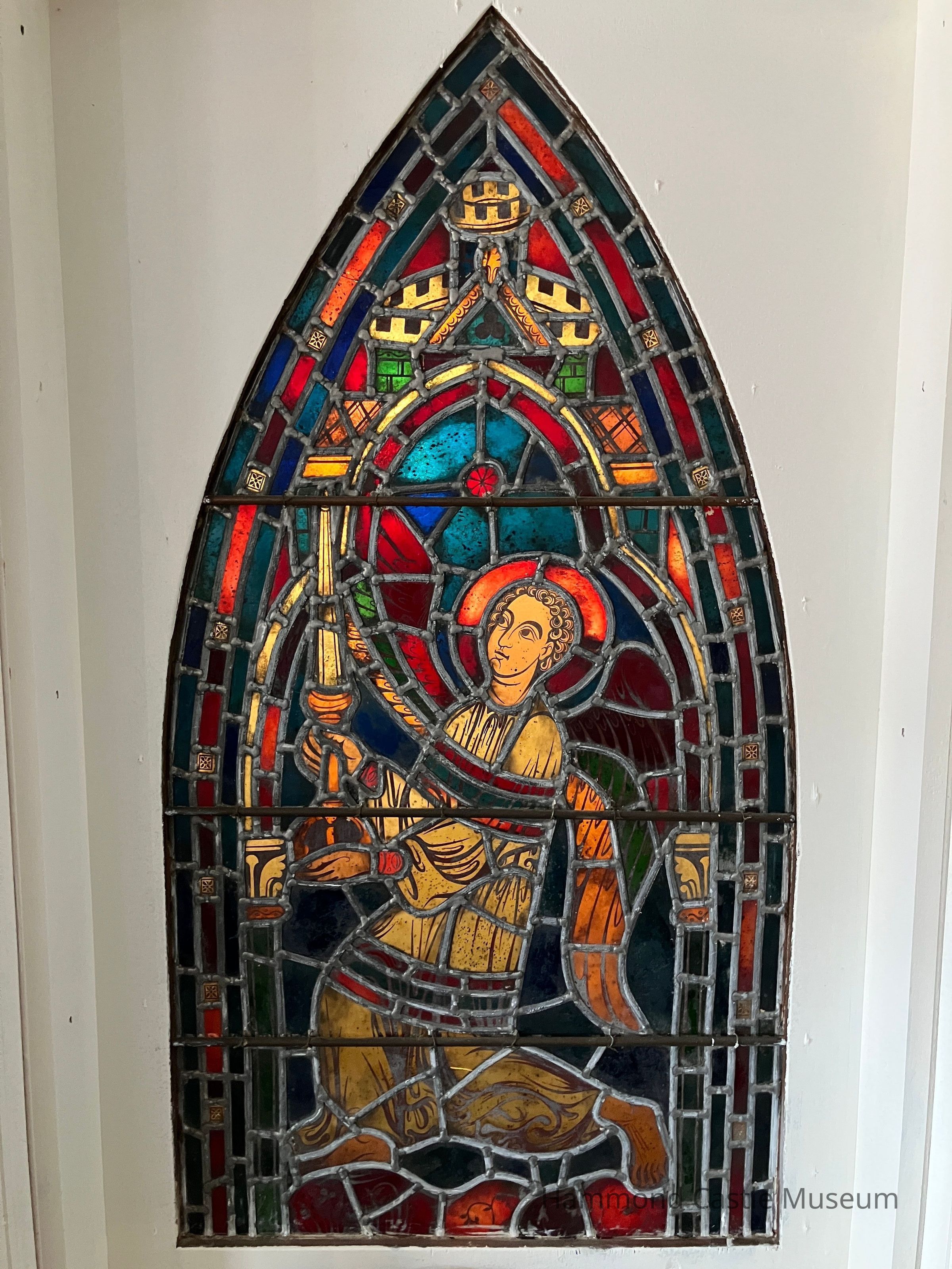 Originally in Minstrel gallery as side panels of La Belle Verriere by Jacques Simon, 1929 (see H.M. 806) Post 1969, moved to office stairwell.