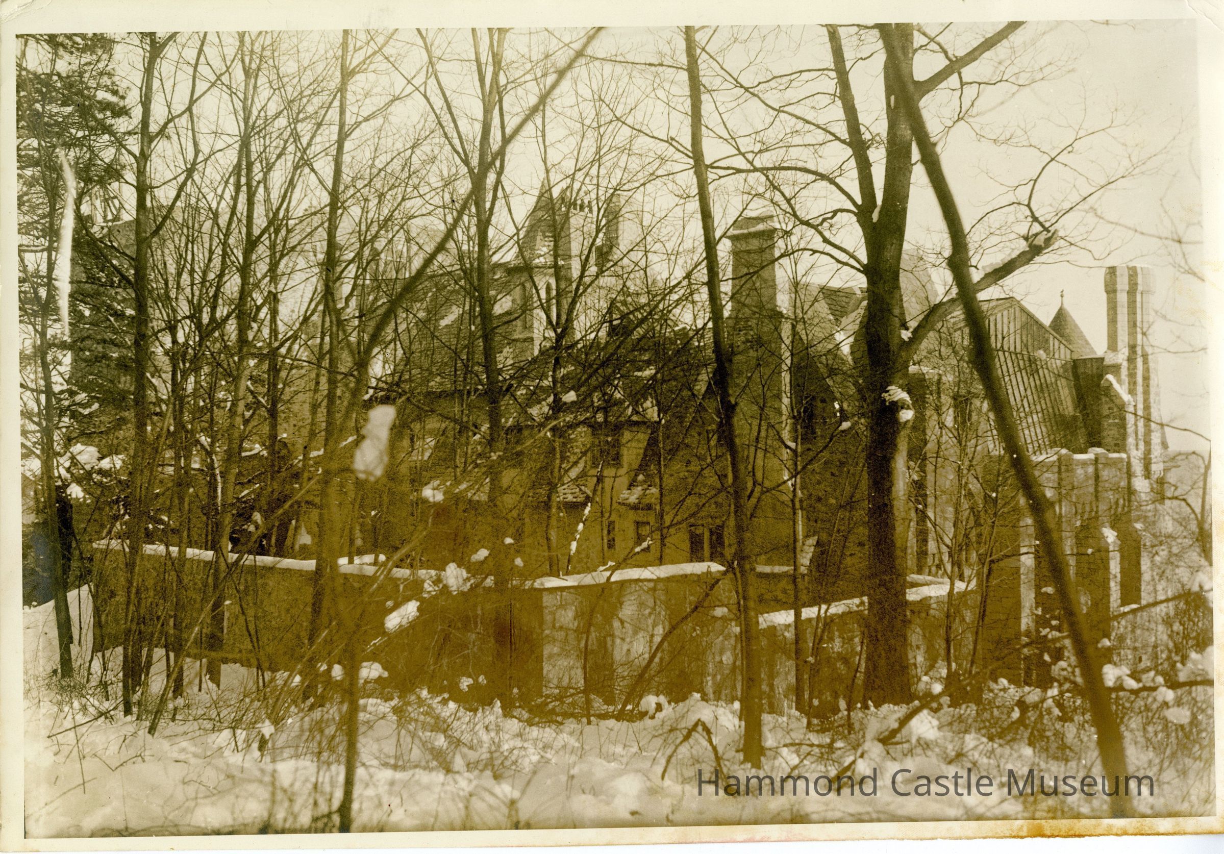 Photo of west side of Hammond Castle in the winter with snow, cat garden walls in foreground