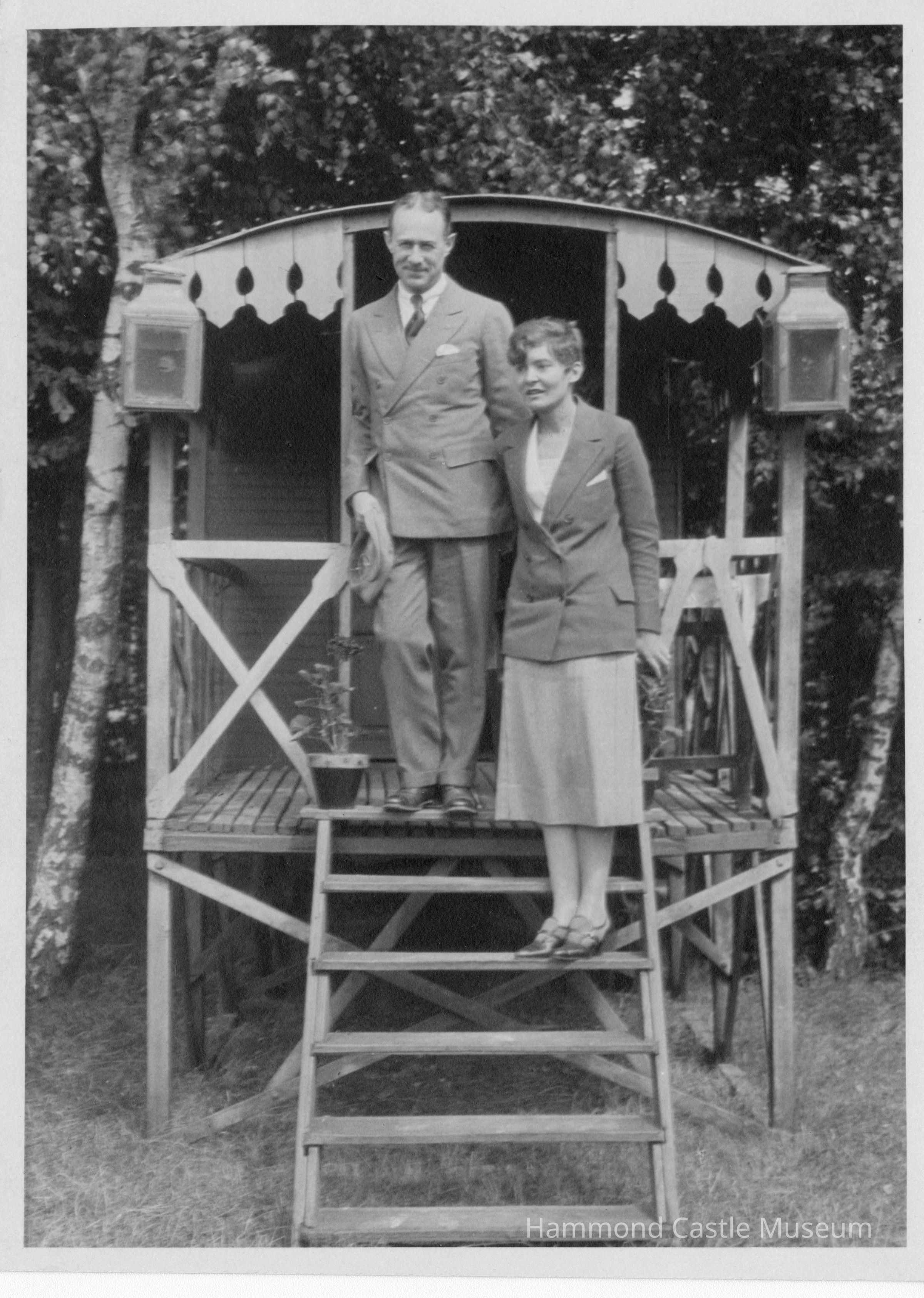 Photo of Hammond and woman on stairs of caravan (possibly Alice Delamar)