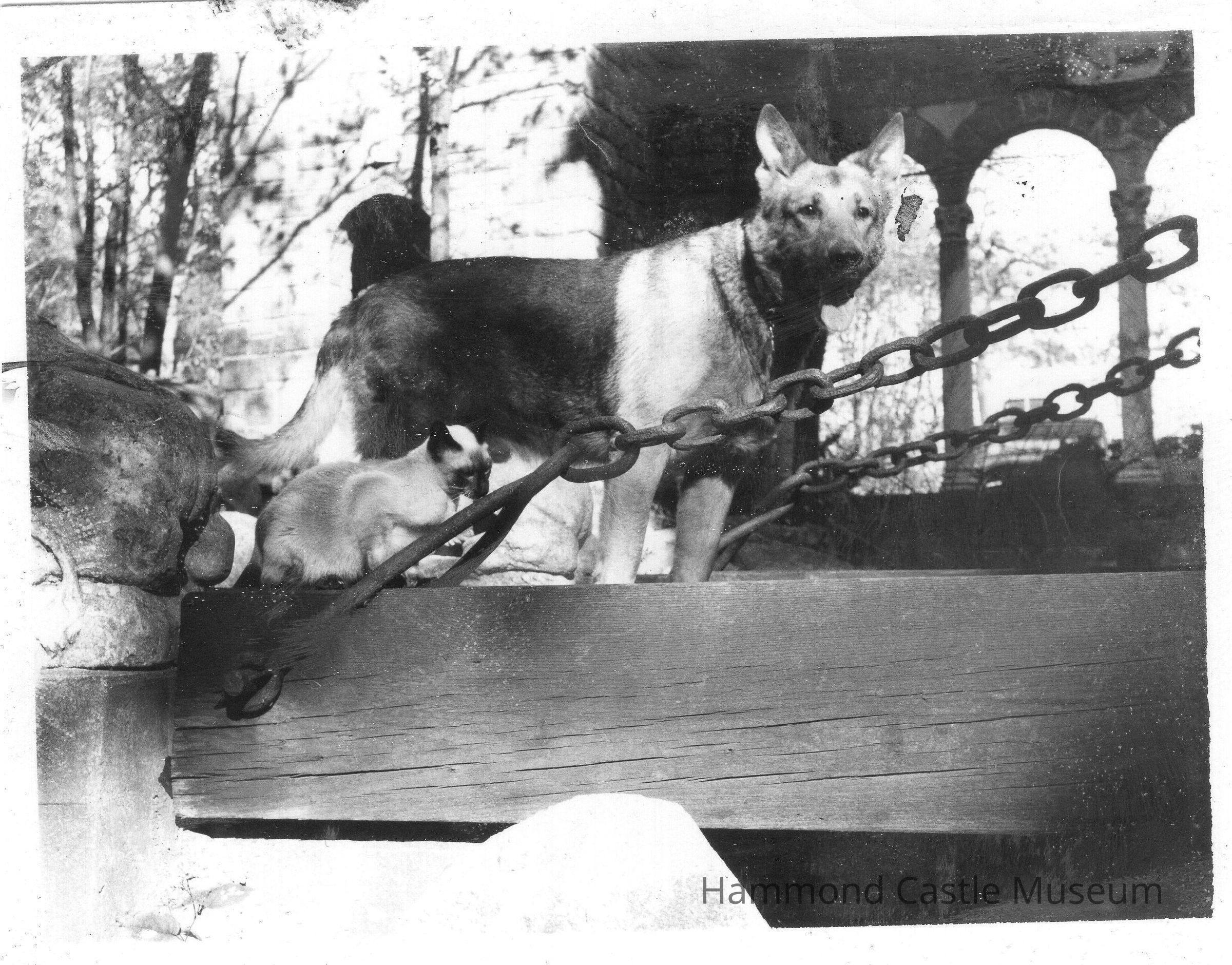 Photo of Shepherd dog & Siamese cat on drawbridge, 1954 ca