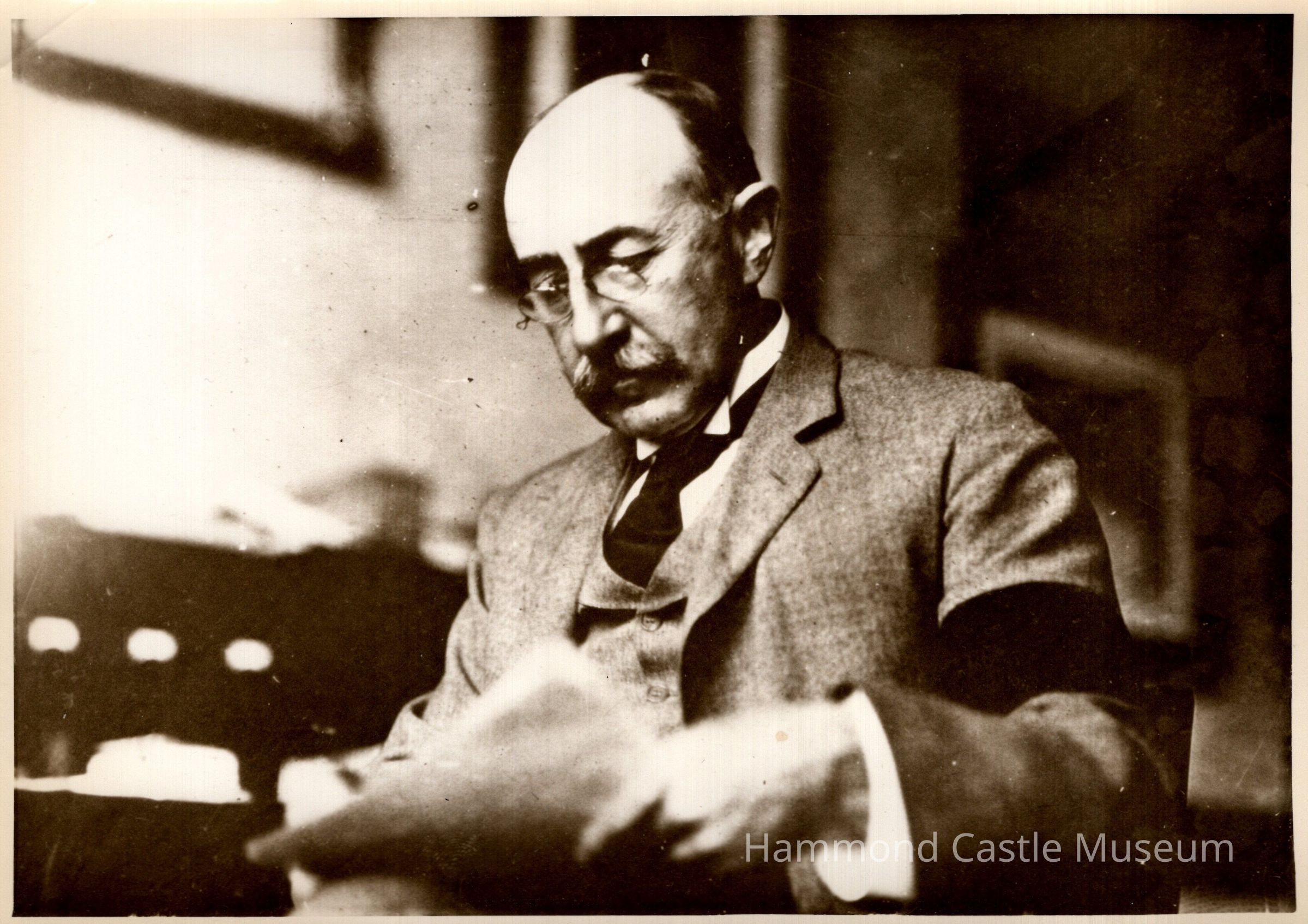 2 copies of Hammond Sr looking at papers and wearing a mourning armband, 1930 ca