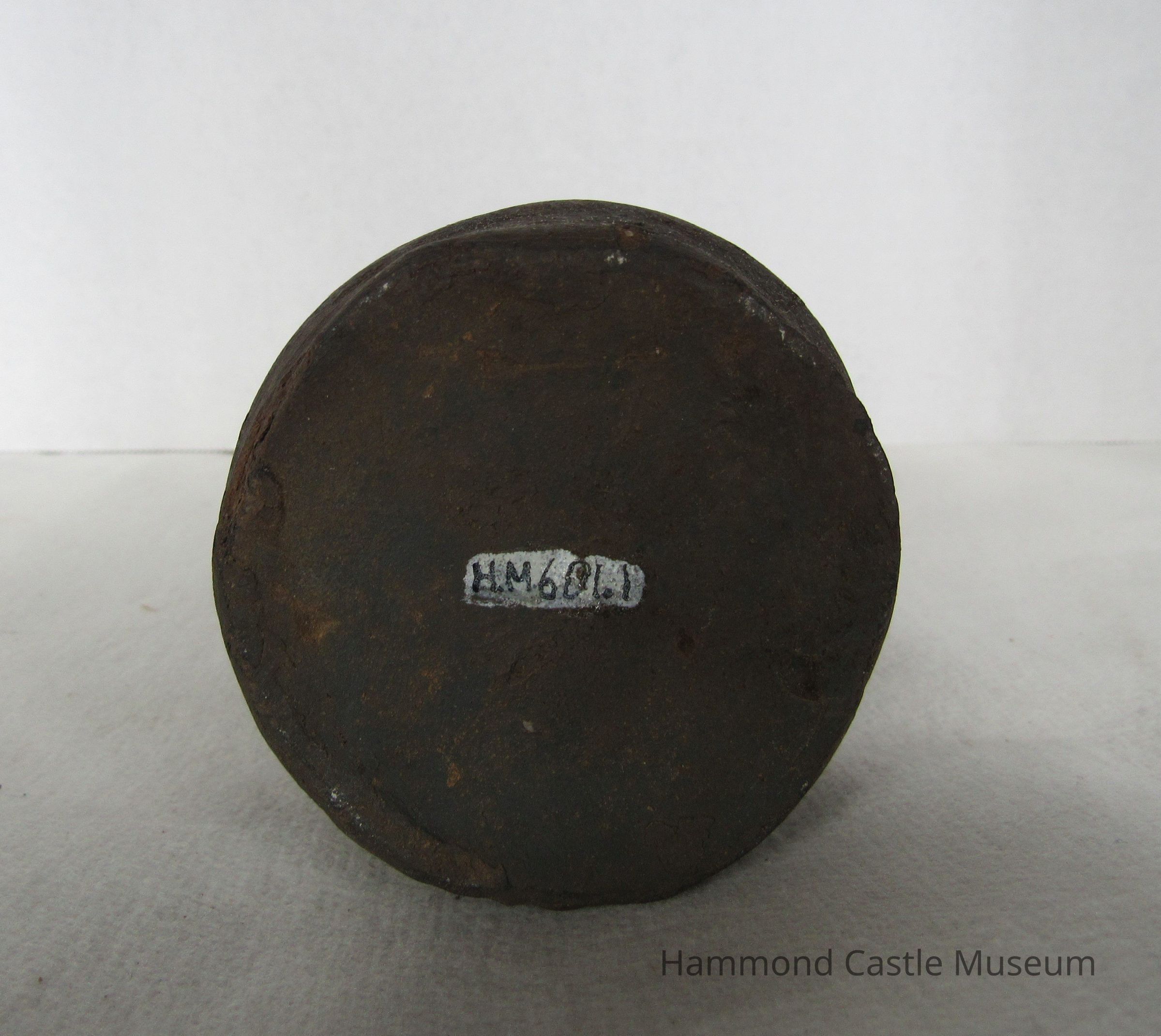 Liquor bottle, sienna and green in color. "Calvados tres Vieux" on label. Unglazed brown and black. 1 of 10.