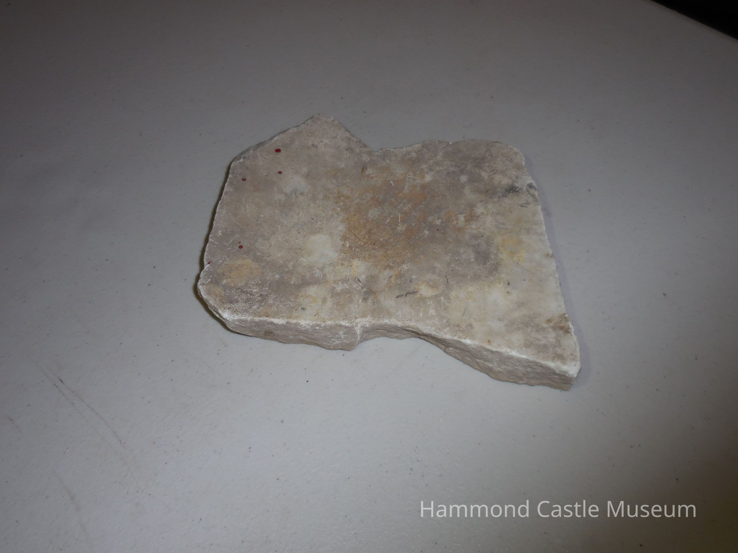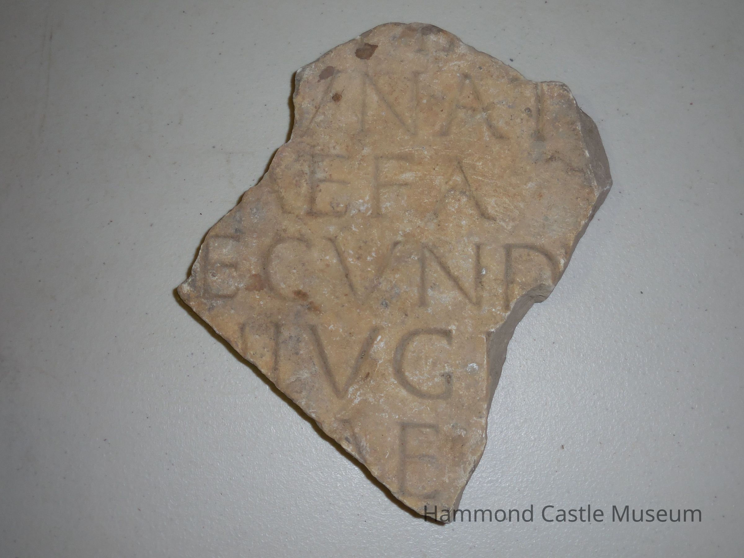 Marble fragment with inscription (in record-storage closet) 'Reportedly Roman, but possibly forgery Inscription - NAT AEFA ECVND IVG AE * no translation