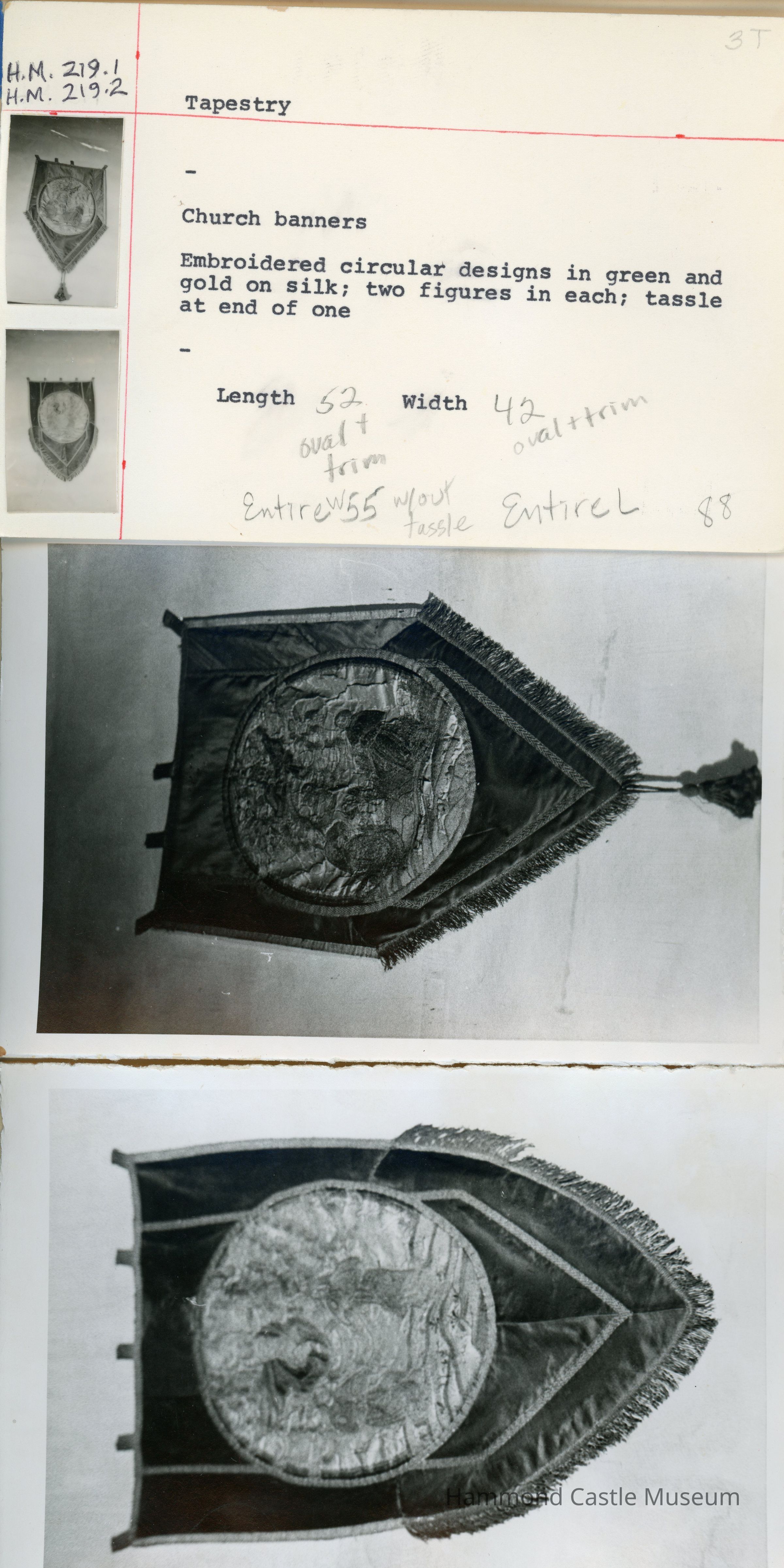 15th c. Church Banner pair with Circular Image of Figure Wine with gold galloon; single tassel