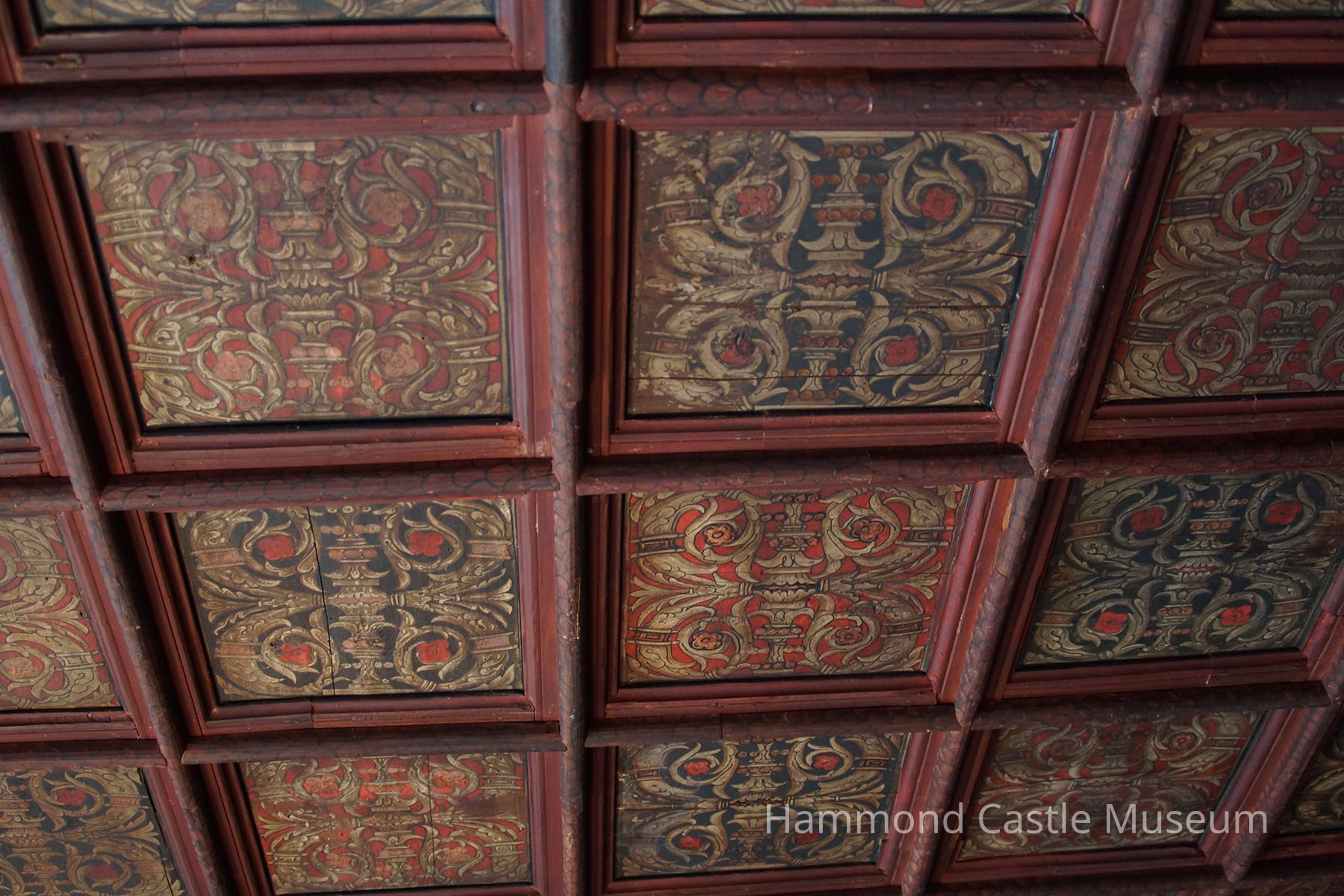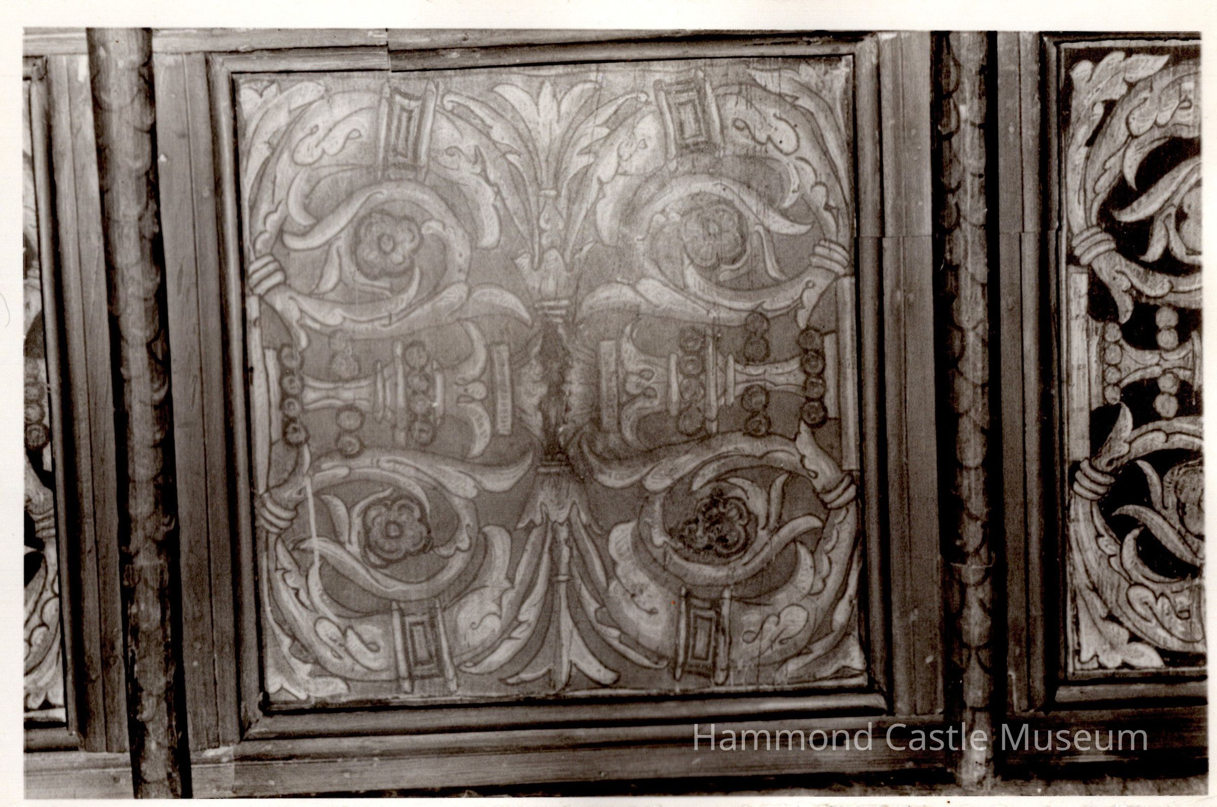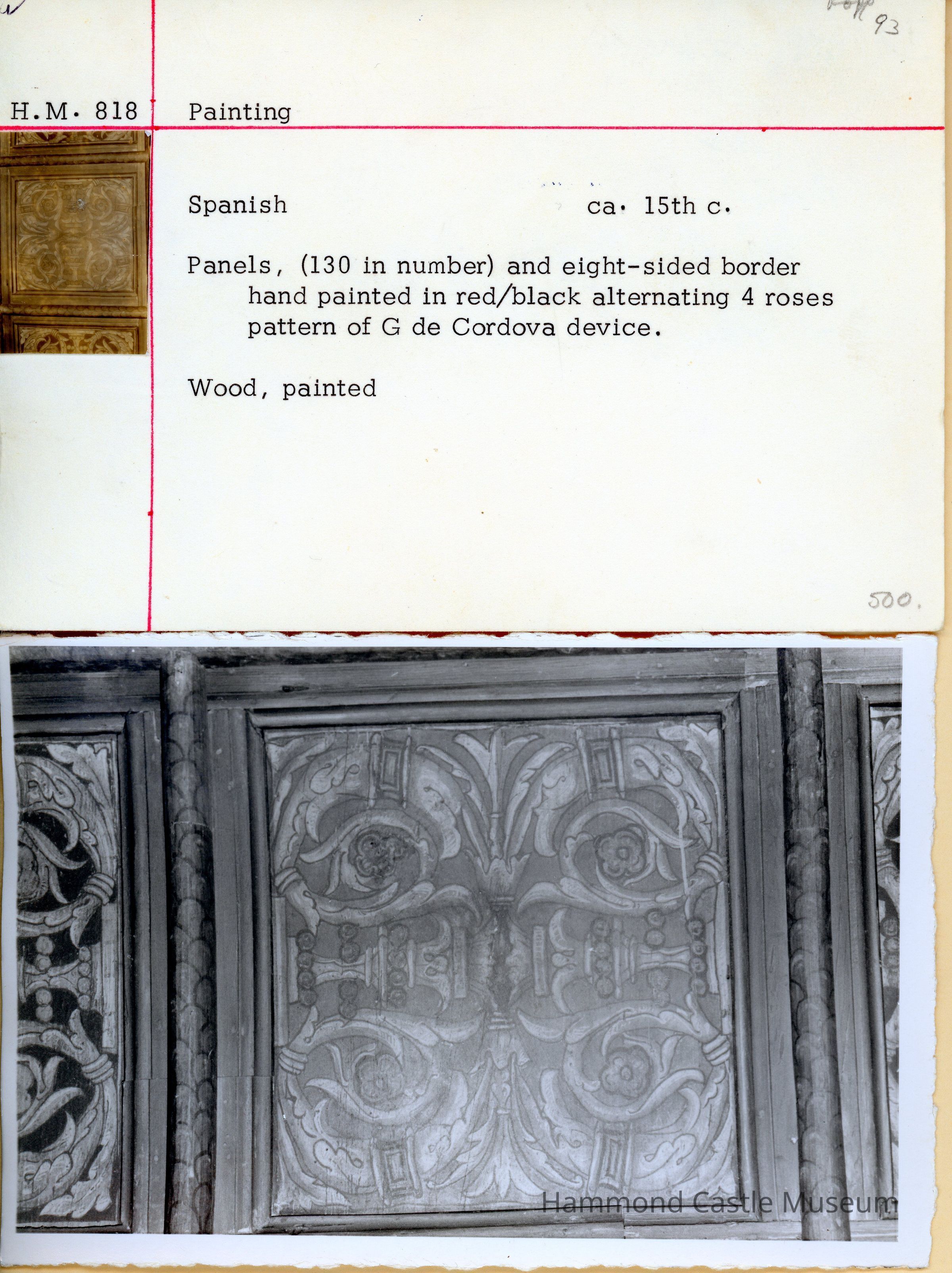 "Acquired by Leslie Buswell on 13 May 1922 at the Clarke Galleries, NYC, sale of the Raimondo Ruiz Collection of Spanish antiquities. Described as 16th century from the palace of the Count of Cabra. Paid $2,200. Top price paid for day’s sale. Other big bidder was William Randolf Hearst. Partly installed in ceiling of the Bungalow’s Tudor bay window in 1922. Later removed to the Castle.