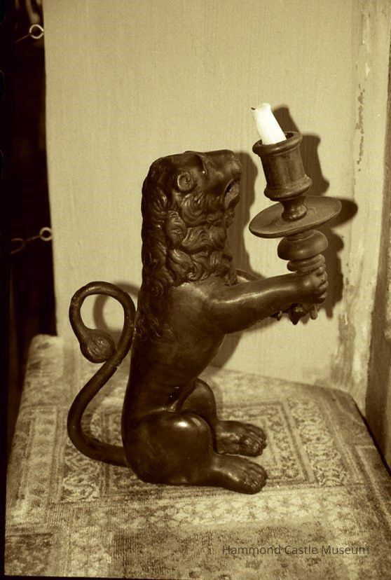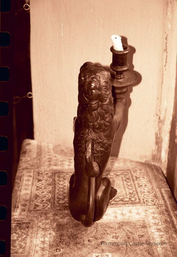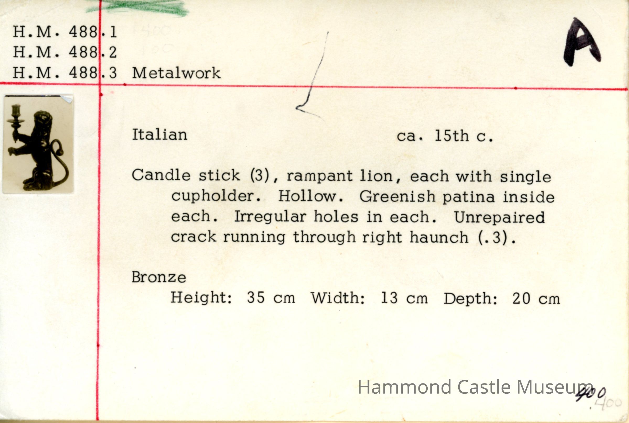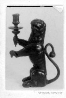 Rampant lion, each with single cupholder; Hollow; Greenish patina inside each; Irregular holes in each; Unrepaired crack running through right haunch (488.3)