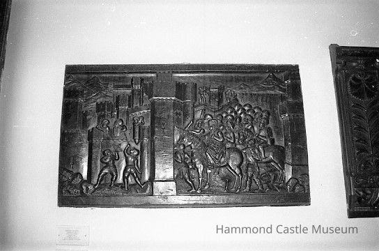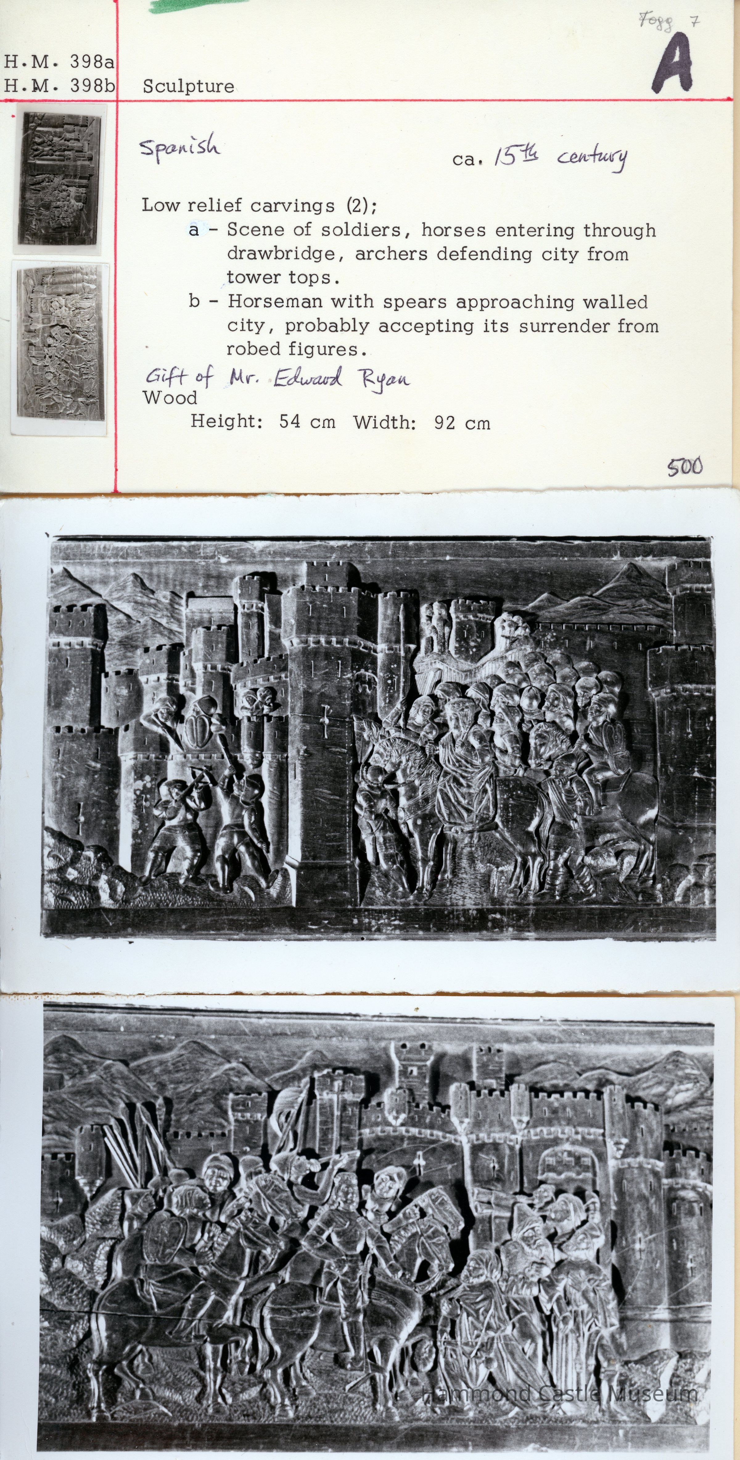 HM398. b pair of Spanish carved wooden panels w castle seige scenes infoNote Type