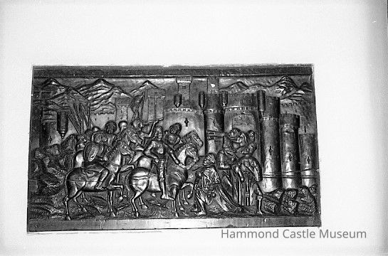 HM398. a pair of Spanish carved wooden panels w castle seige scenes infoNote Type