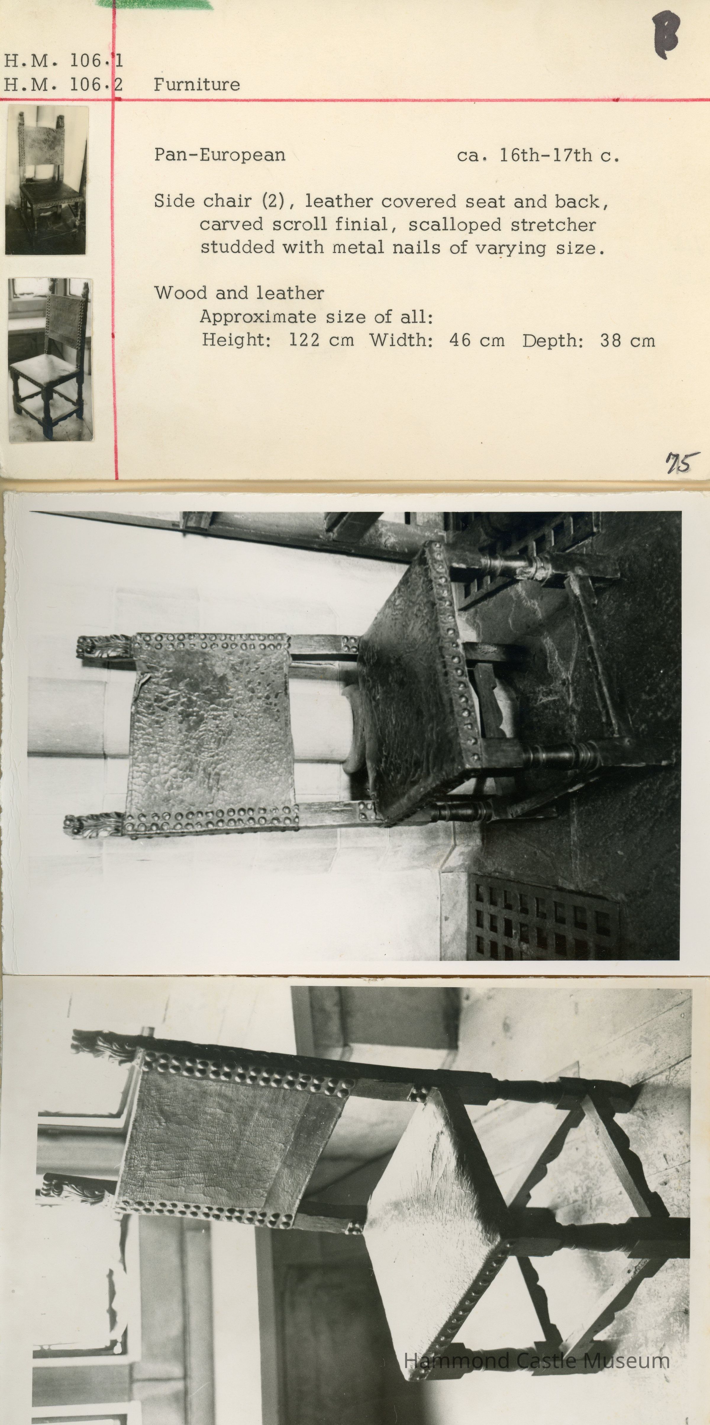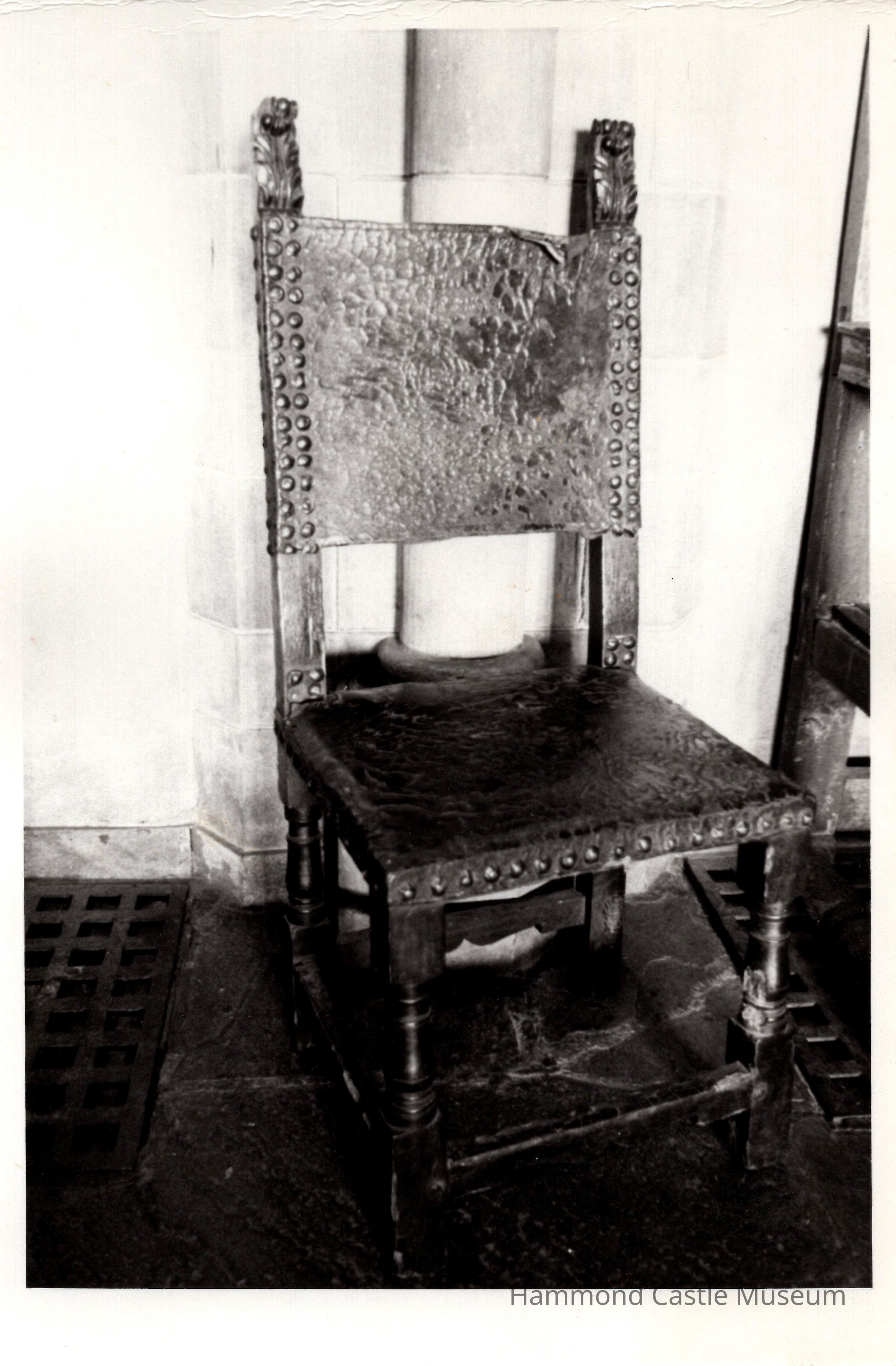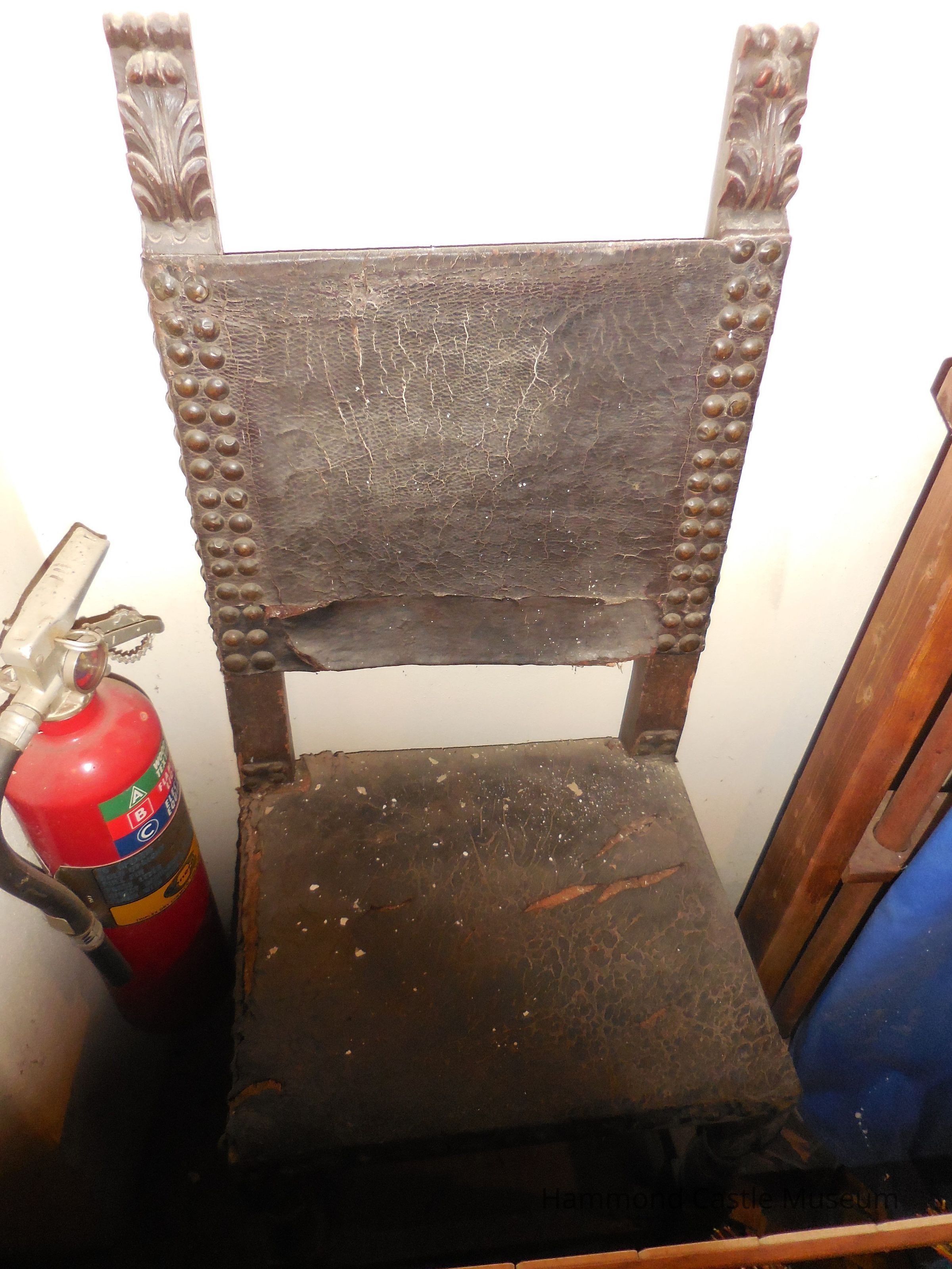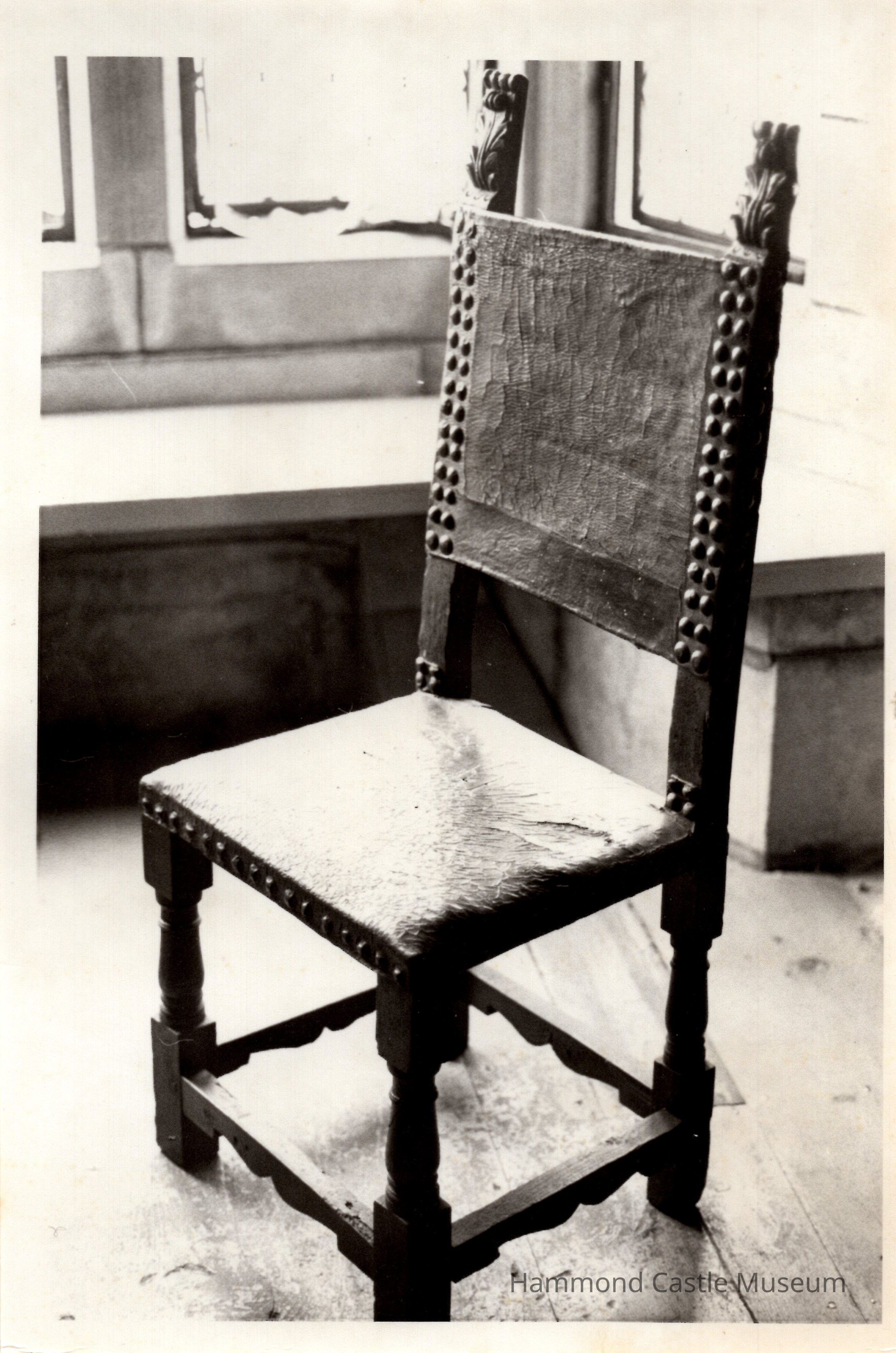 Leather covered seat and back, carved scroll finial, scalloped stretcher studded with metal nails of varying size.