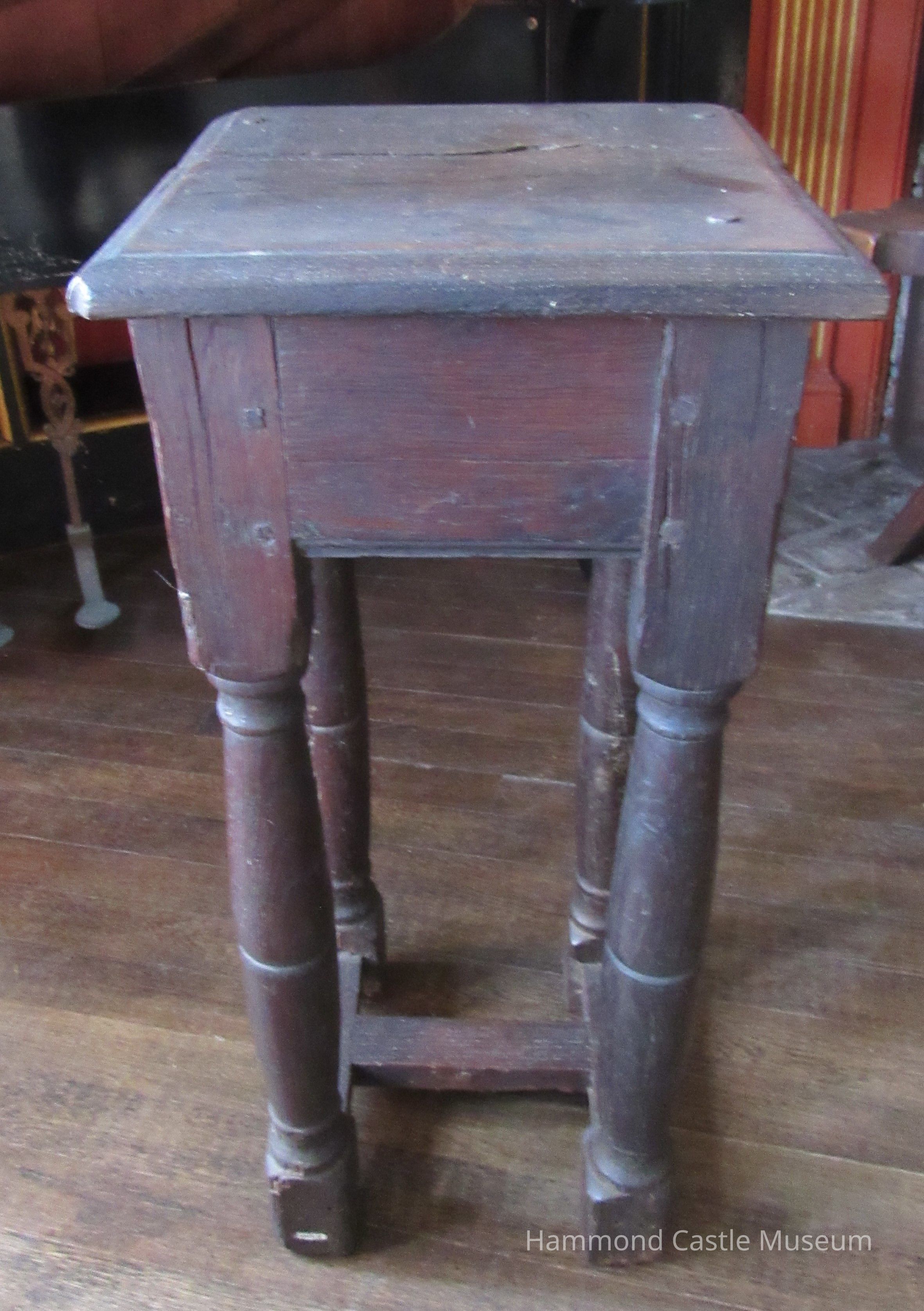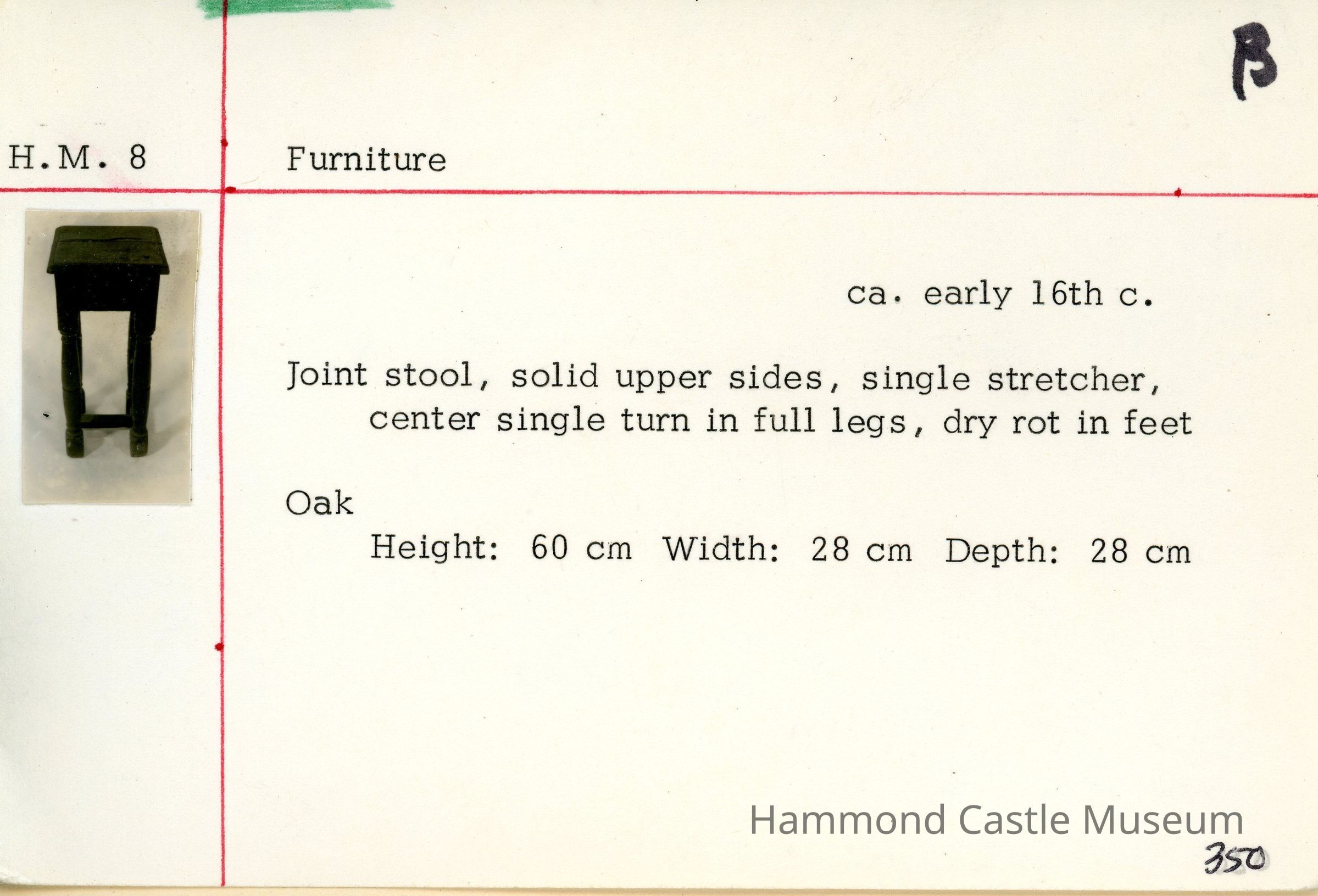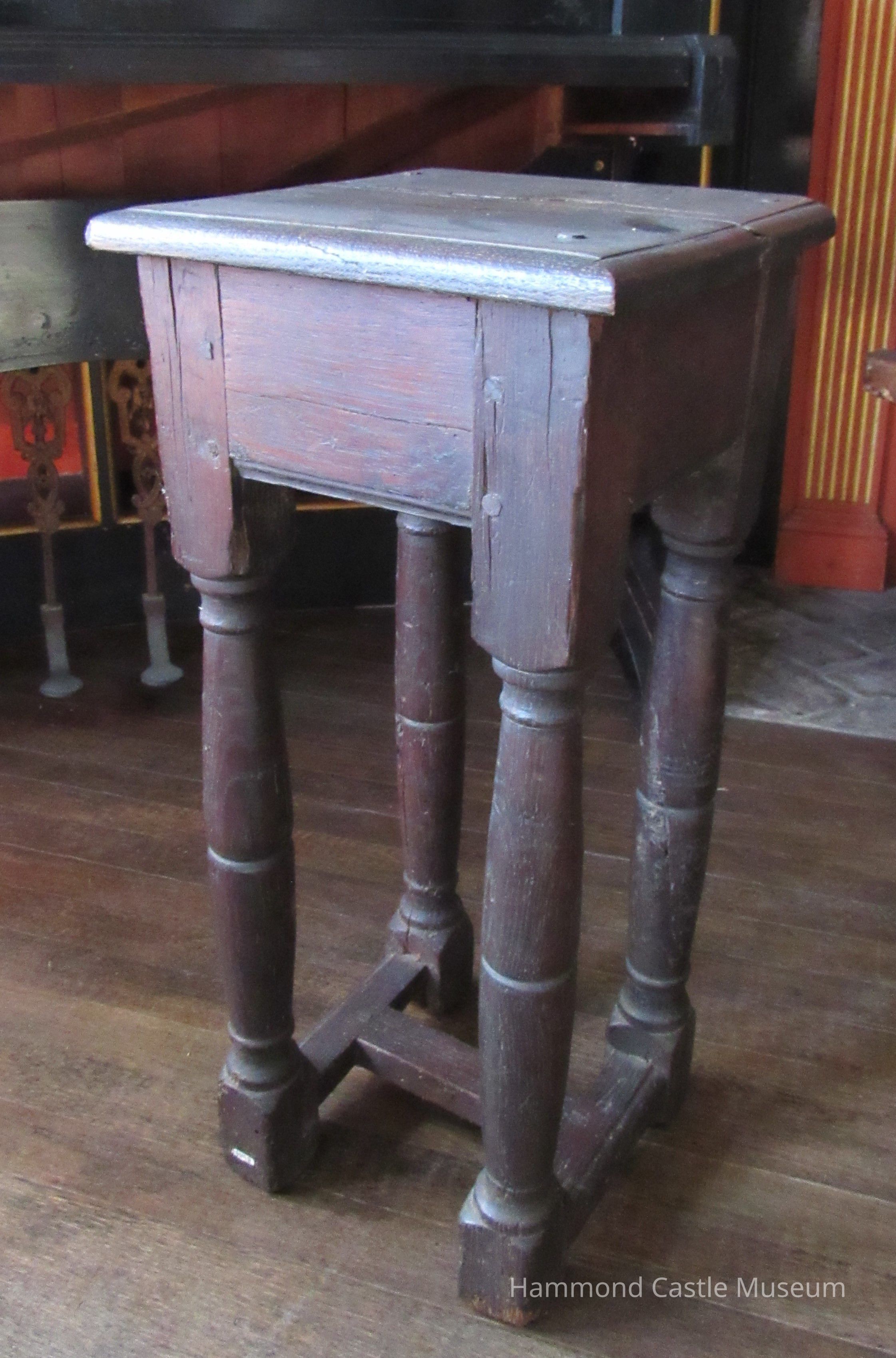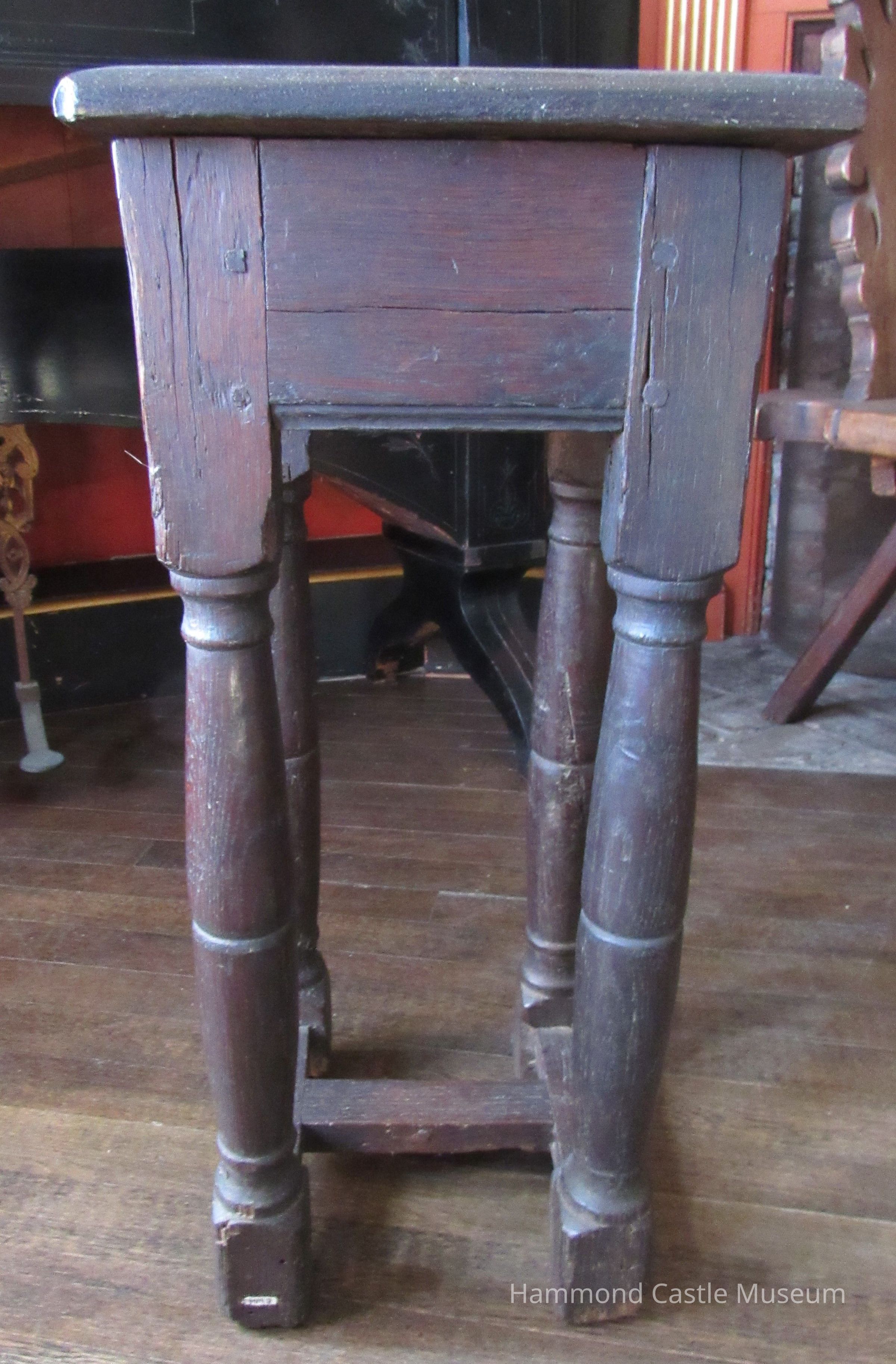 16thc Stool or lamp table. Joint stool, solid upper sides, single stretcher, center single turn in full legs.