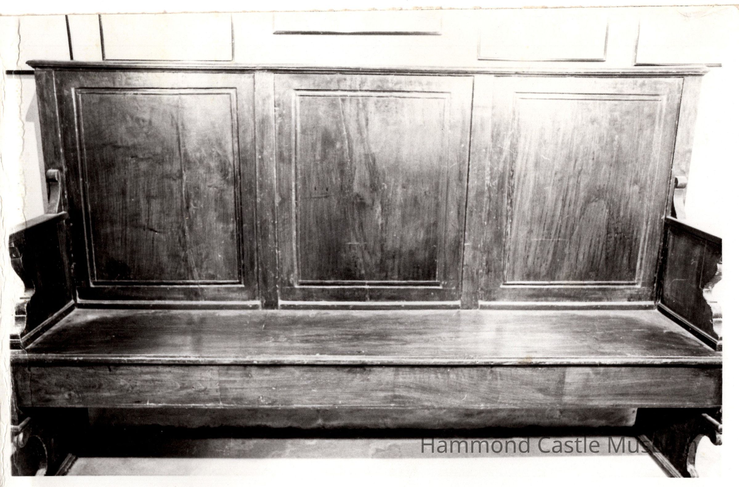 Straight high back settee/bench, three wainscot panels, straight arms with indented carving at front. Corresponding design at feet. From a monastery in Venice.