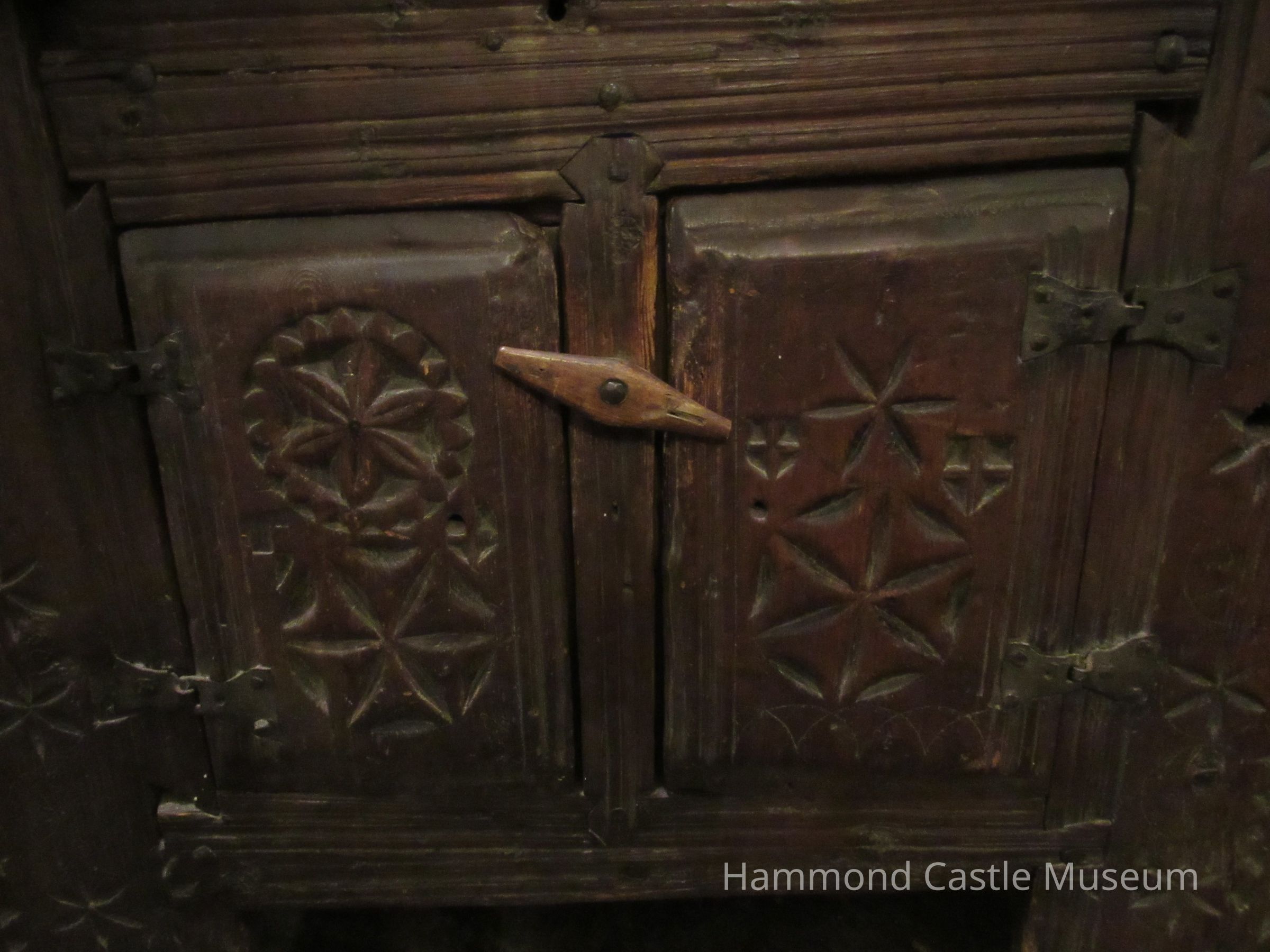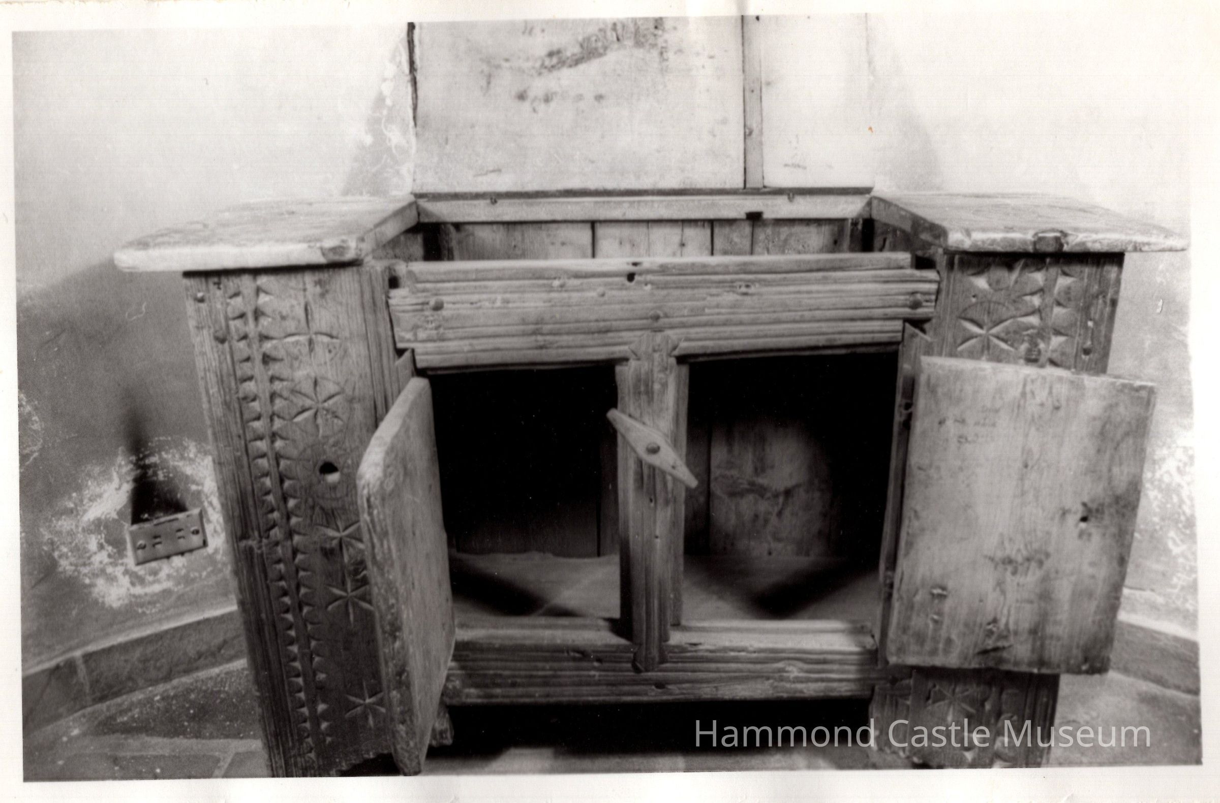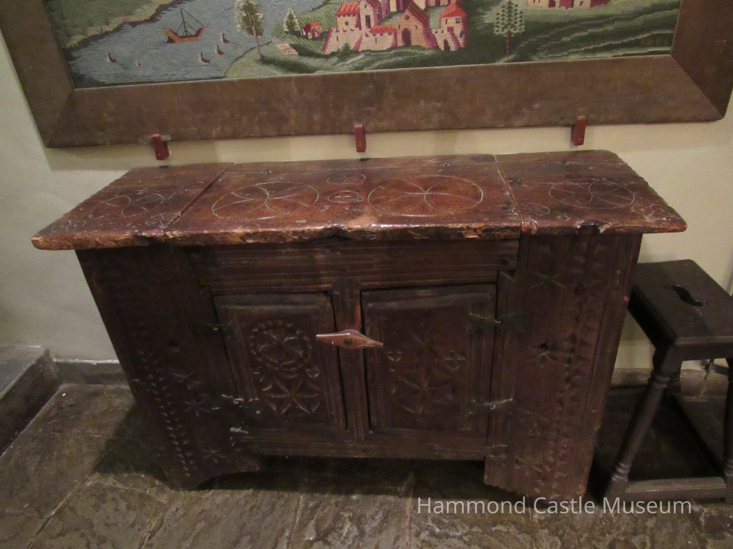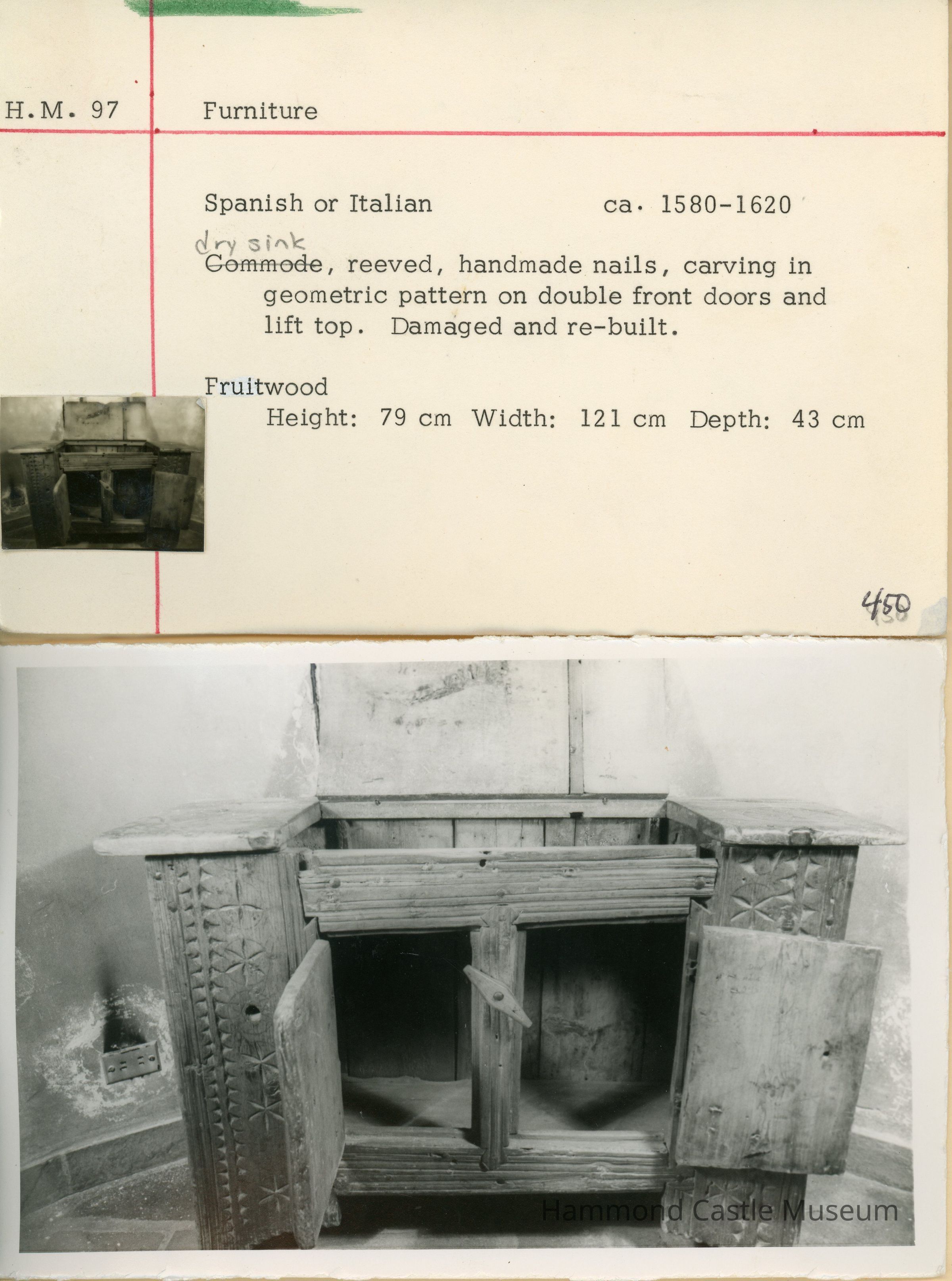 Commode cabinet/dry sink, reeved, handmade nails, carving in geometric pattern on double front doors and lift top.