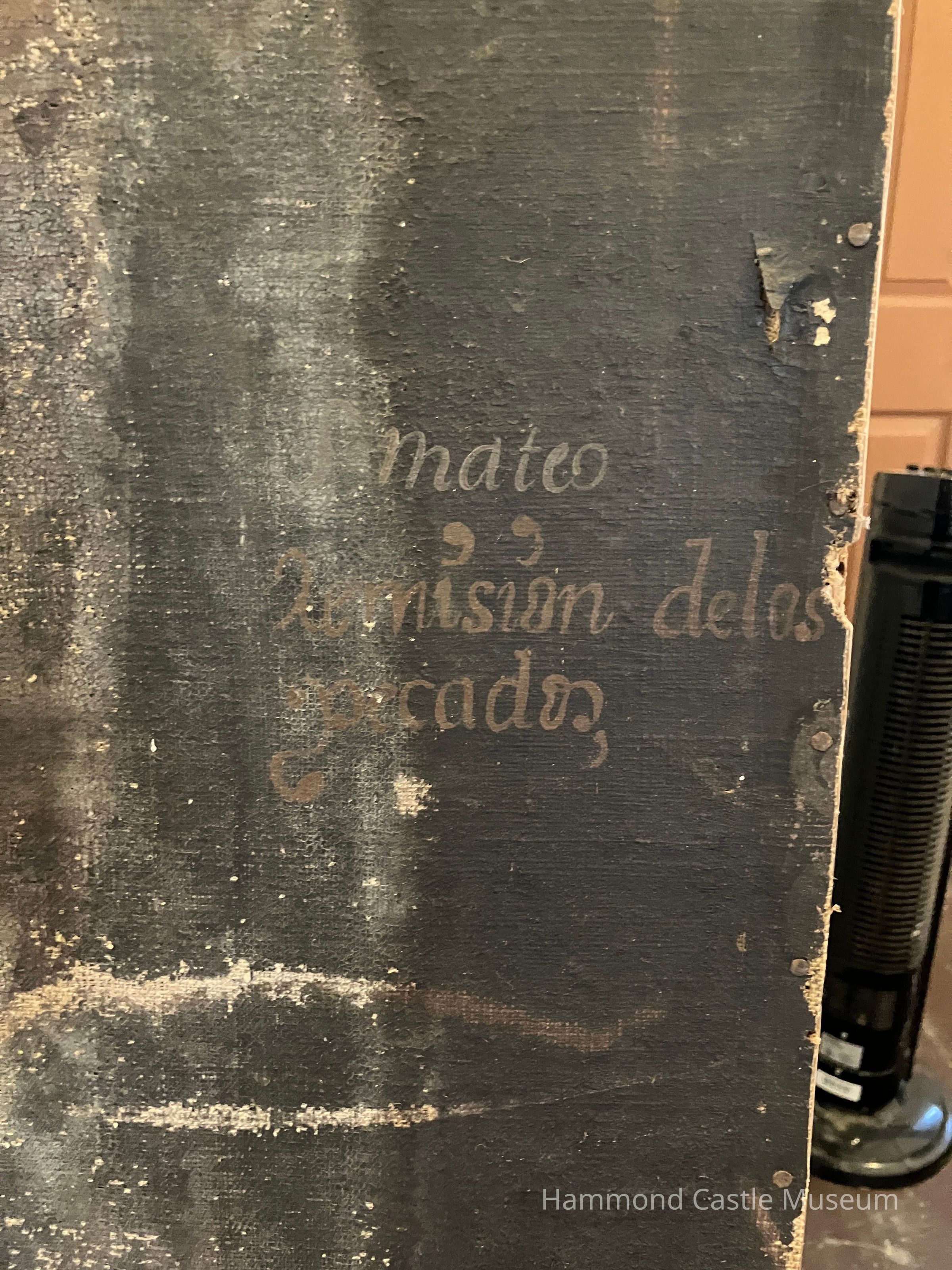 Robed figure with golden rod, Spanish writing in bottom right area including "Matteo"