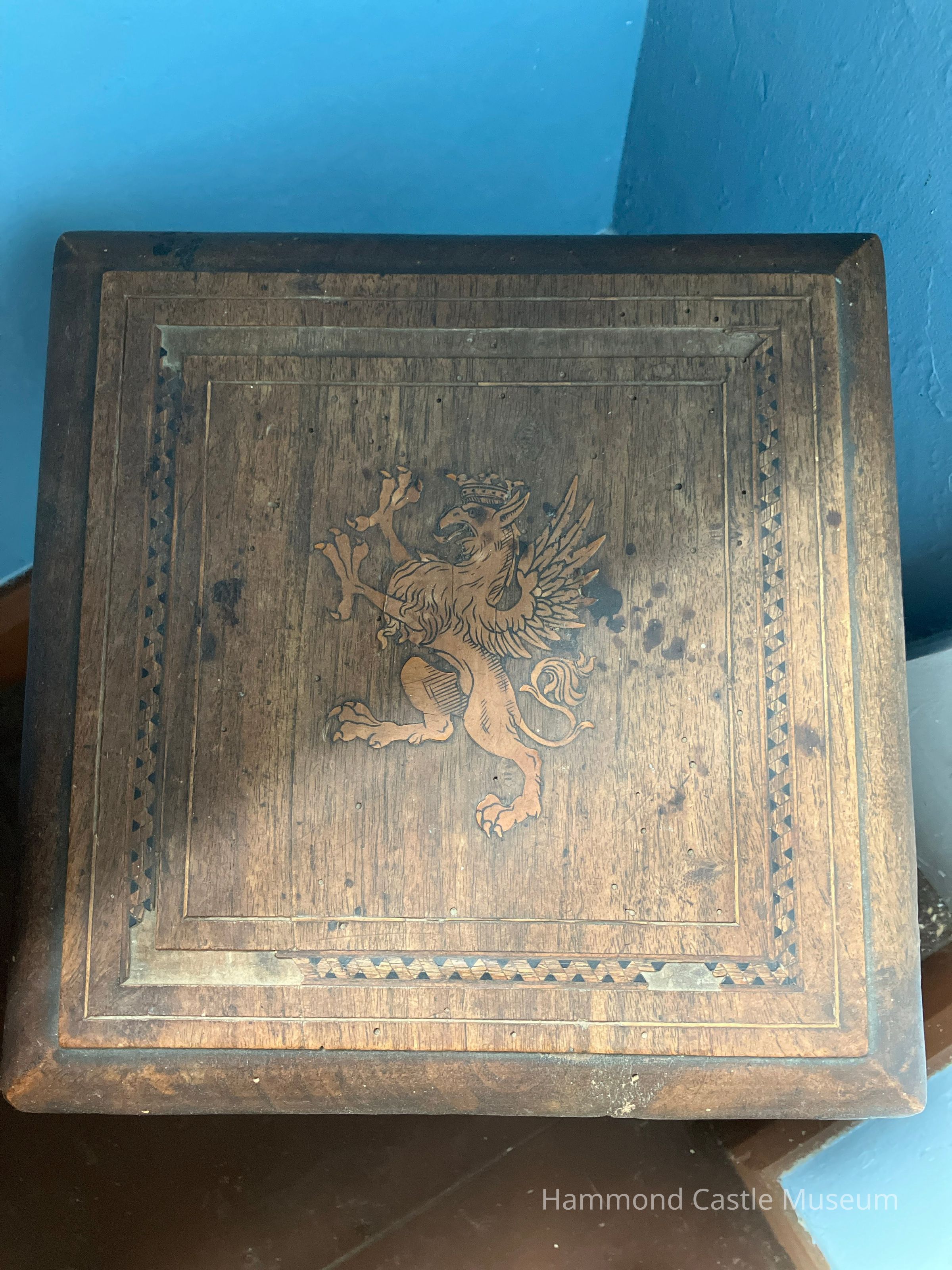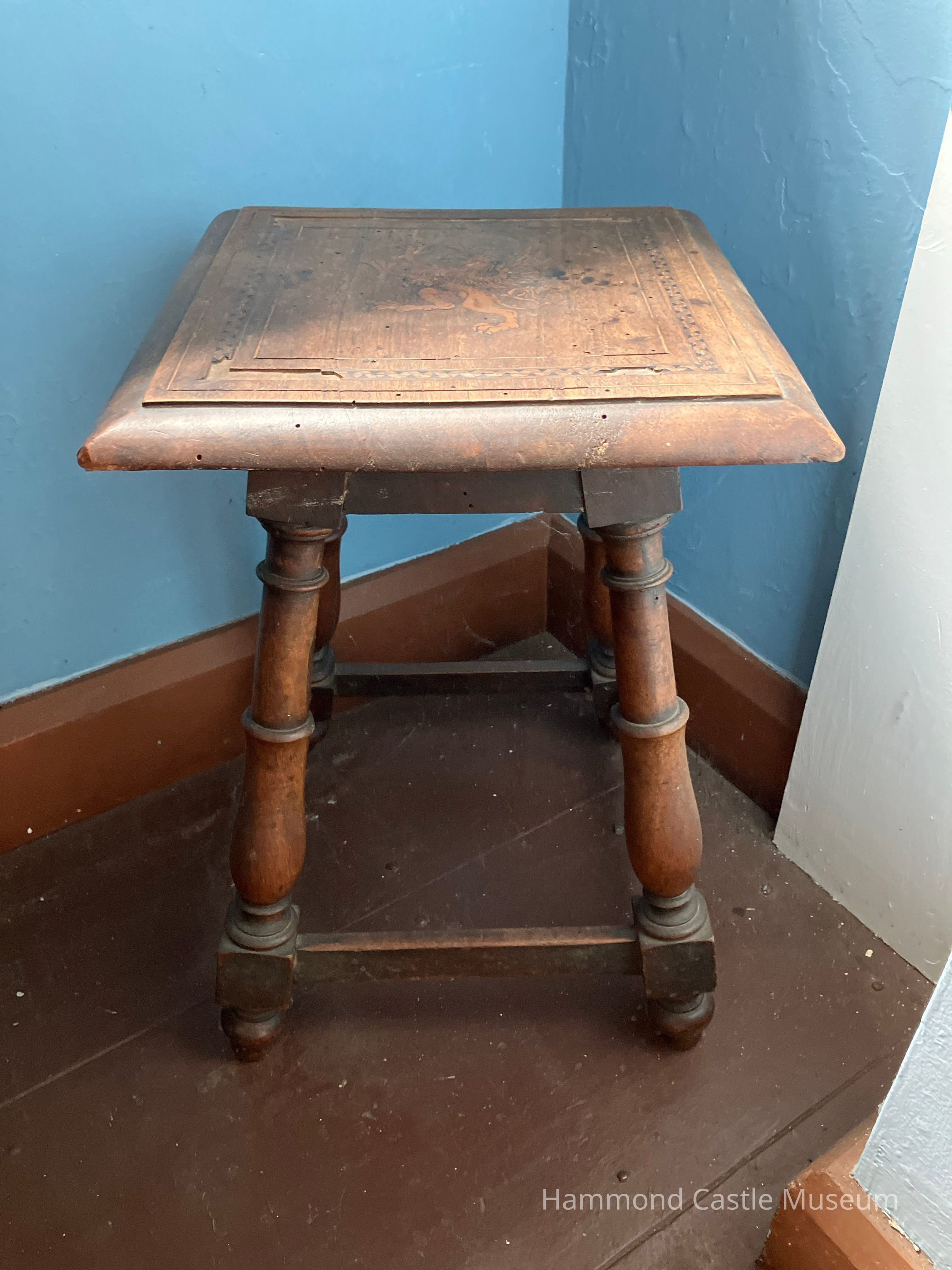 17th c. Stool with Inlay Griffin Motif Joint stool, slight splay of legs with ball feet and turned legs. Rampant lion on top.
