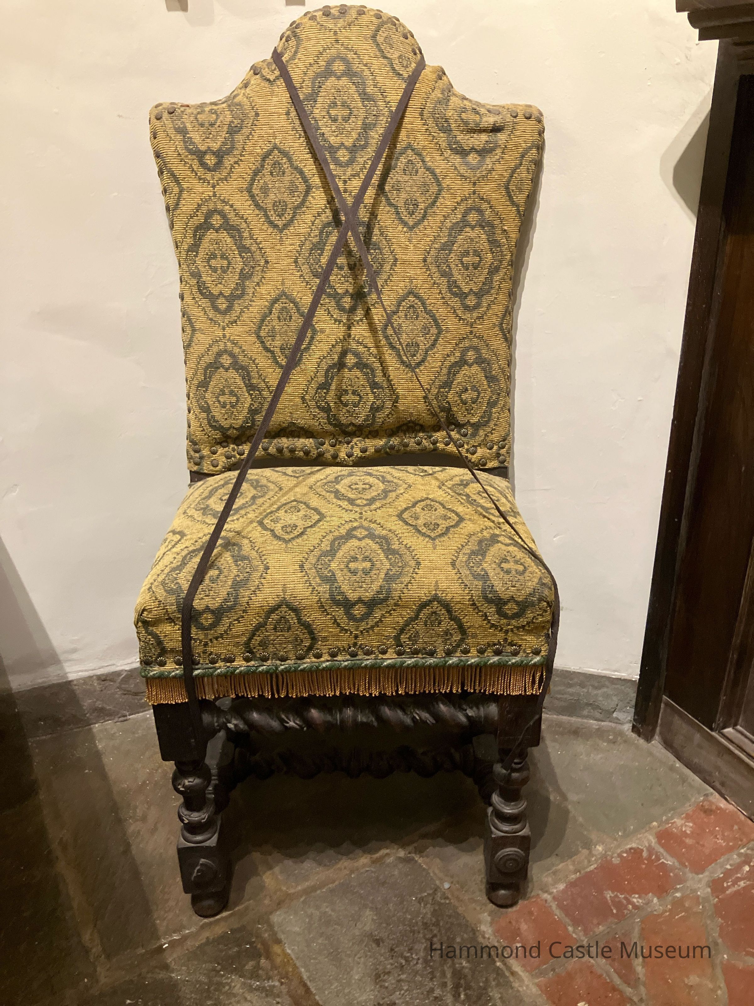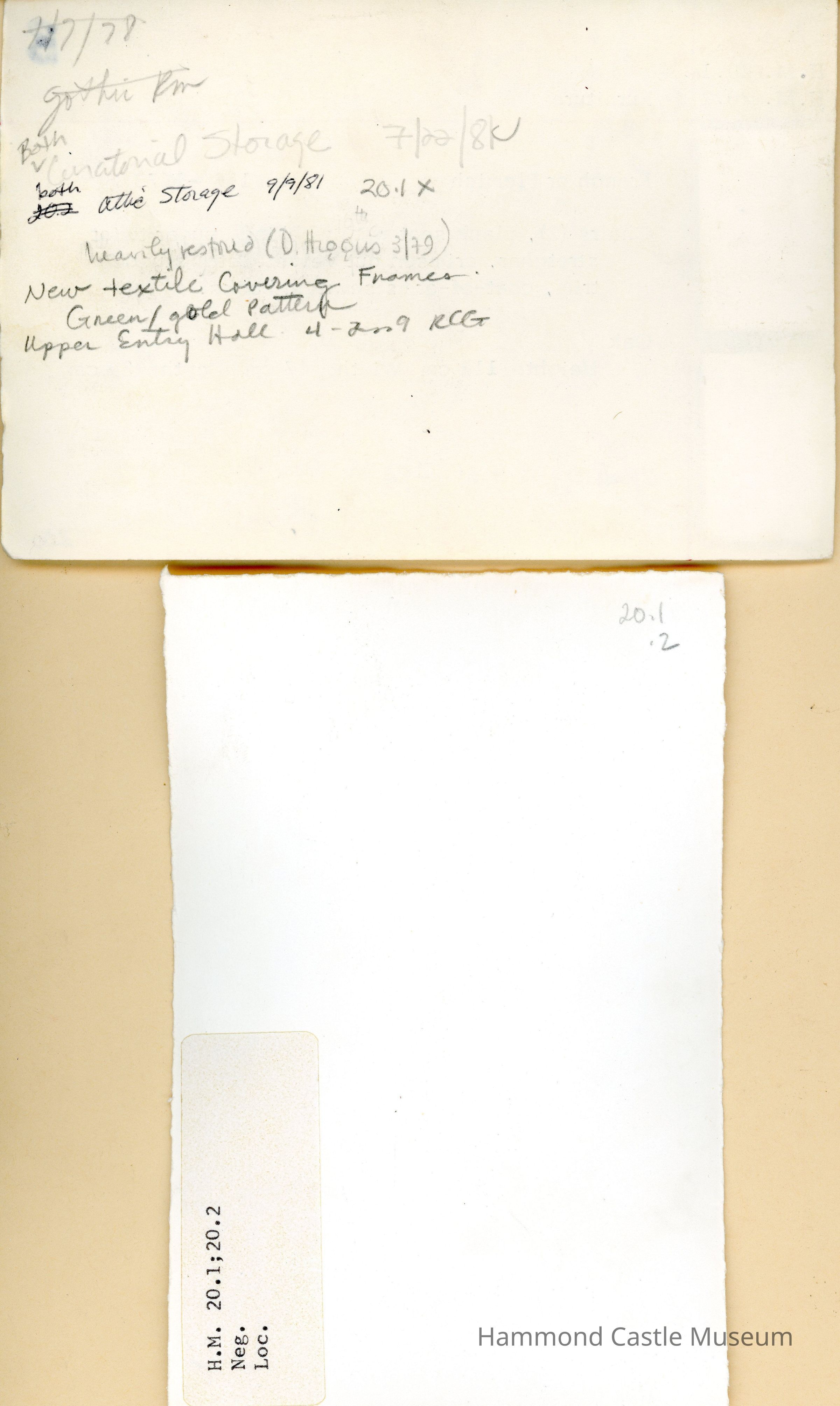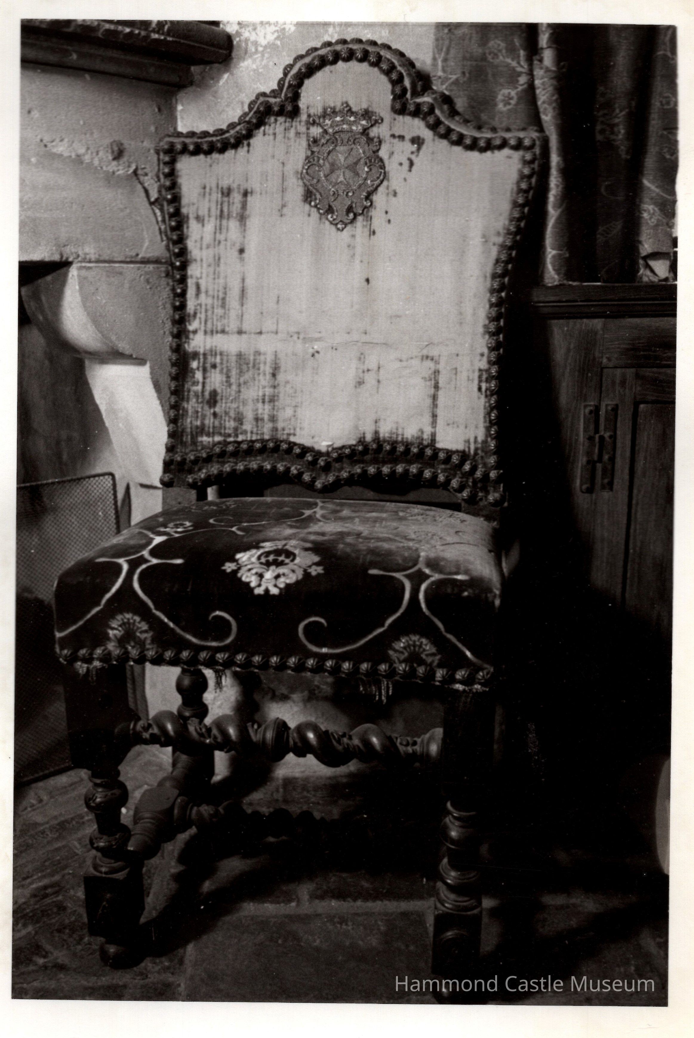 Reupholstered with gold material post Hammond at unknown date. Originally crimson velvet upholstery w metal studded trim, coat-of-arms sewn on back. Original Upholstery is H.M.203.1-.2.Collection