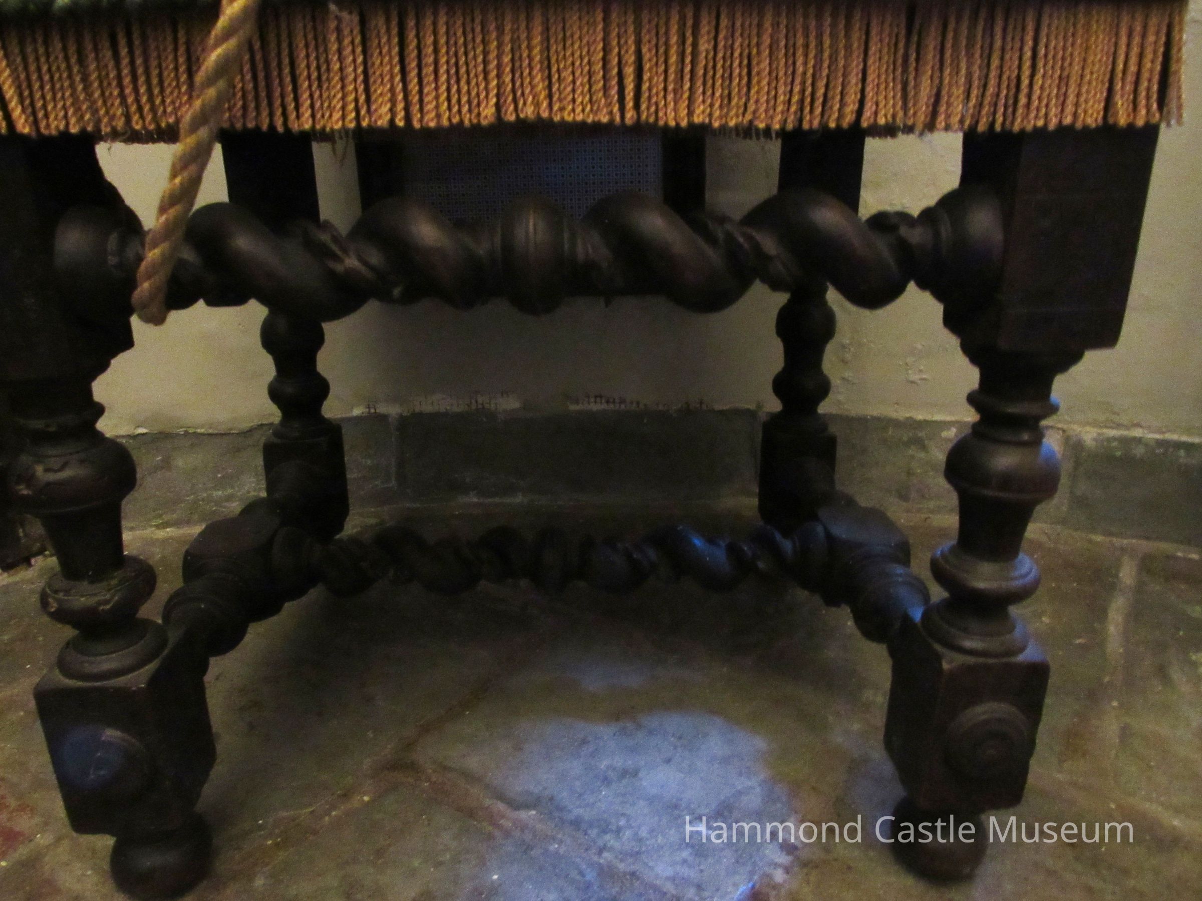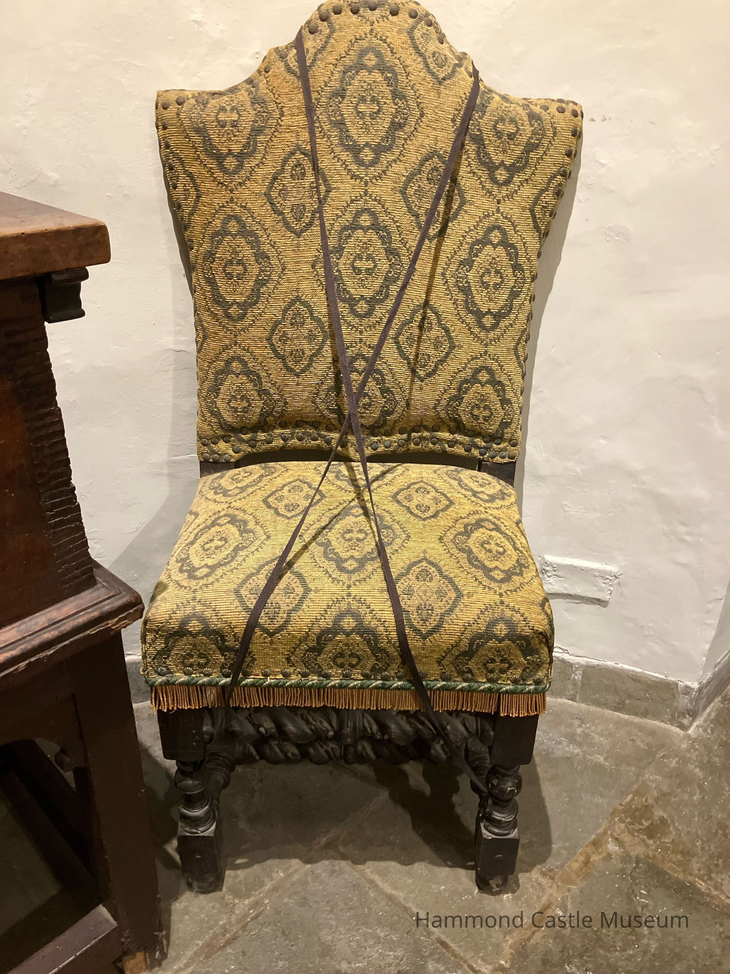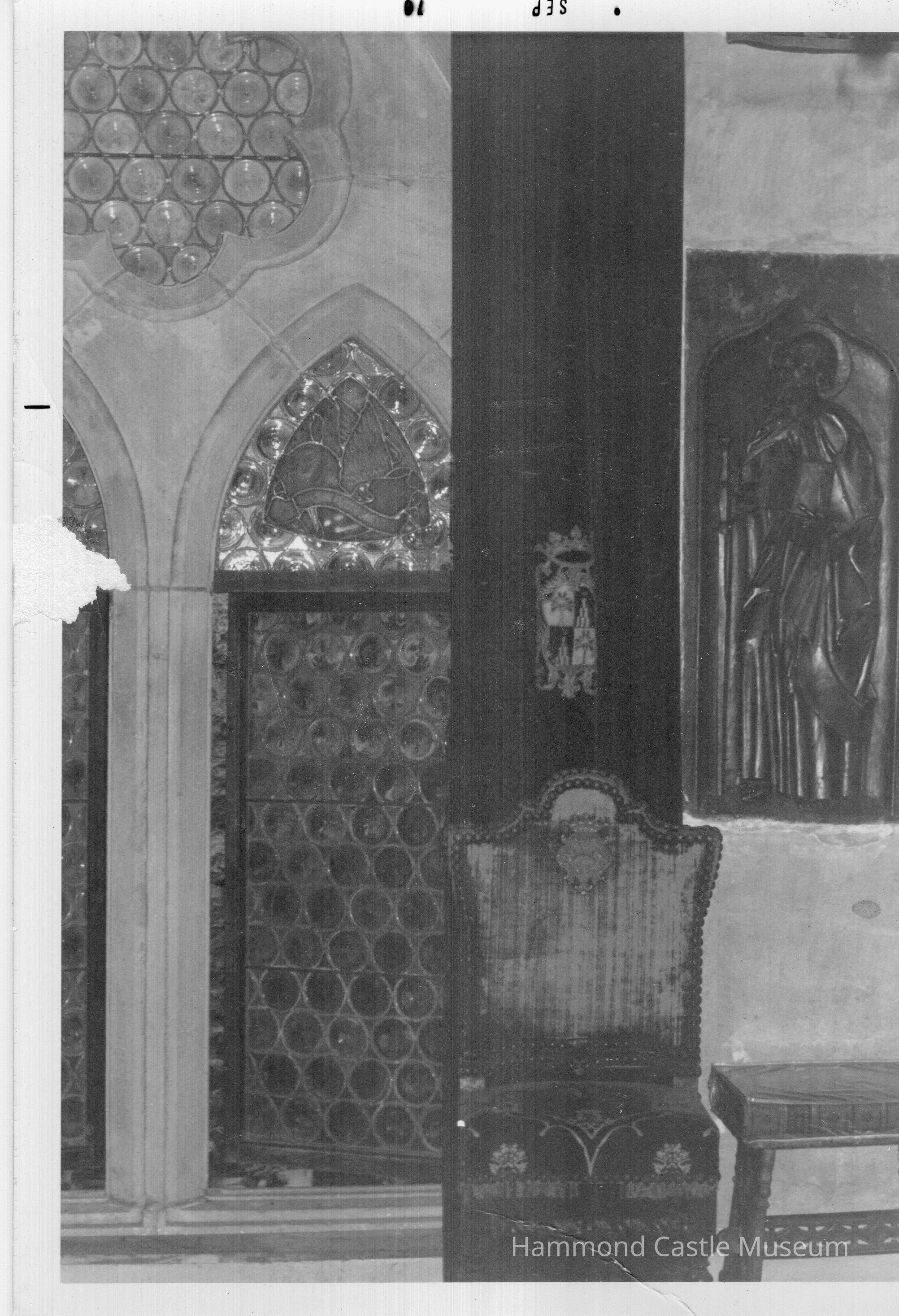Reupholstered with gold material post Hammond at unknown date. Originally crimson velvet upholstery w metal studded trim, coat-of-arms sewn on back. Original Upholstery is H.M.203.1-.2.Collection
