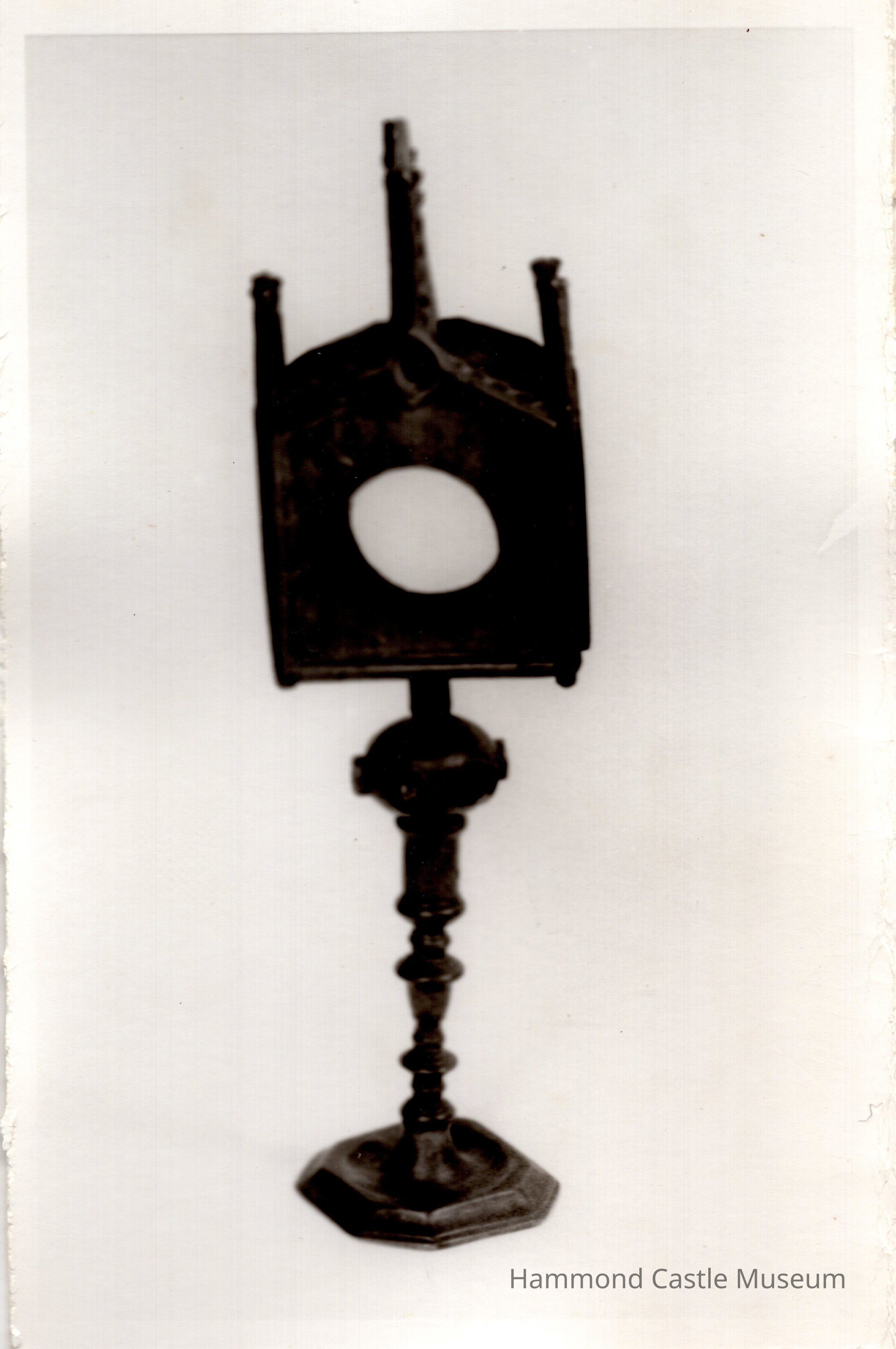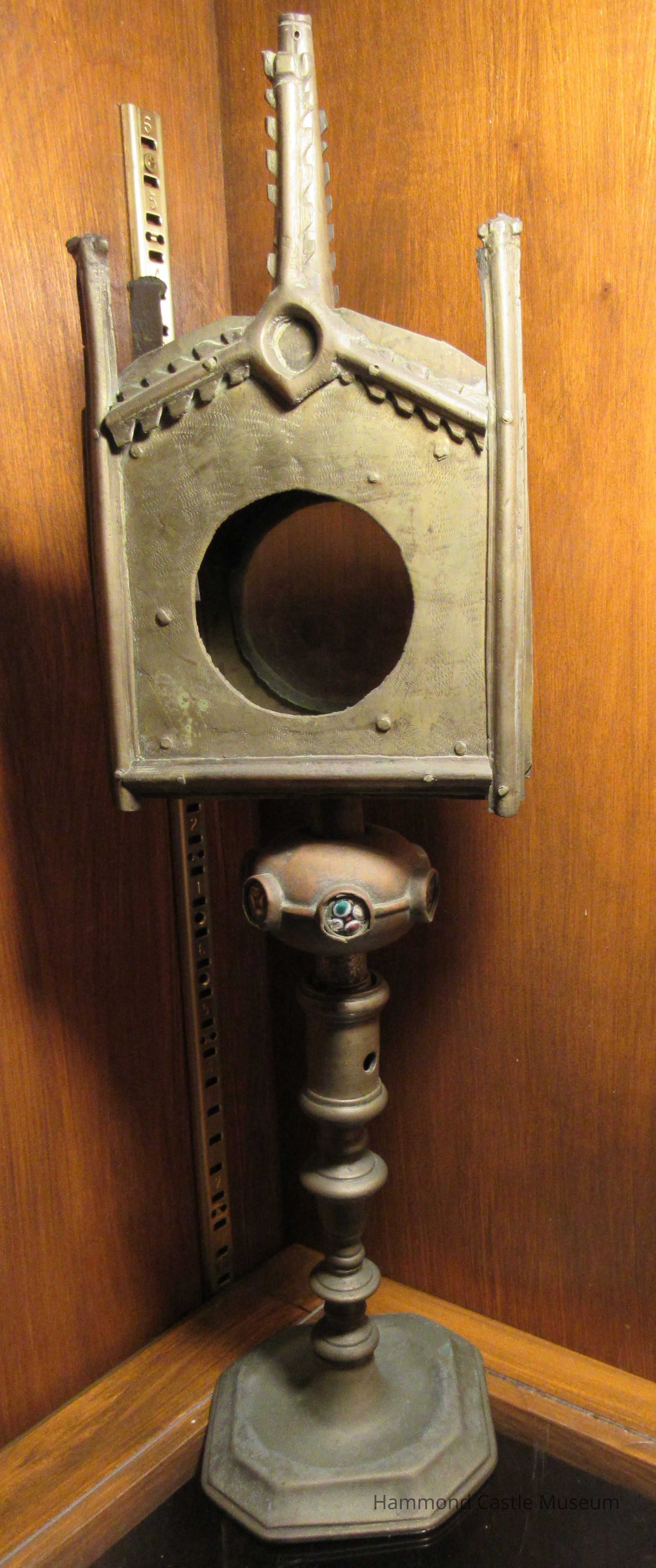 Monstrance for holding a sacred relic 17thc copy of a 12thc piece from the Pyrenees enamel insets on knop; three missing, 3 in place.