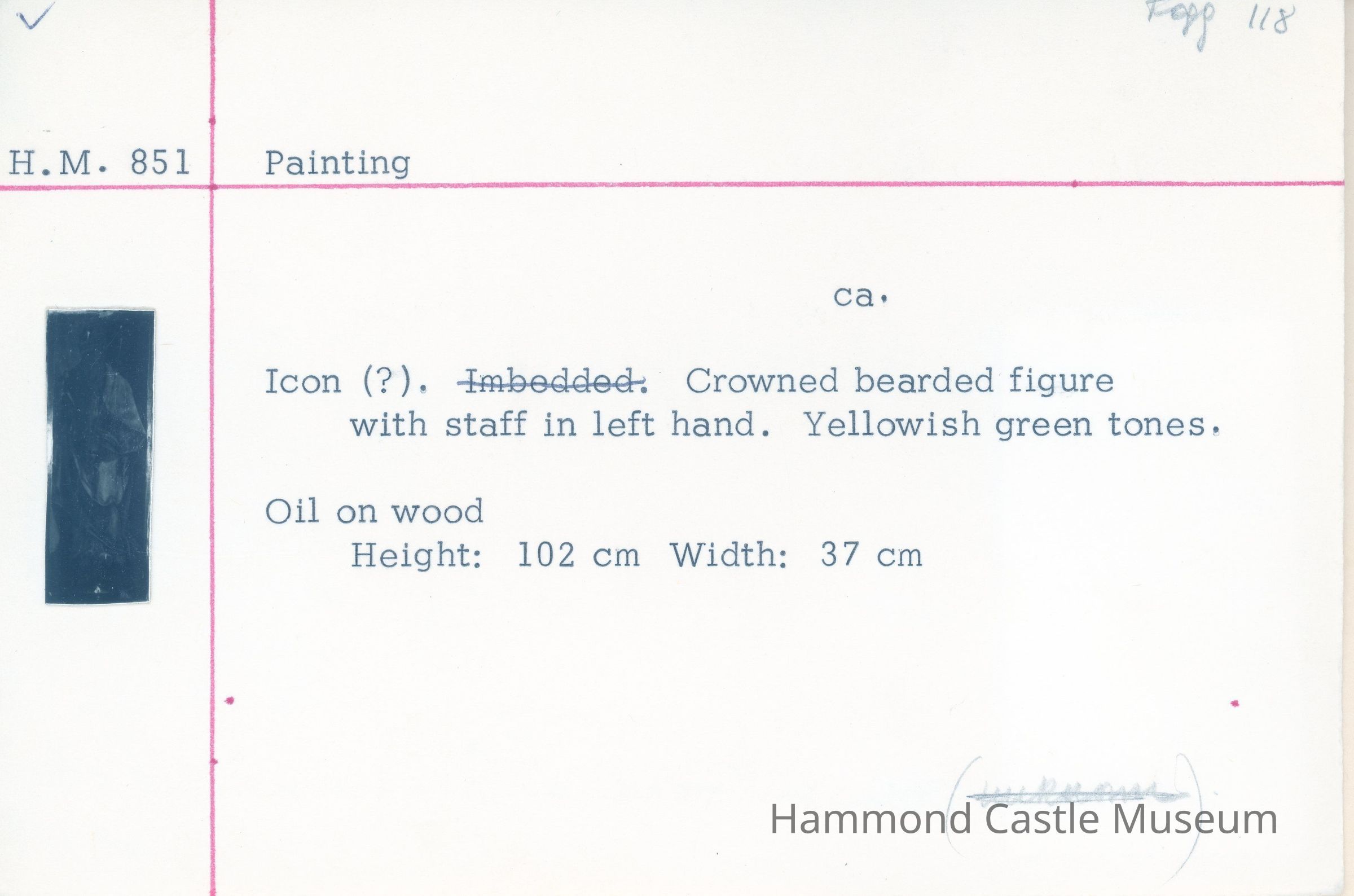 Crowned bearded figure with staff in left hand and wearing Pope crown. Yellowish green tones.