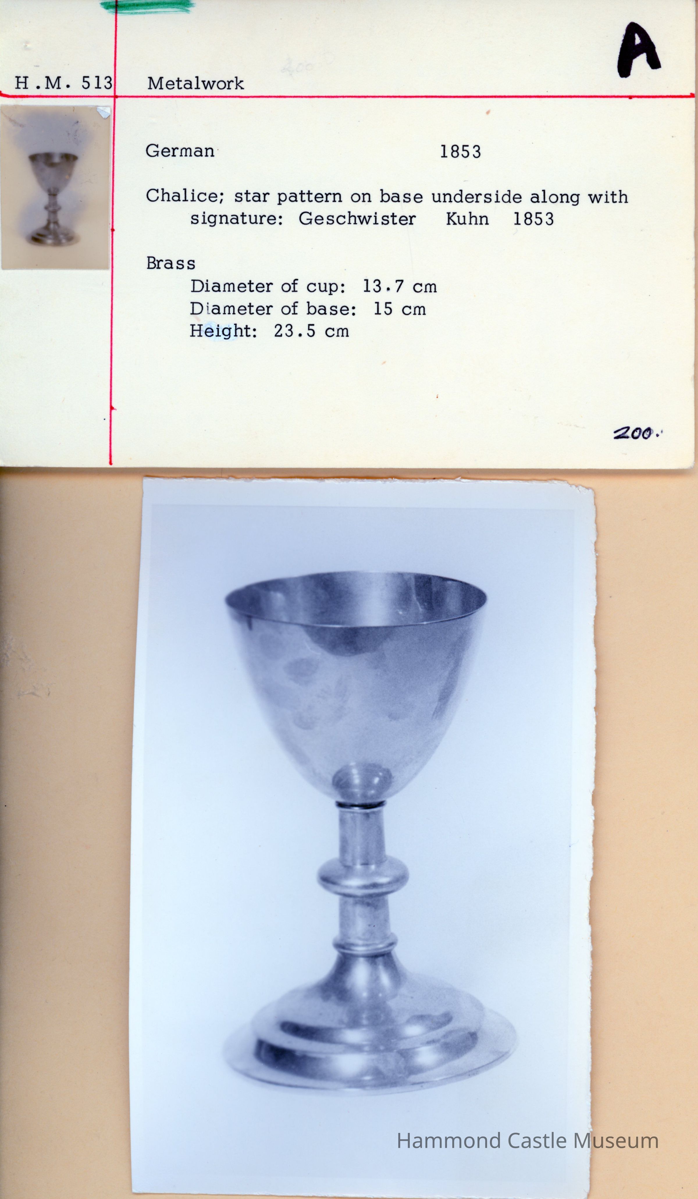 German Brass Chalice; star pattern on base underside along with signature; Geschwister Kuhn 1853.