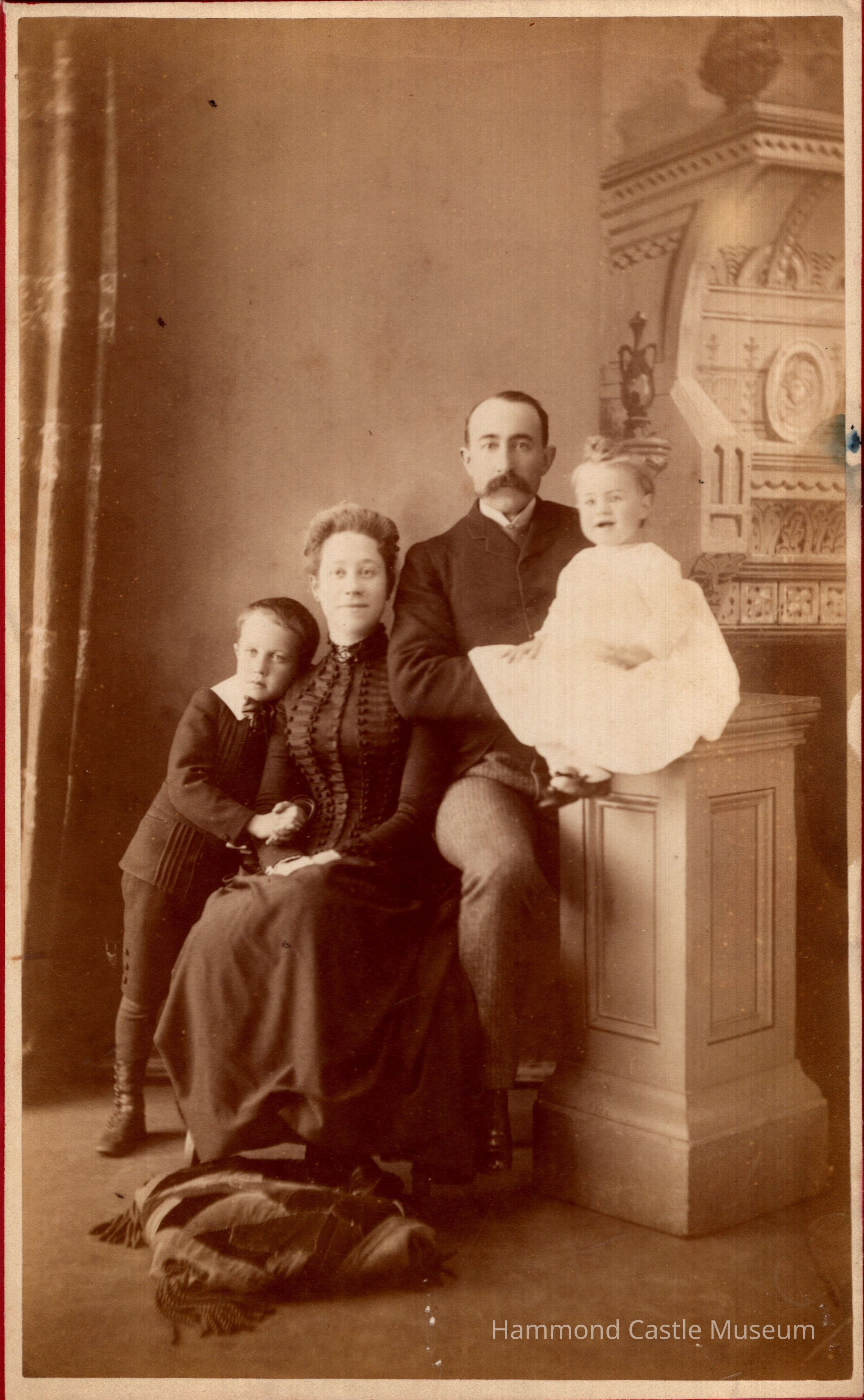 Photo of Hammond family ca 1889, From L-R Harris, Natalie Harris Hammond, JHHSr & JHHJr Thors Instantaneous Photographs image