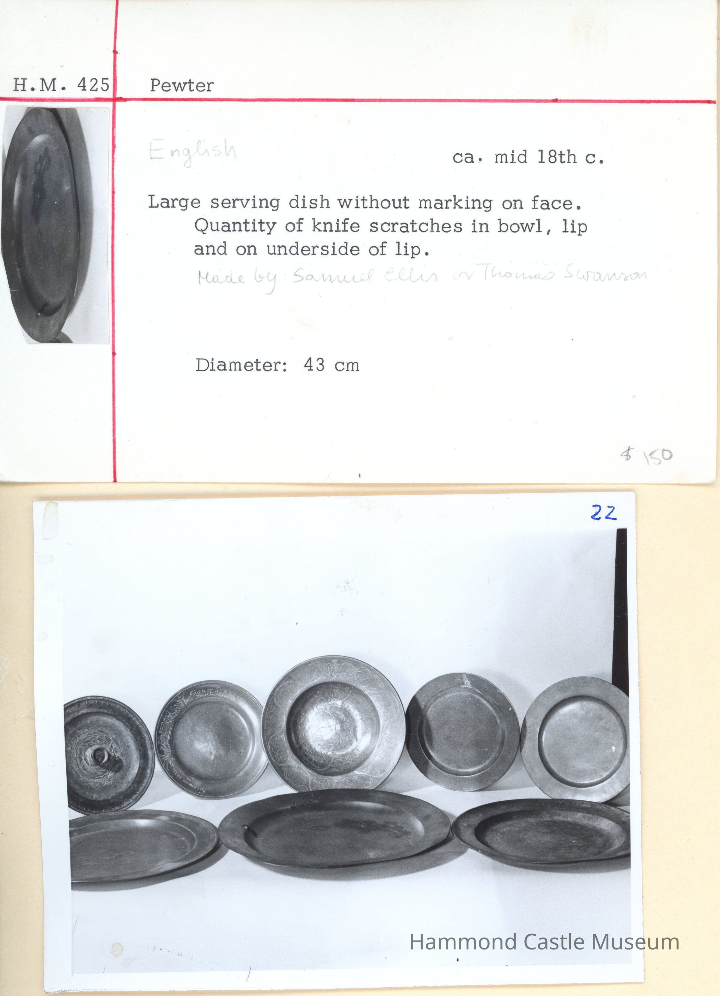 English Pewter Charger without marking on face. Quantity of knife scratches in bowl, lip and on underside of lip. Made by Samuel Ellis or Thomas Swanson.