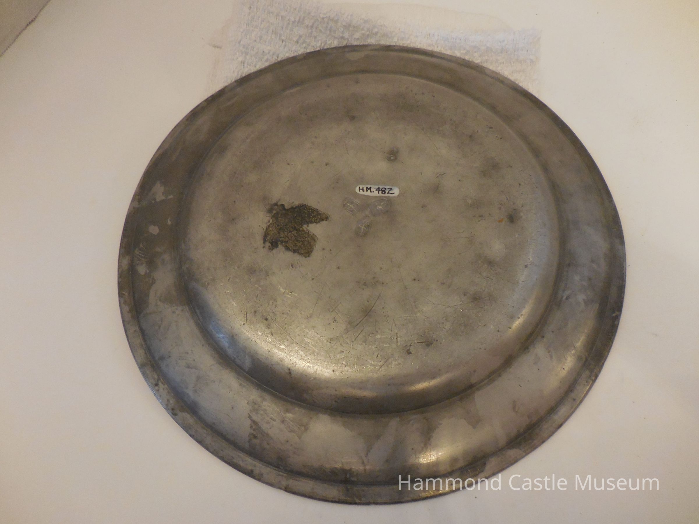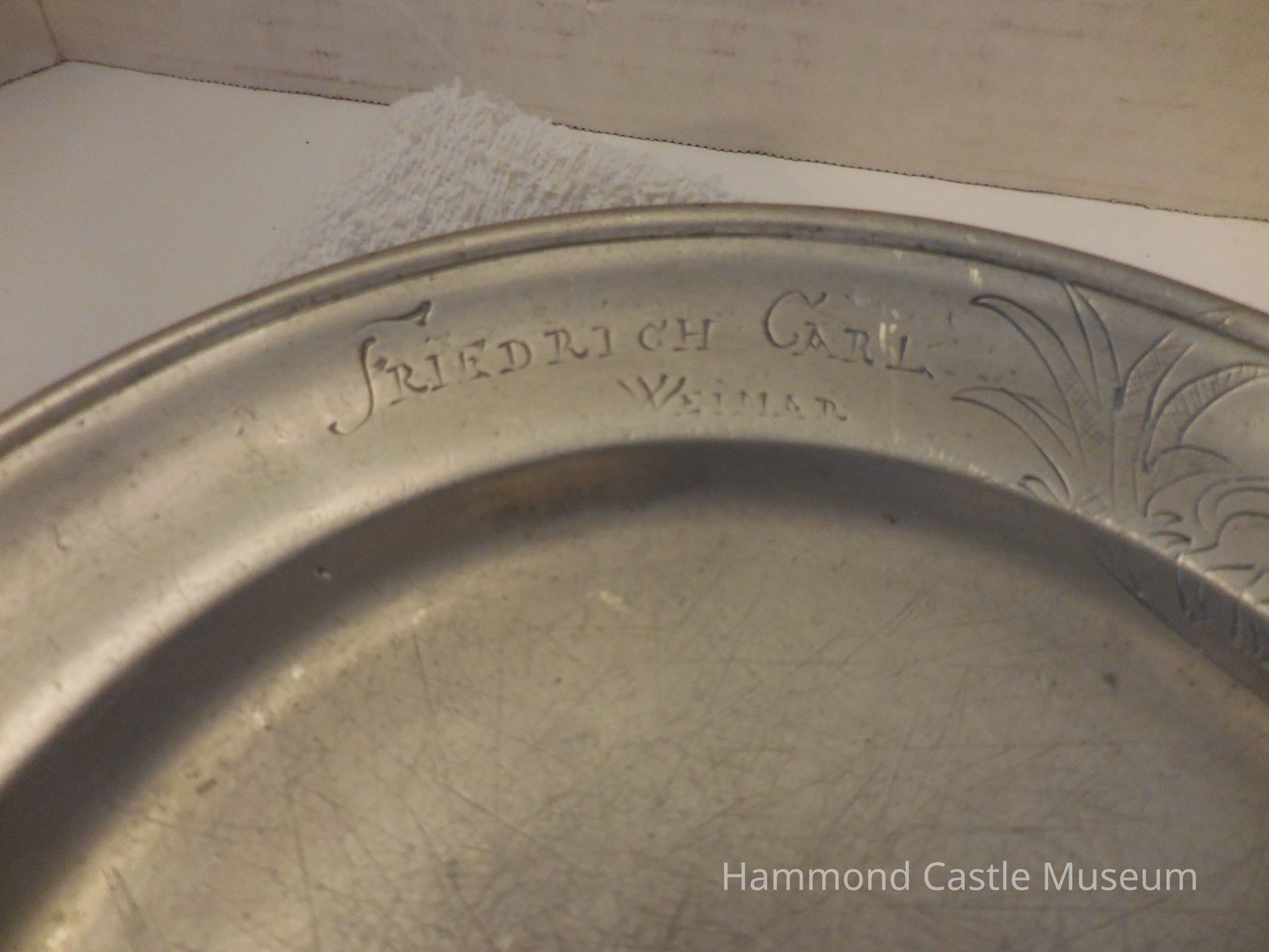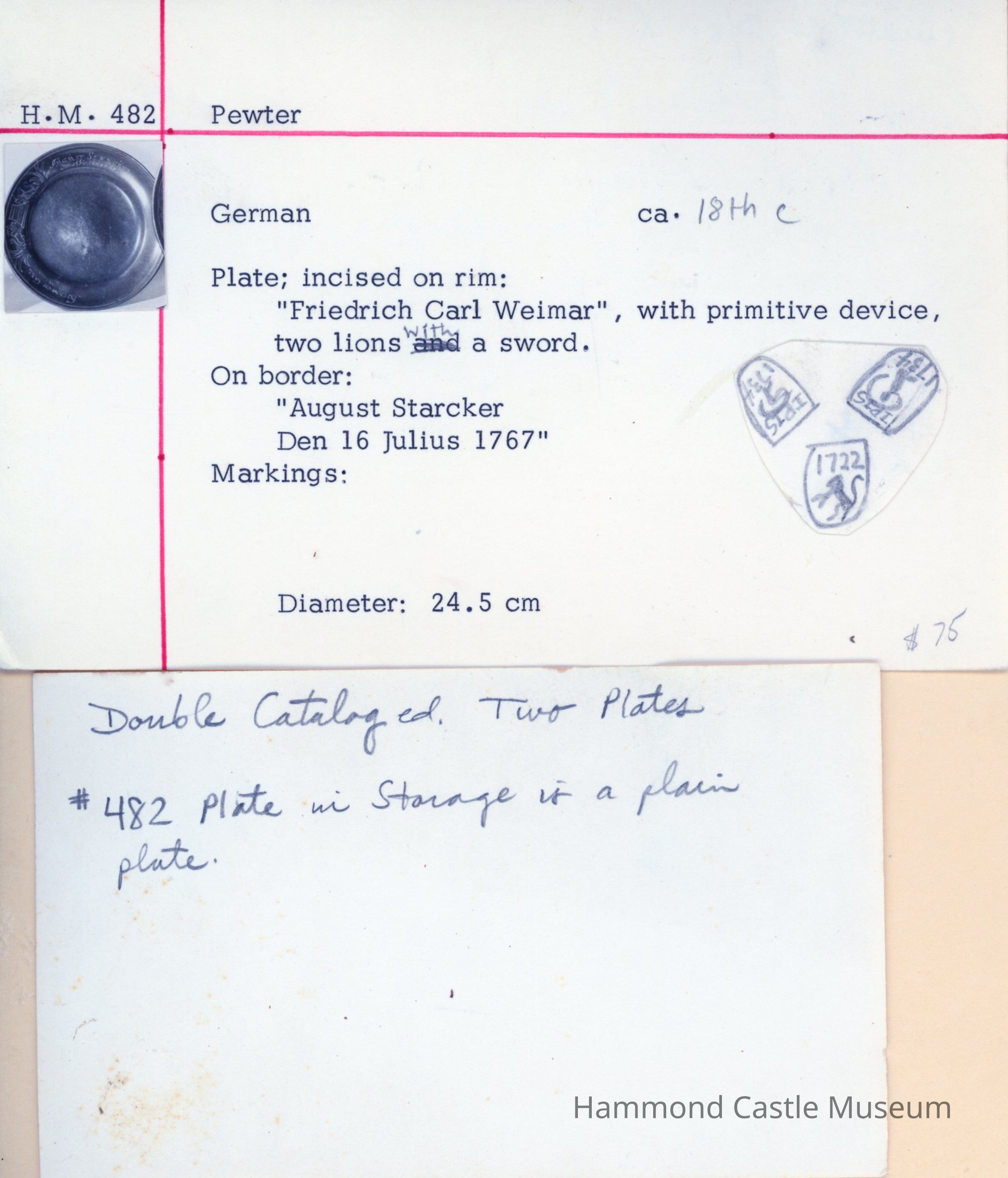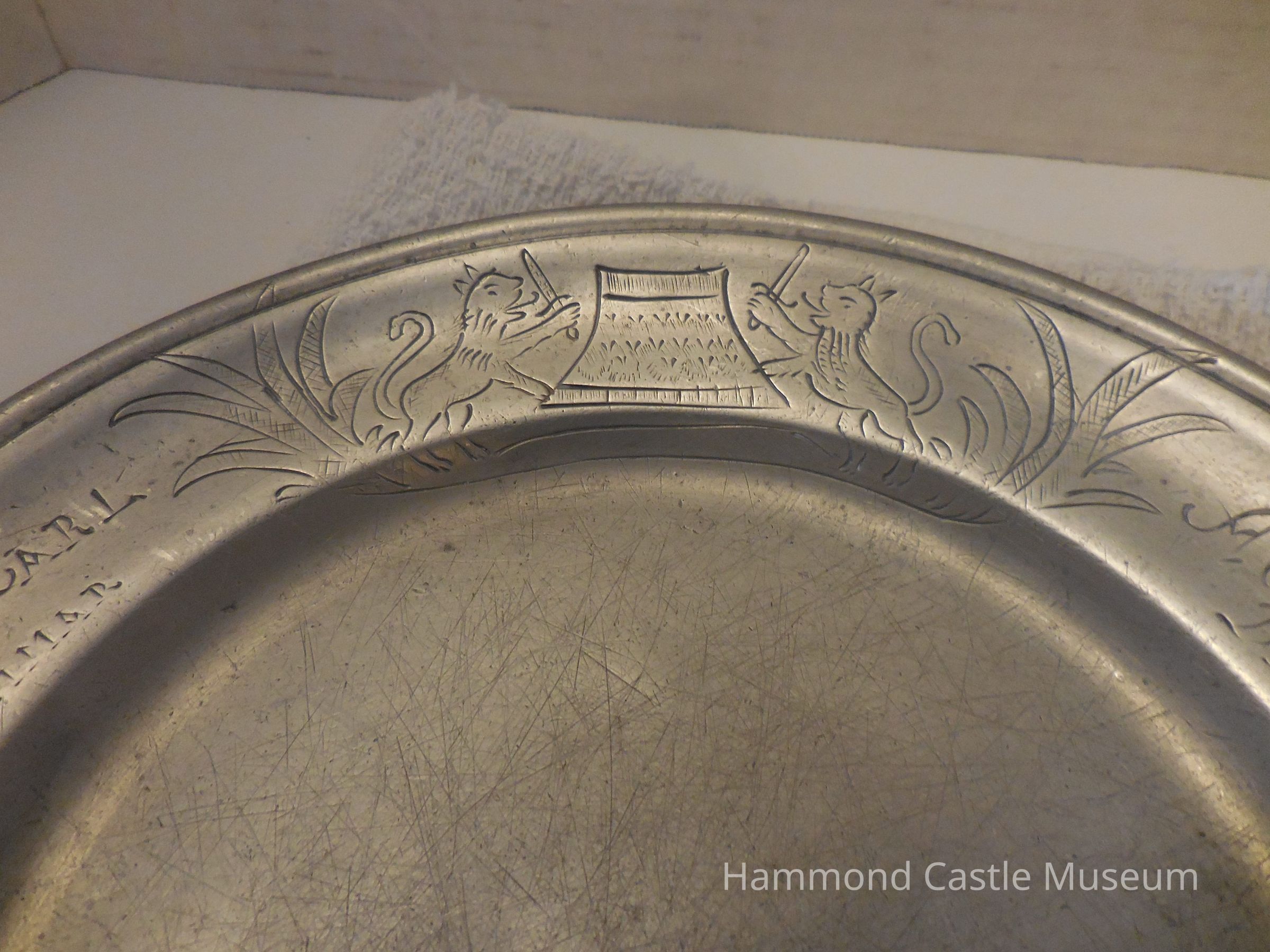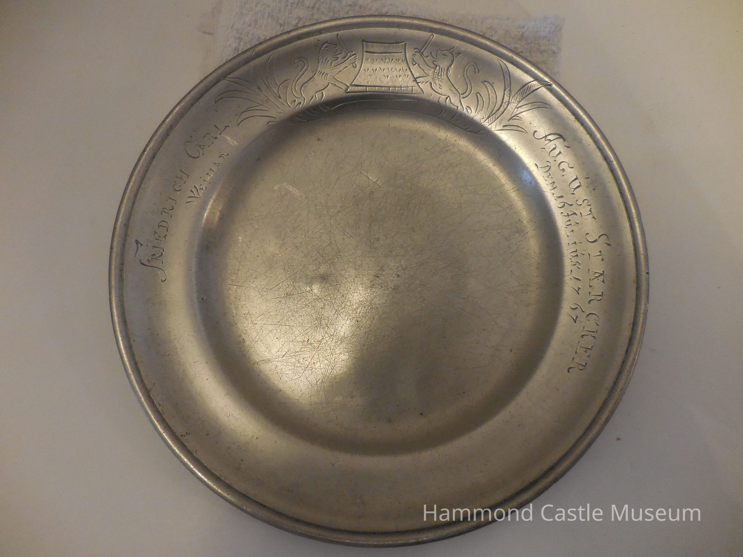 18th c. Pewter F. C. Weimer Charger - Plate Incised on rim: "Friedrich Carl Weimar", with primitive device, two lions with a sword. On border: "August Starcker Den 16 Julis 1767". Markings: see catalogue card. German, circa 18th century
