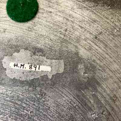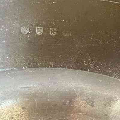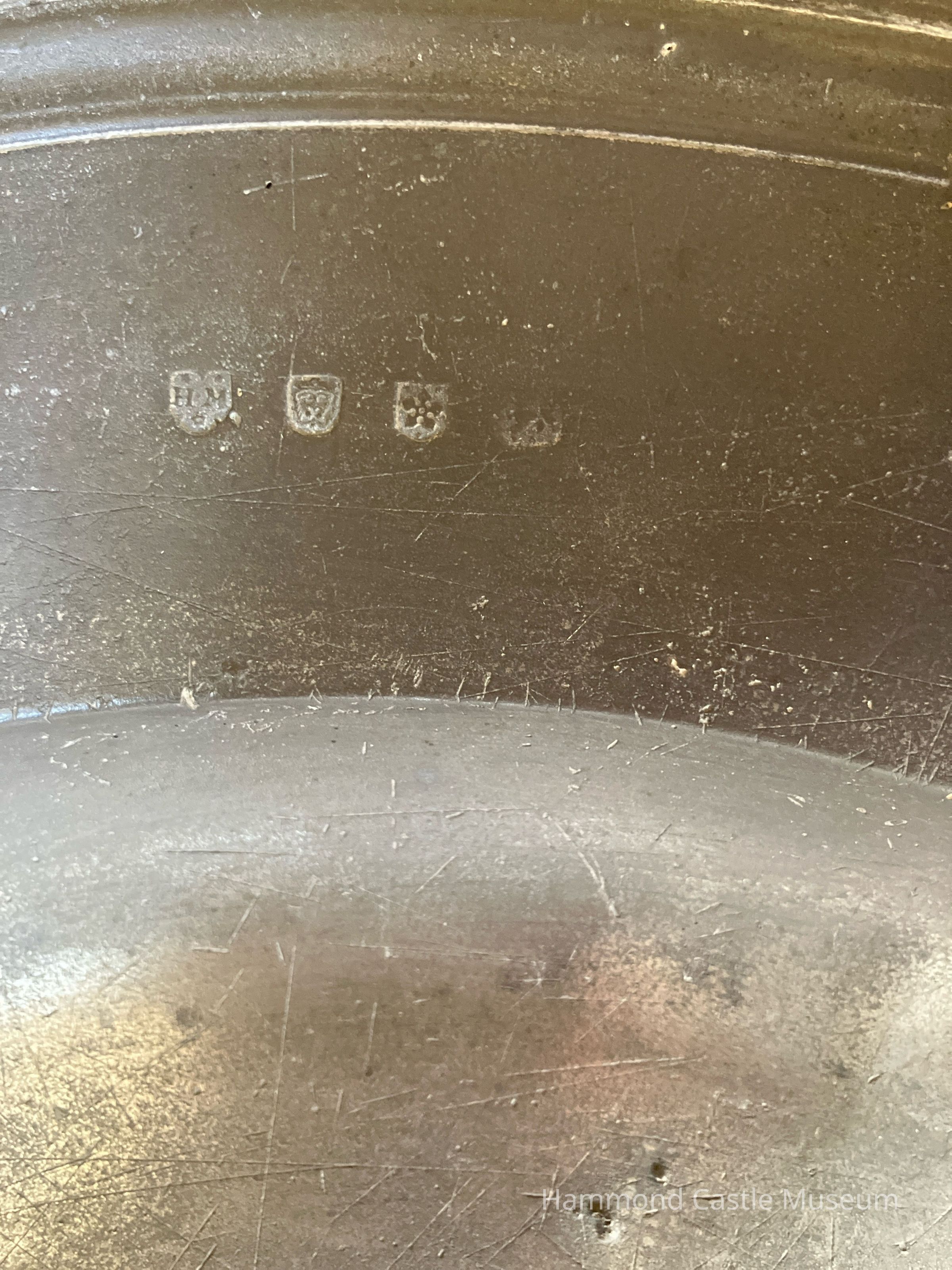 This charger has a multiple-reeded rim, and the hallmarks “H.M.”, a crowned leopard’s face and cinquefoil, all of which identify the creator of the piece as Hugh Masham of London, whose working dates are 1709-1713. The owners’ initials are engraved on the rim. Like a modern monogram, the left initial is for the husband’s name, the middle initial is the couple’s last name, and the right one stands for the wife’s name.Collection