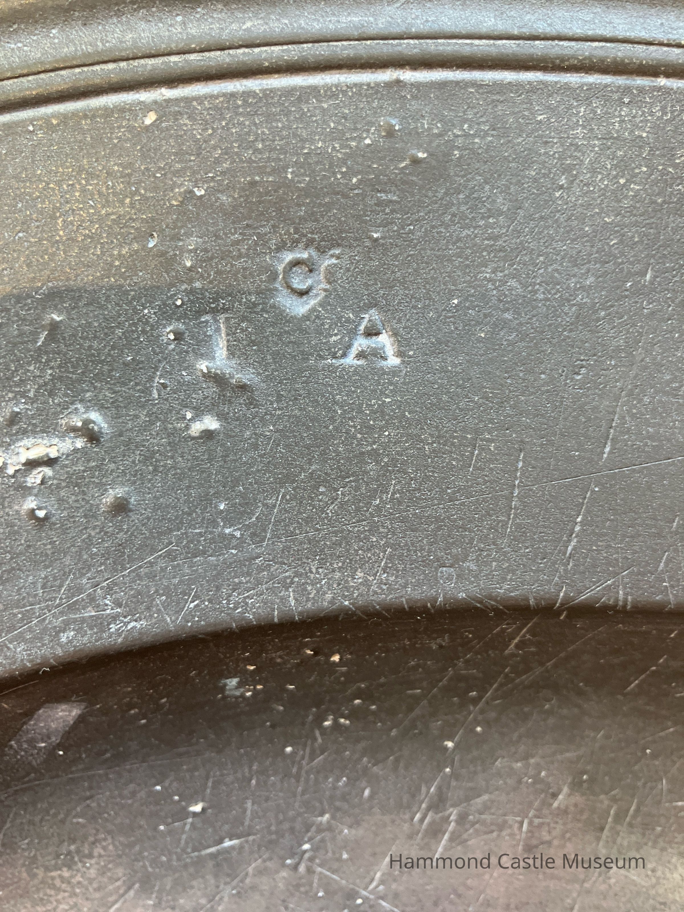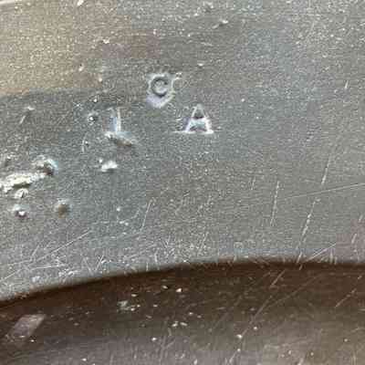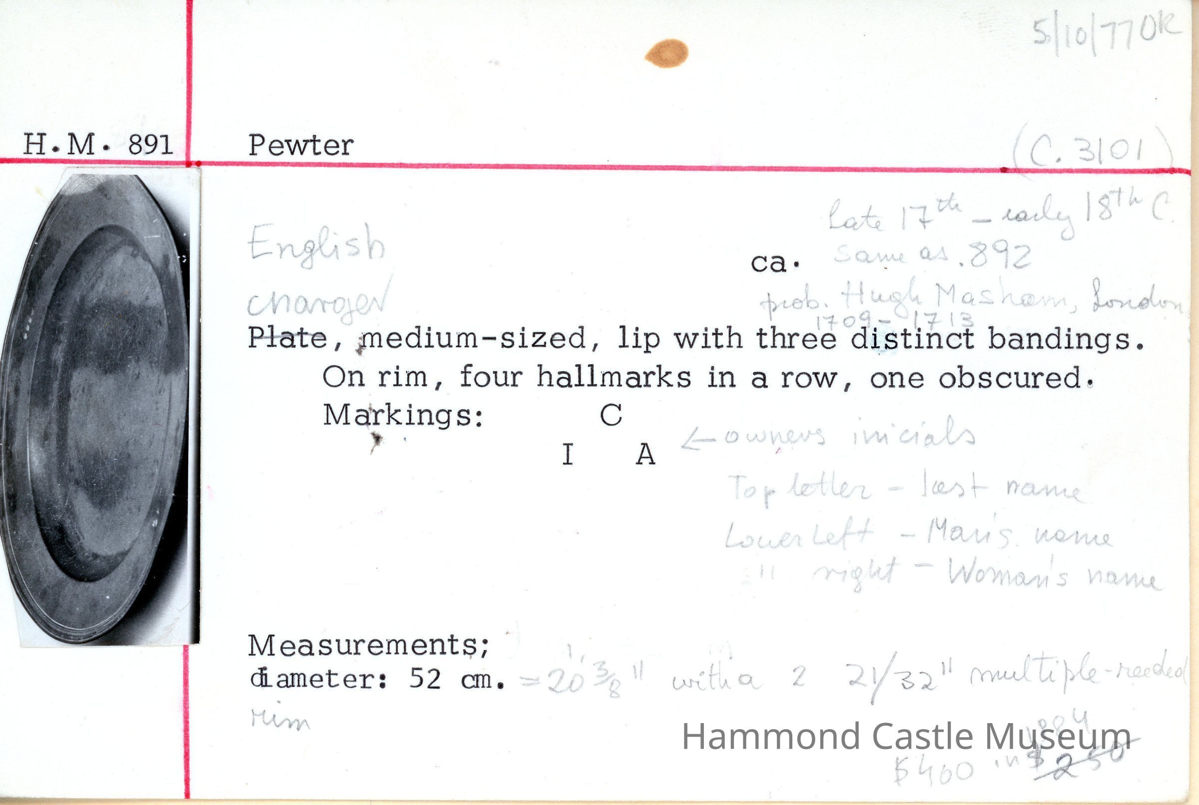 Pewter Charger, medium-sized, lip with three distinct bandings. On rim, four hallmarks in a row, one obscured. Markings: C I A (see catalogue card)
