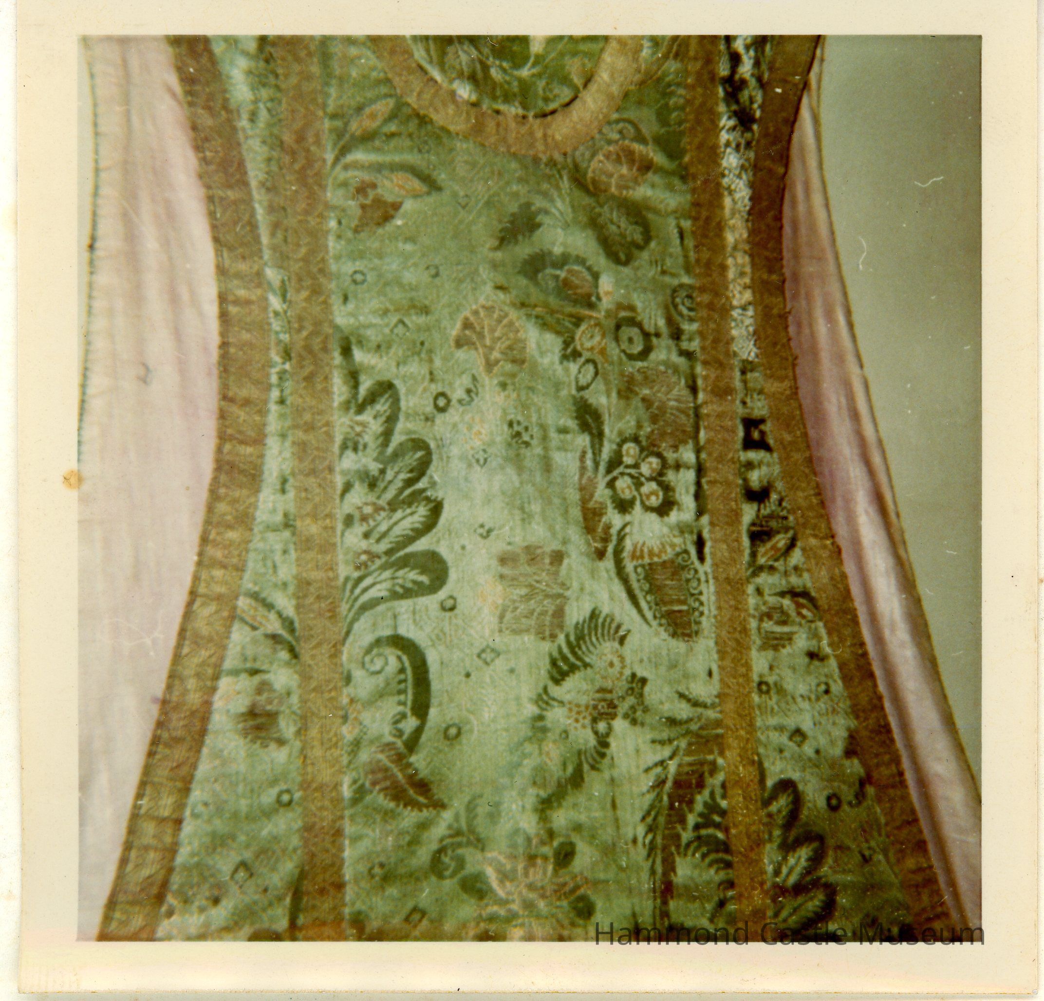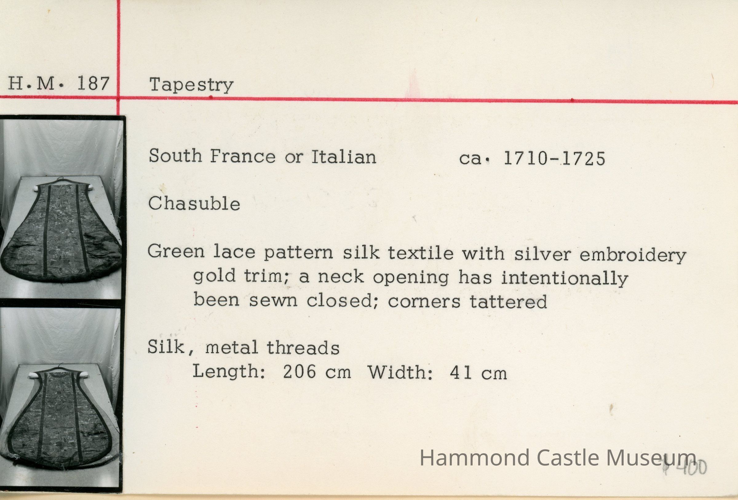 18thc French or Italian Chasuble Green lace pattern silk textile with silver embroidery gold trim; a neck opening has intentionally been sewn shut; corners tattered.
