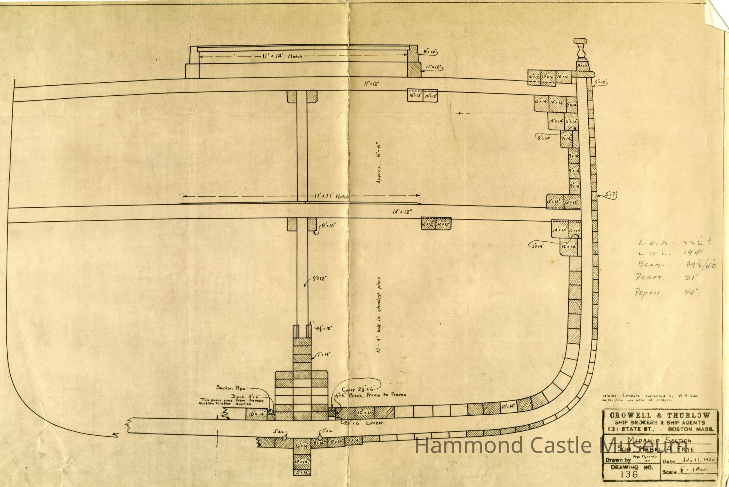 Copy of 1920 Schooner Mabel A Frye Plans - cutaway of haul Drawn by Crowell & Thurlow, Boston, Mass