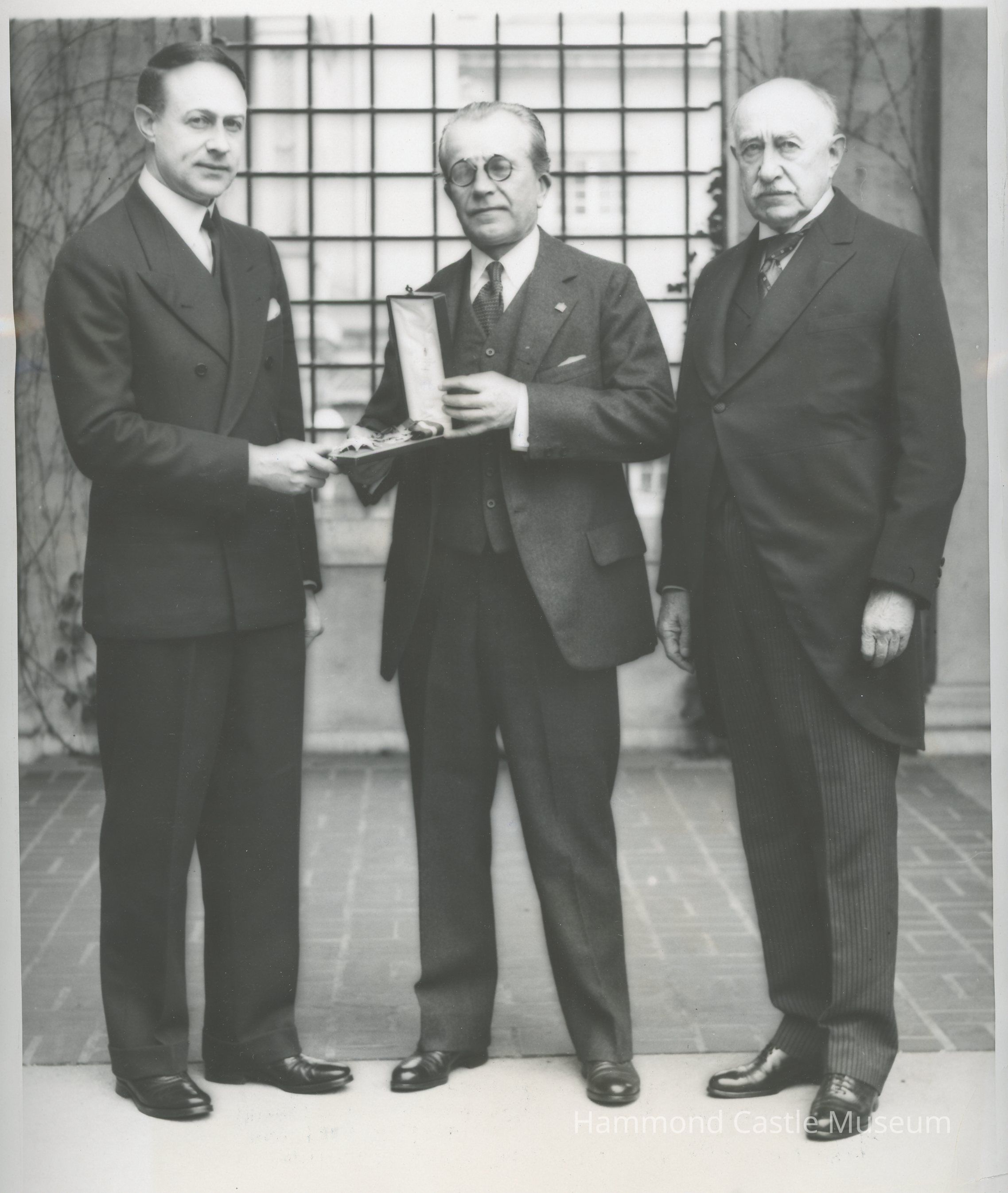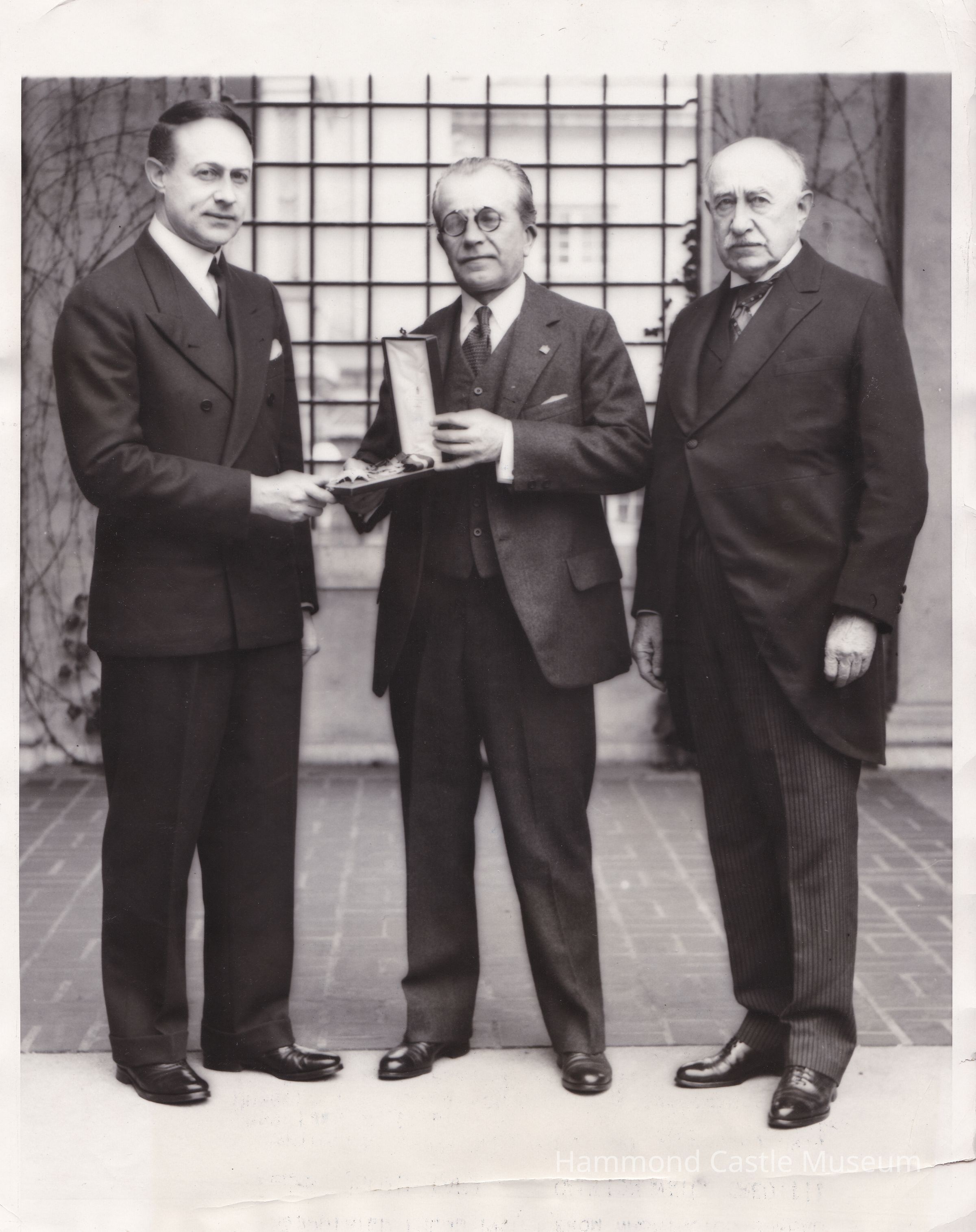 1929-03-25 JHH Jr (L), JHH Sr (R) & Ambassador De Martino with Italian award