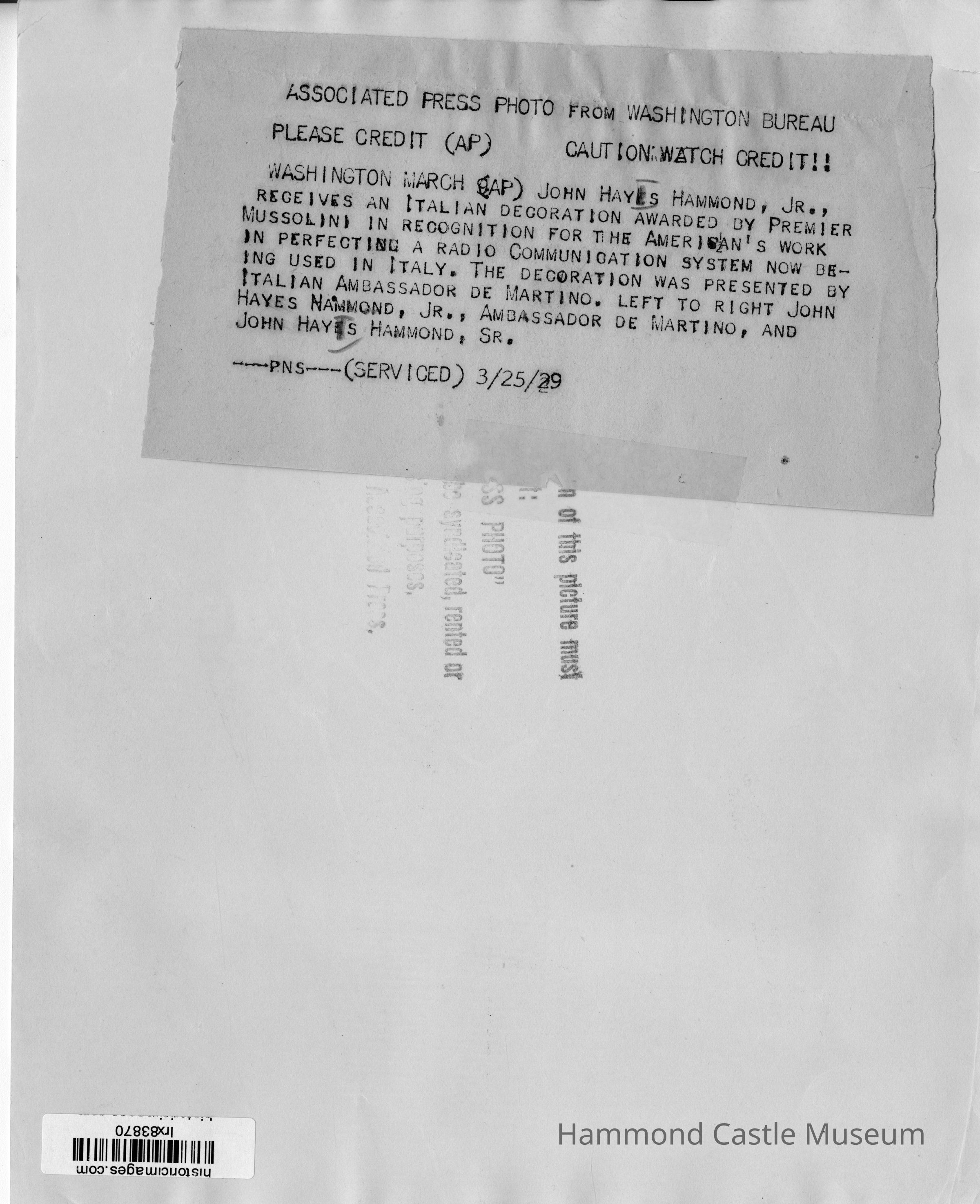2 copies of photo of Hammond (Jr & Sr) receiving award from Italian Ambassador De Martino Associated Press photo