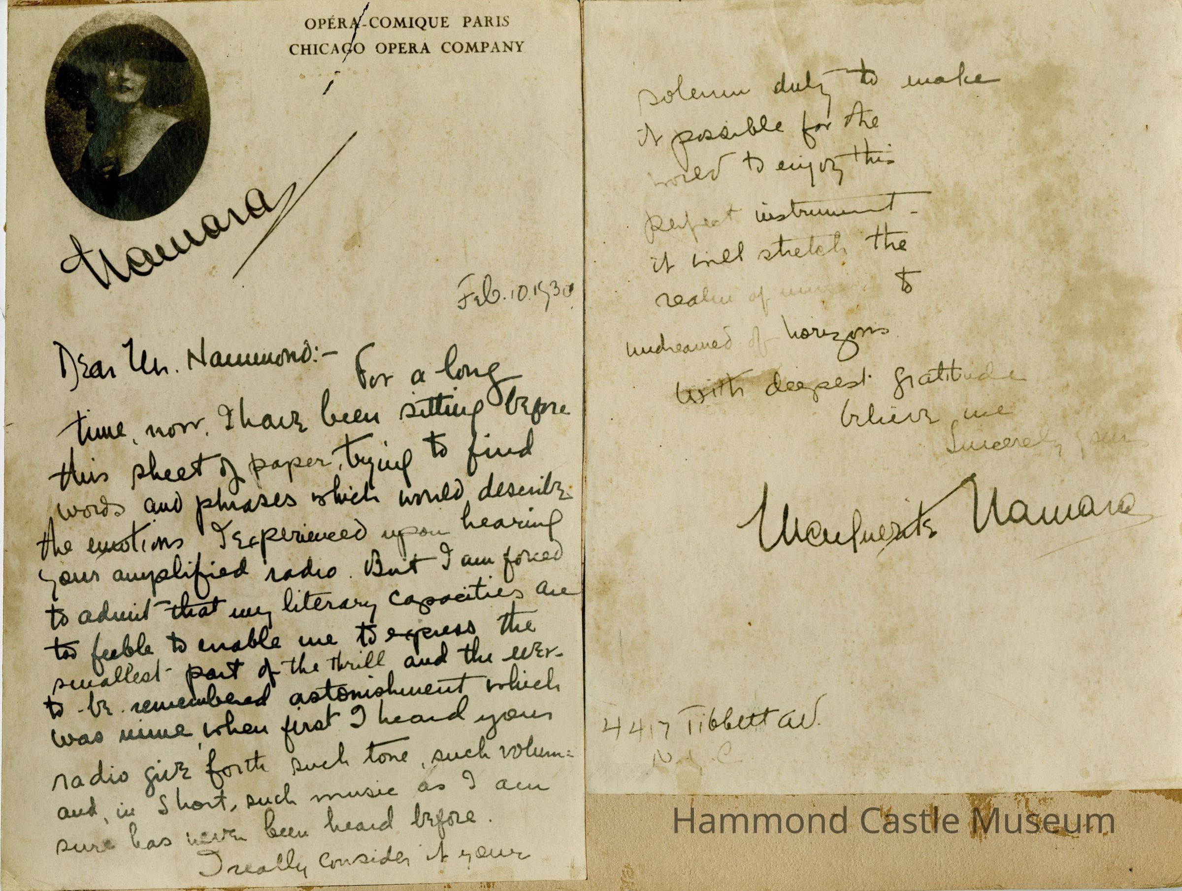 Reprint of letter to Hammond on Opera Comique Paris, Chicago, singer Marguerite Namara praising Hammond new radio