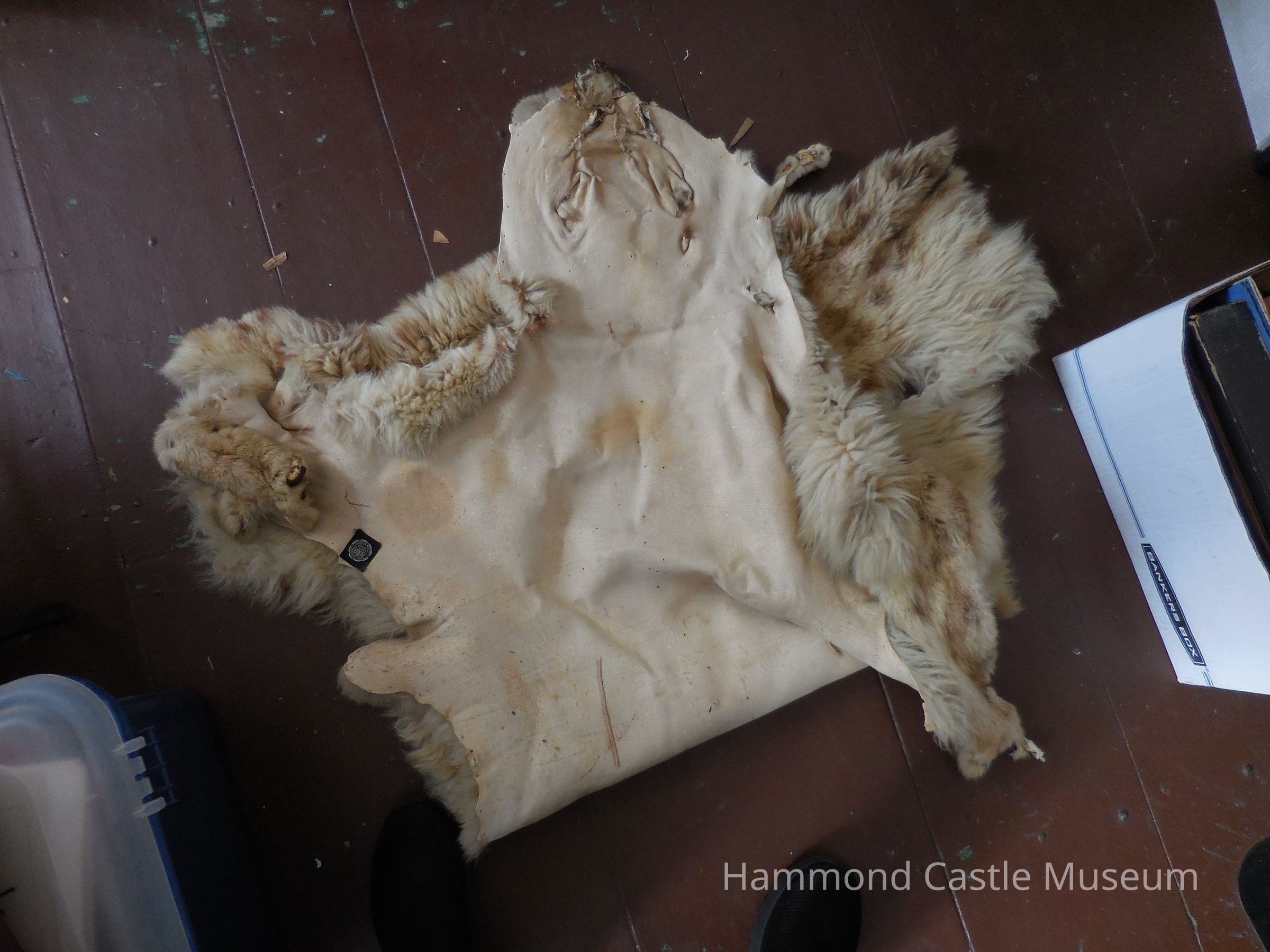 Snow Leopard skin used as throw on furniture. One of a number of animal skins used as rugs and throws throughout the castle and earlier at the bungalow. All except one snow leopard skin missing by 2023.