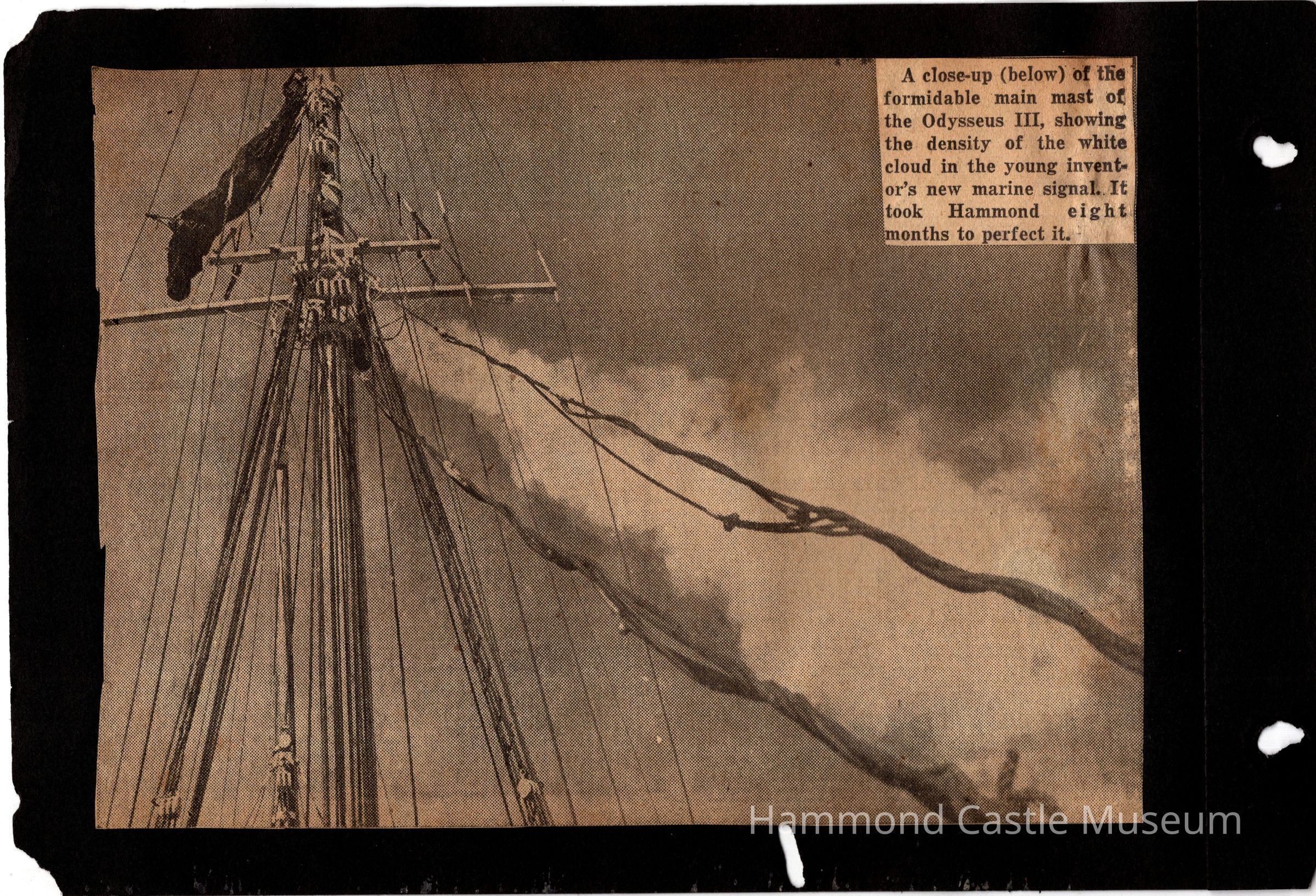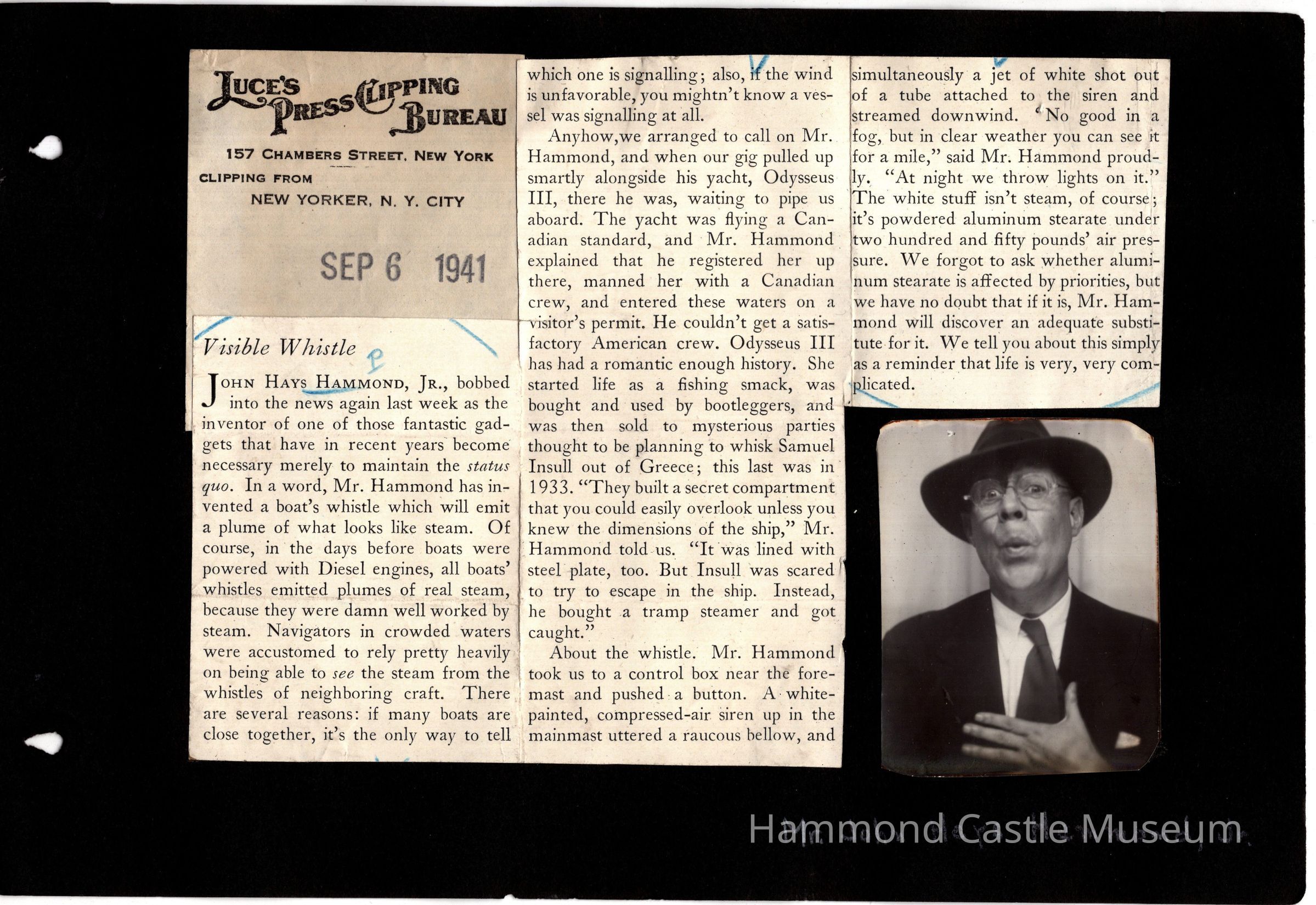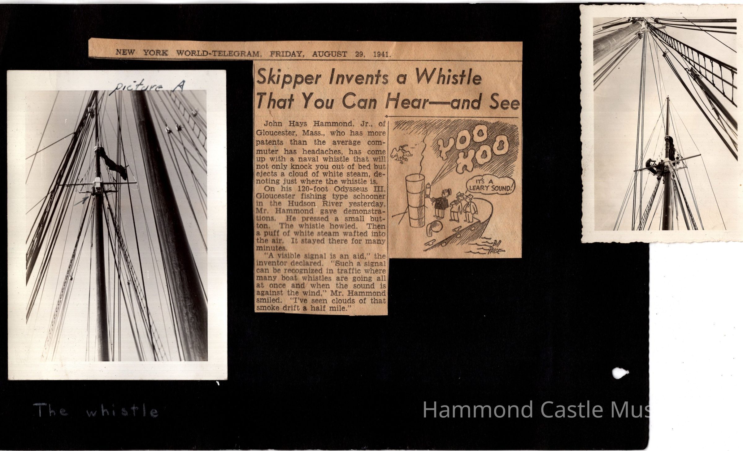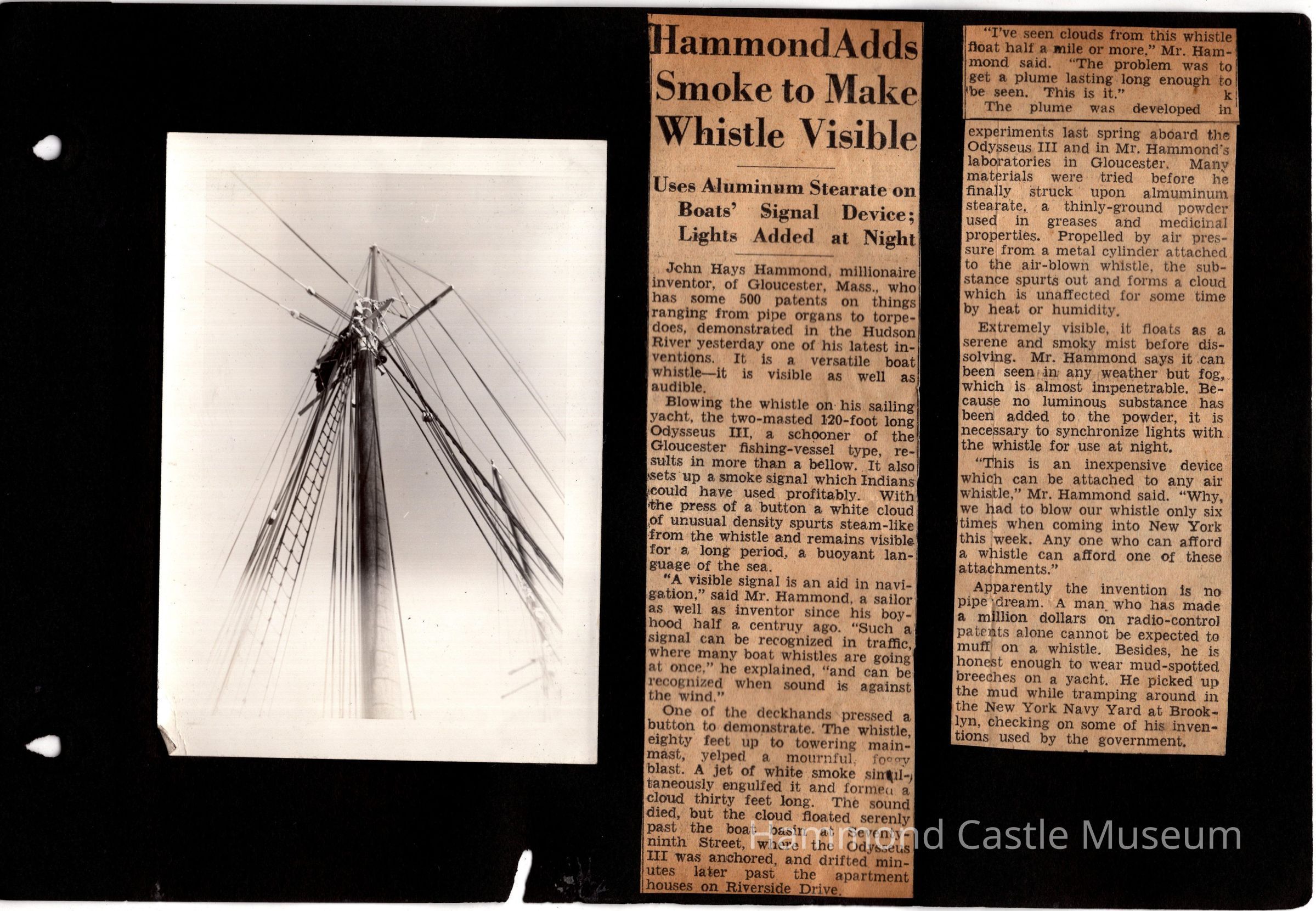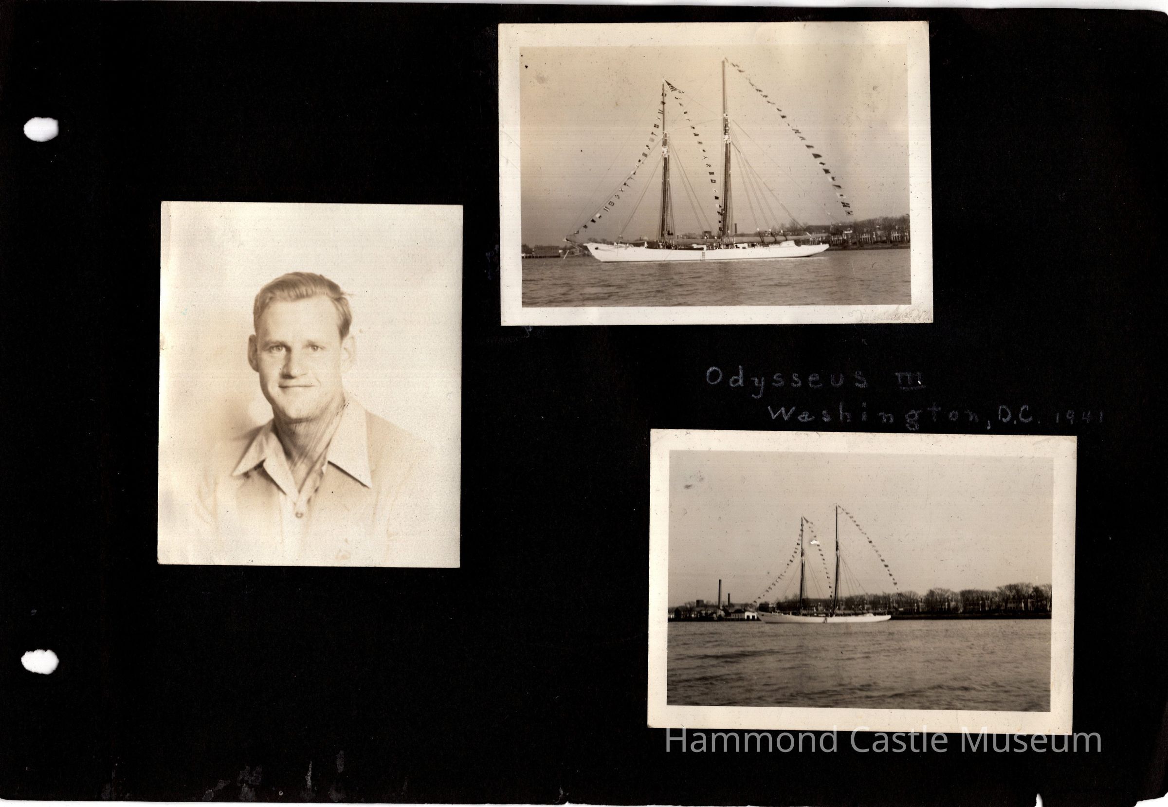 Scrapbook of Odysseus crew and sail to Washington DC kept by crew member, Albert Leslie Lundgren. Also includes news clippings of Hammond's "Visible Whistle," WWII weapons and obituaries.