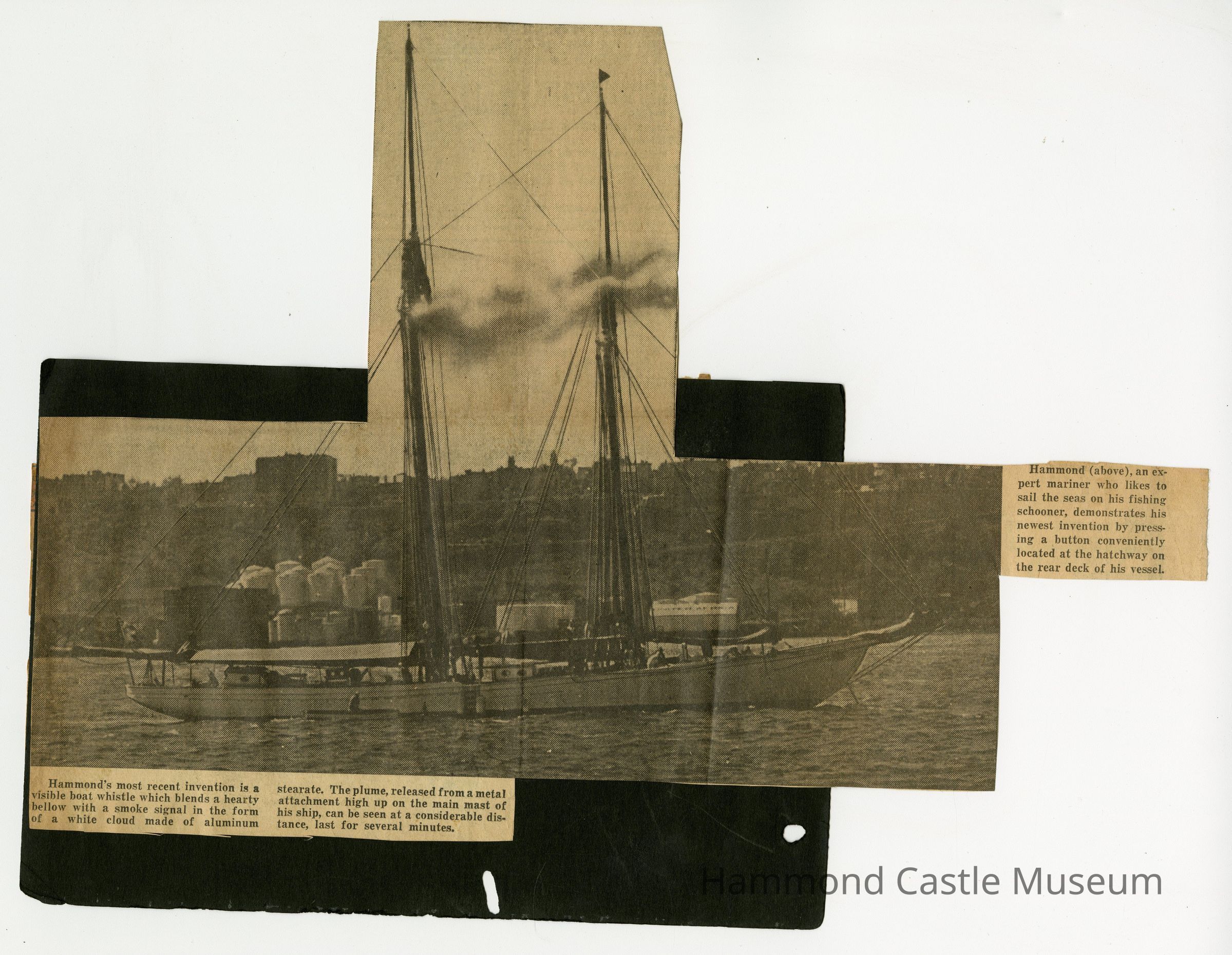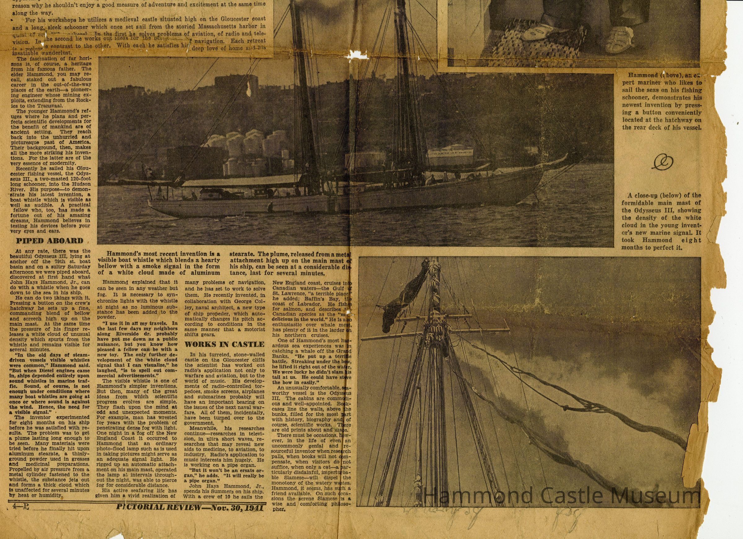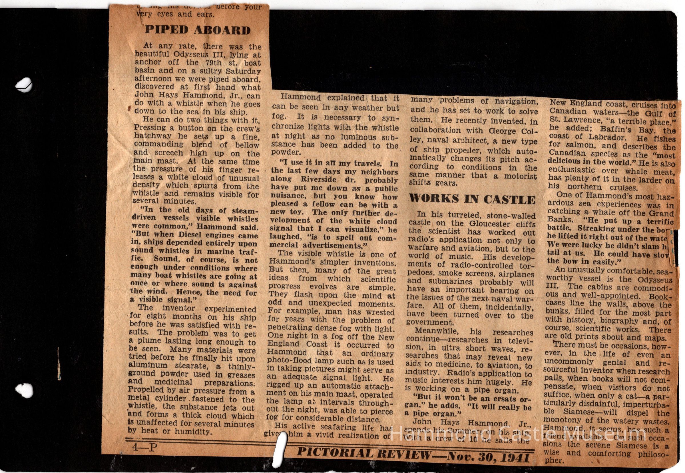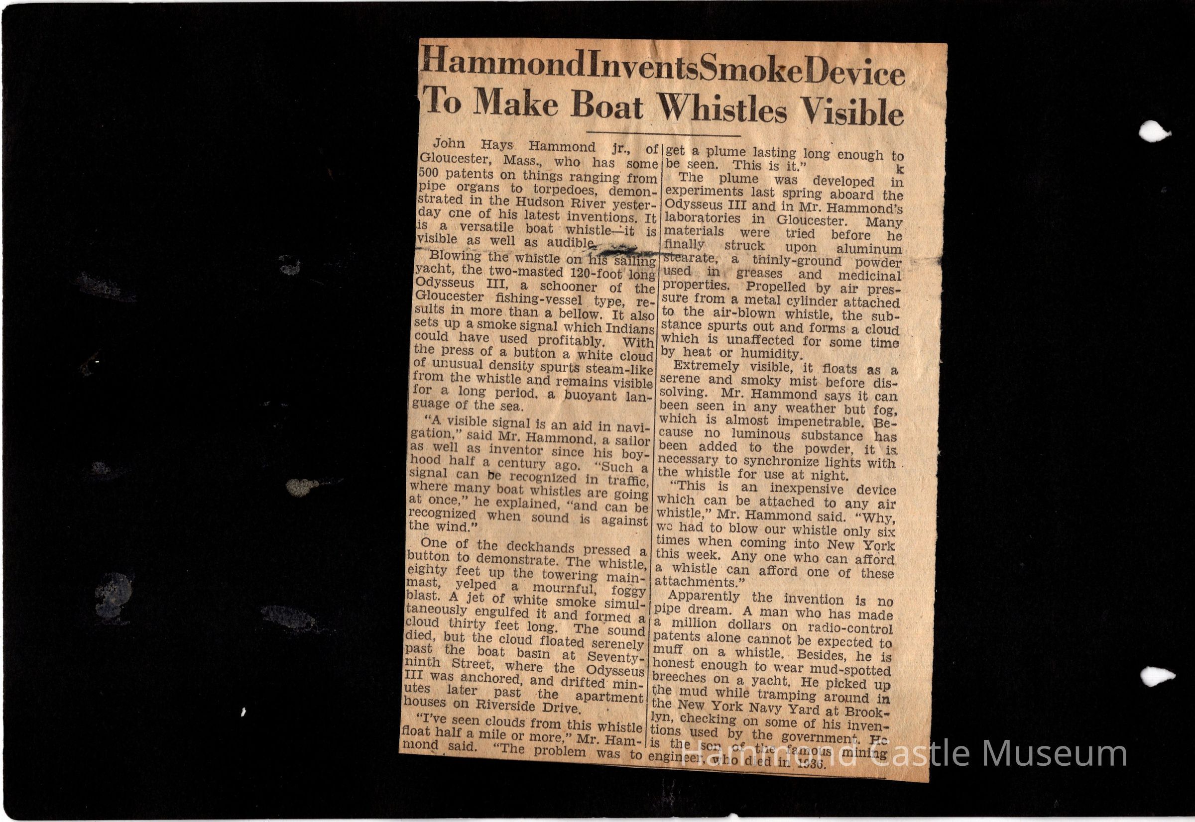 Scrapbook of Odysseus crew and sail to Washington DC kept by crew member, Albert Leslie Lundgren. Also includes news clippings of Hammond's "Visible Whistle," WWII weapons and obituaries.