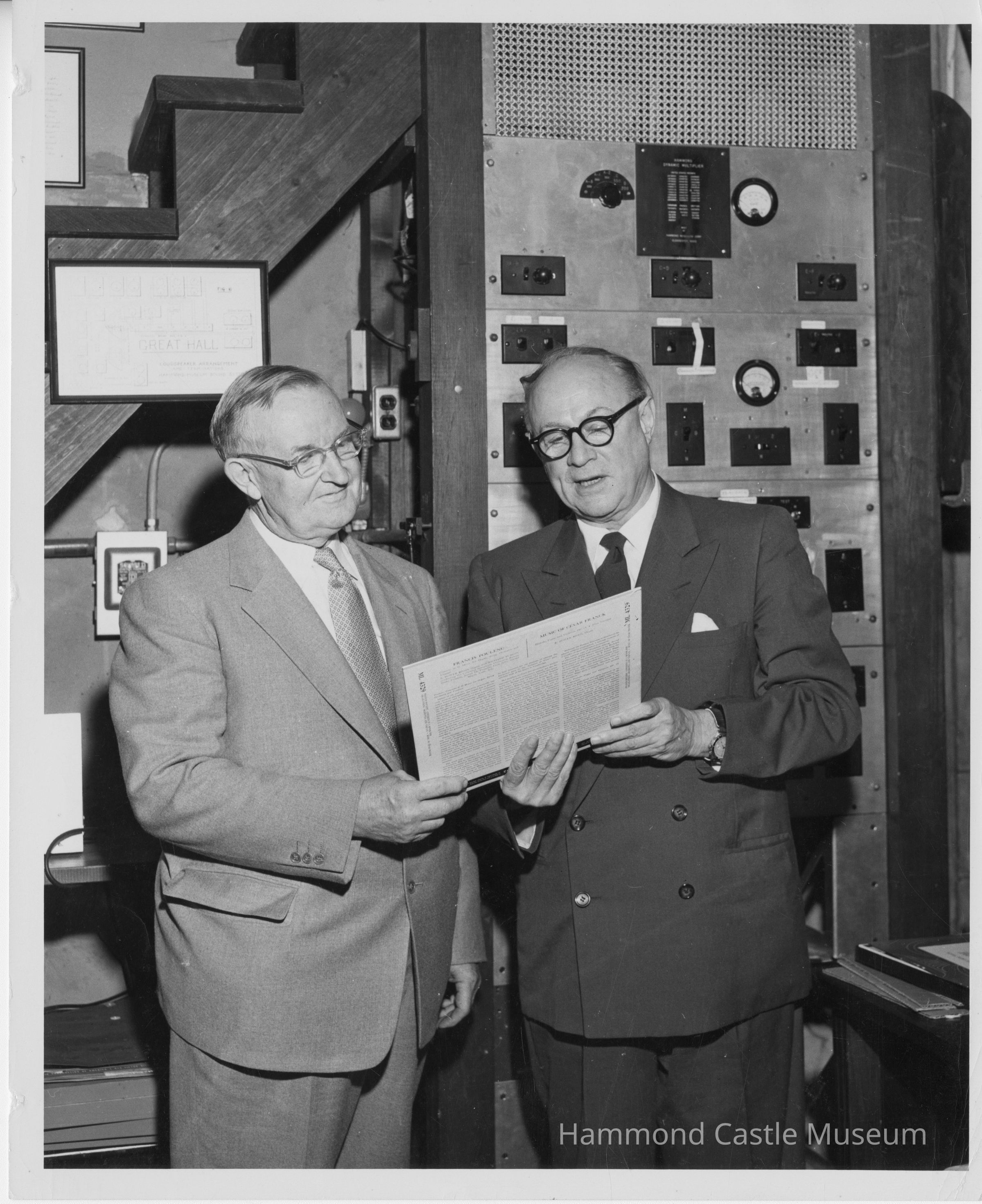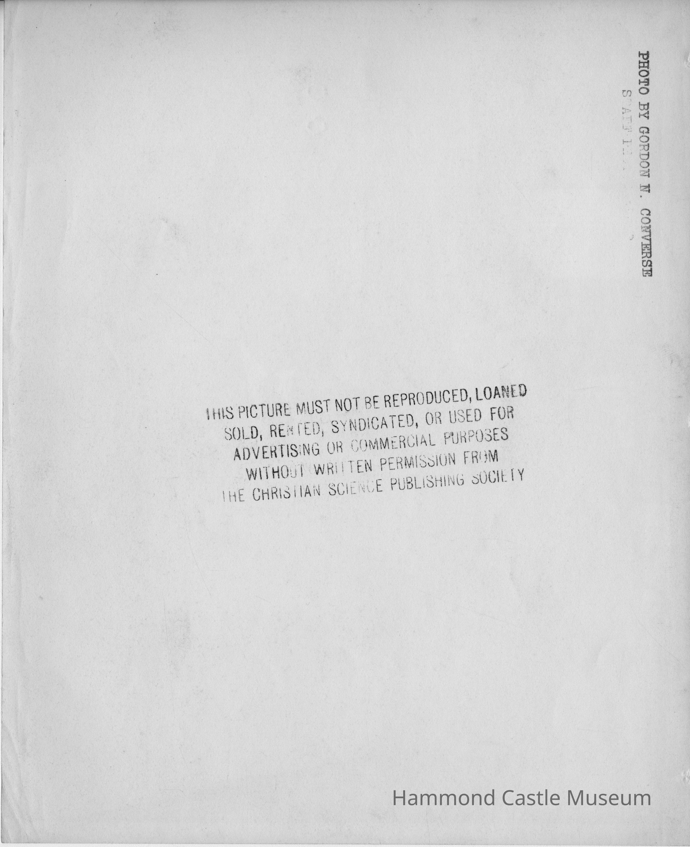 2 copies of photo of Ellison Purington & Hammond with Dynamic Amplifier in organ loft stairway Christian Science Publishing Society image