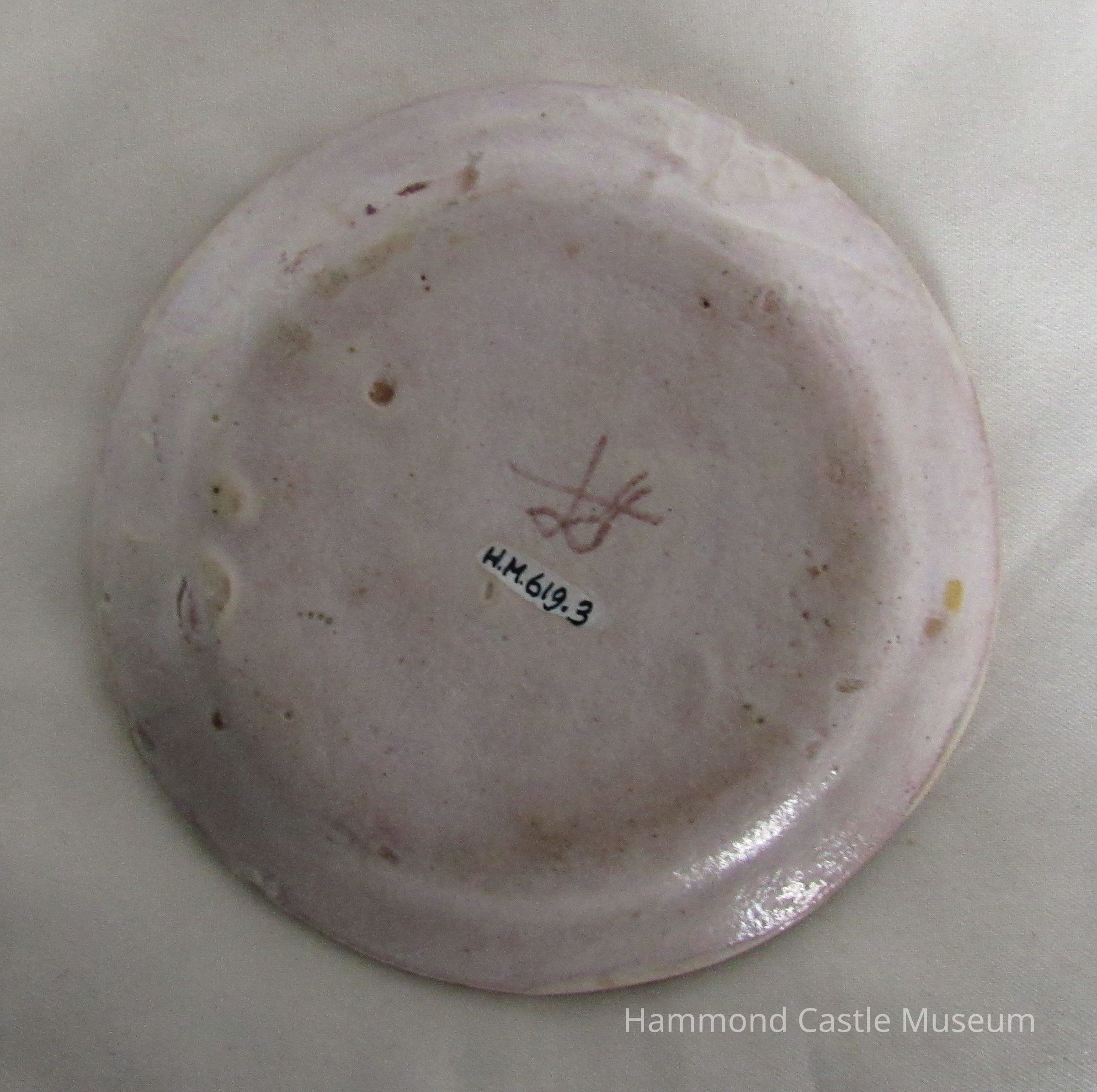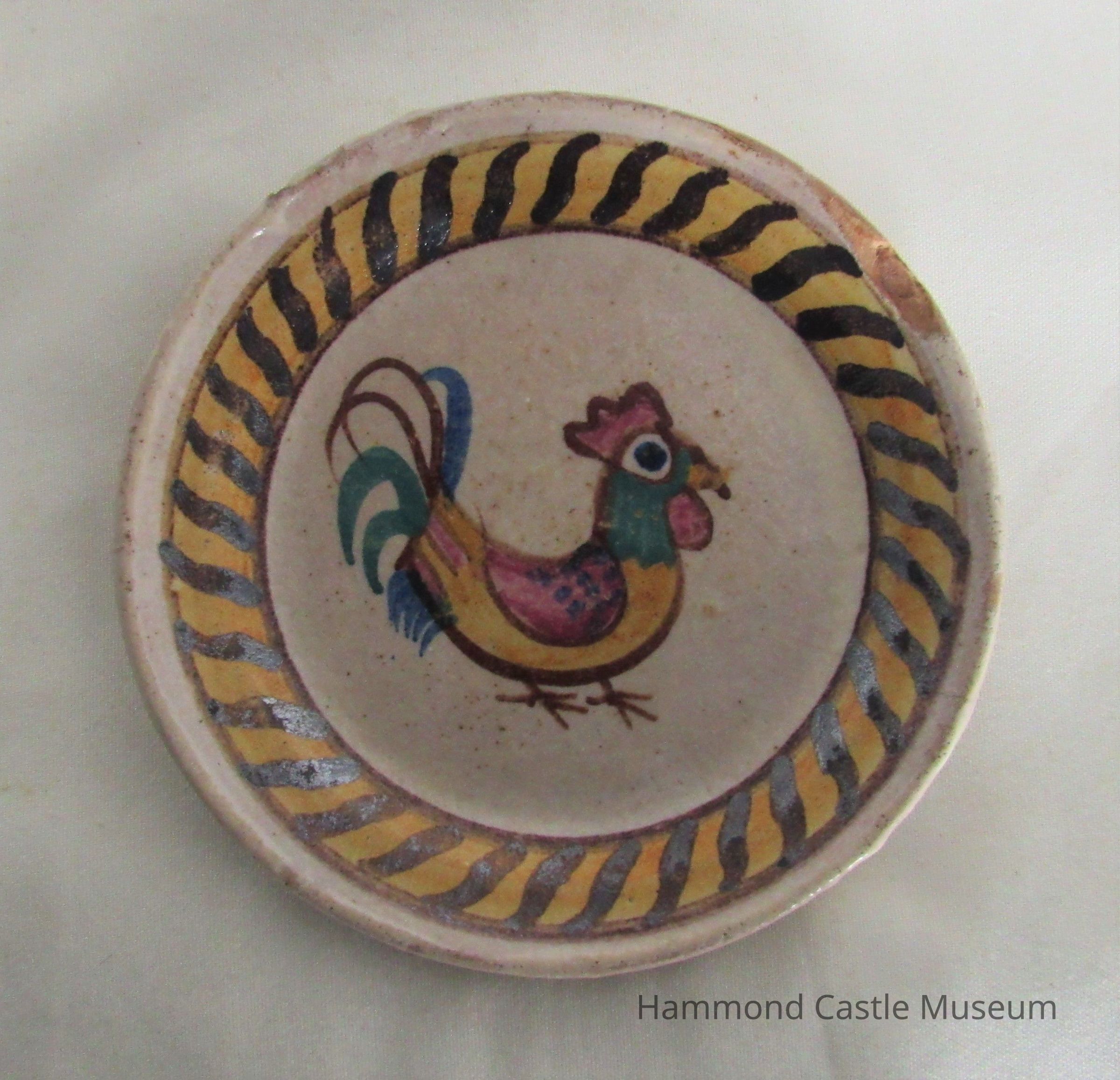 19th/20th century Italian earthenware plate with image of rooster and stripped ring. Signed with symbol of three connected crosses above a sideways infinity.