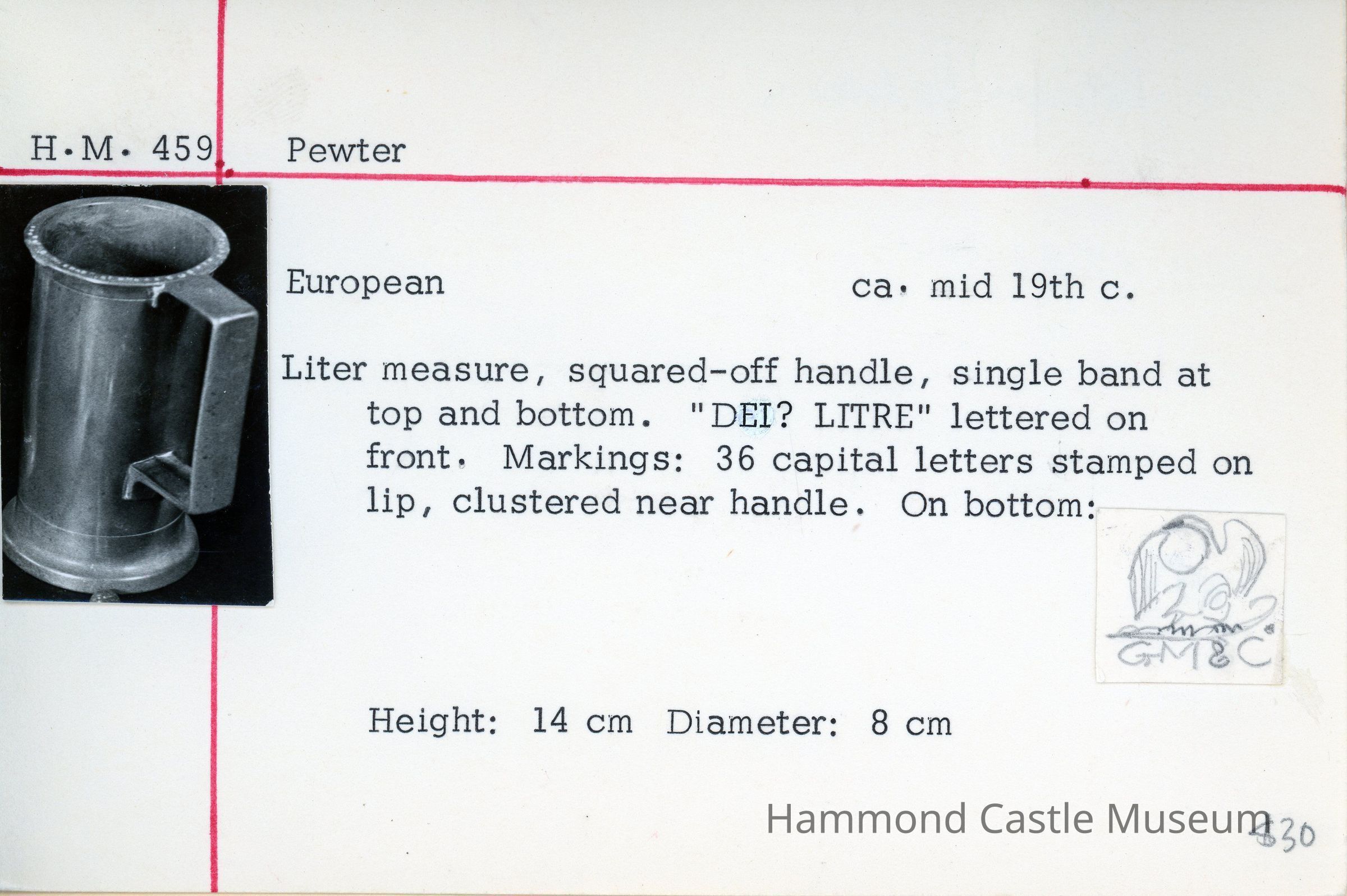 Liter measure, squared-off handle, single band at top and bottom. "DEI? LITER" lettered on front. Markings: 36 capital letters stamped on lip, clustered near handle. On bottom: see catalogue card.