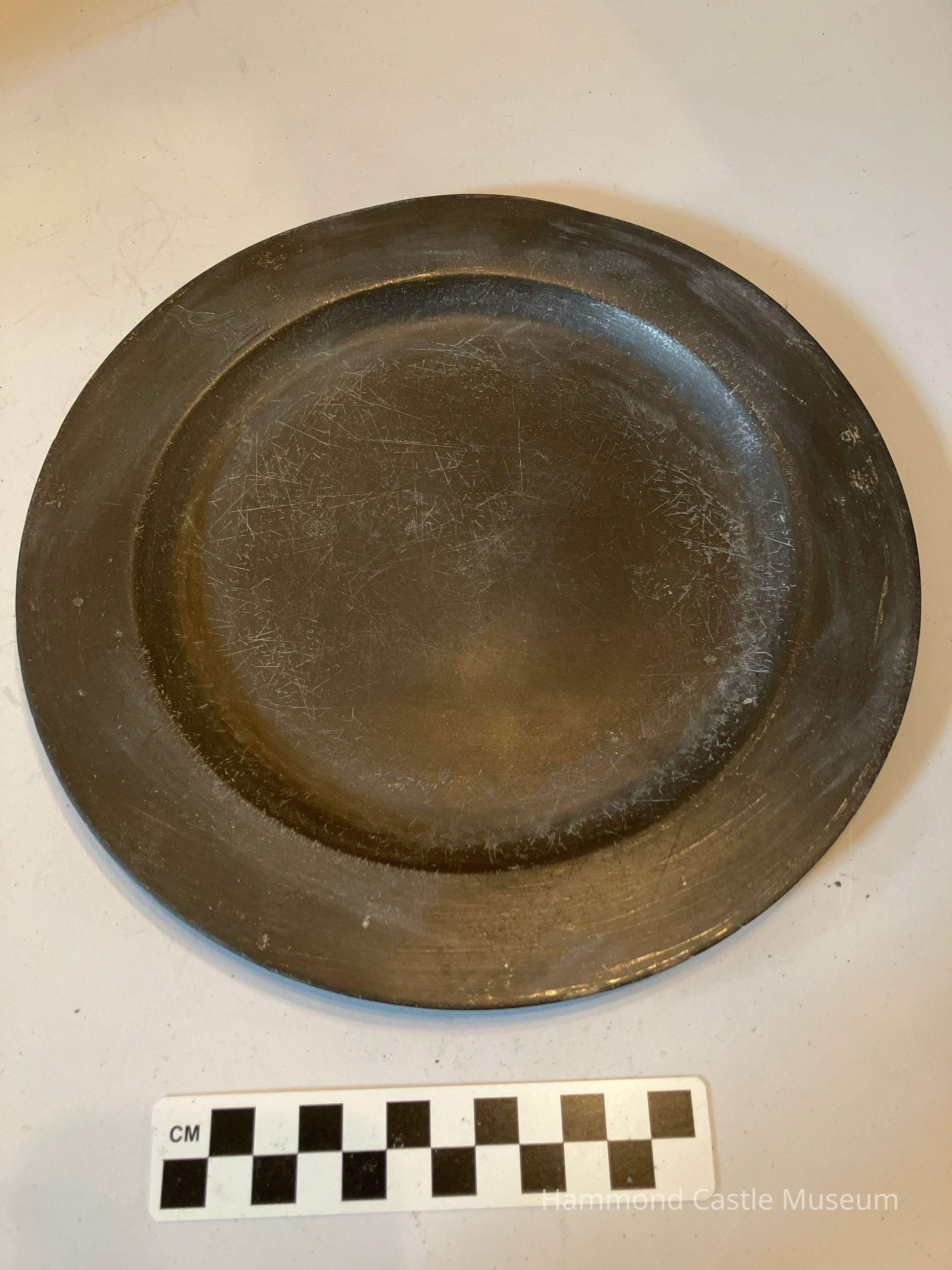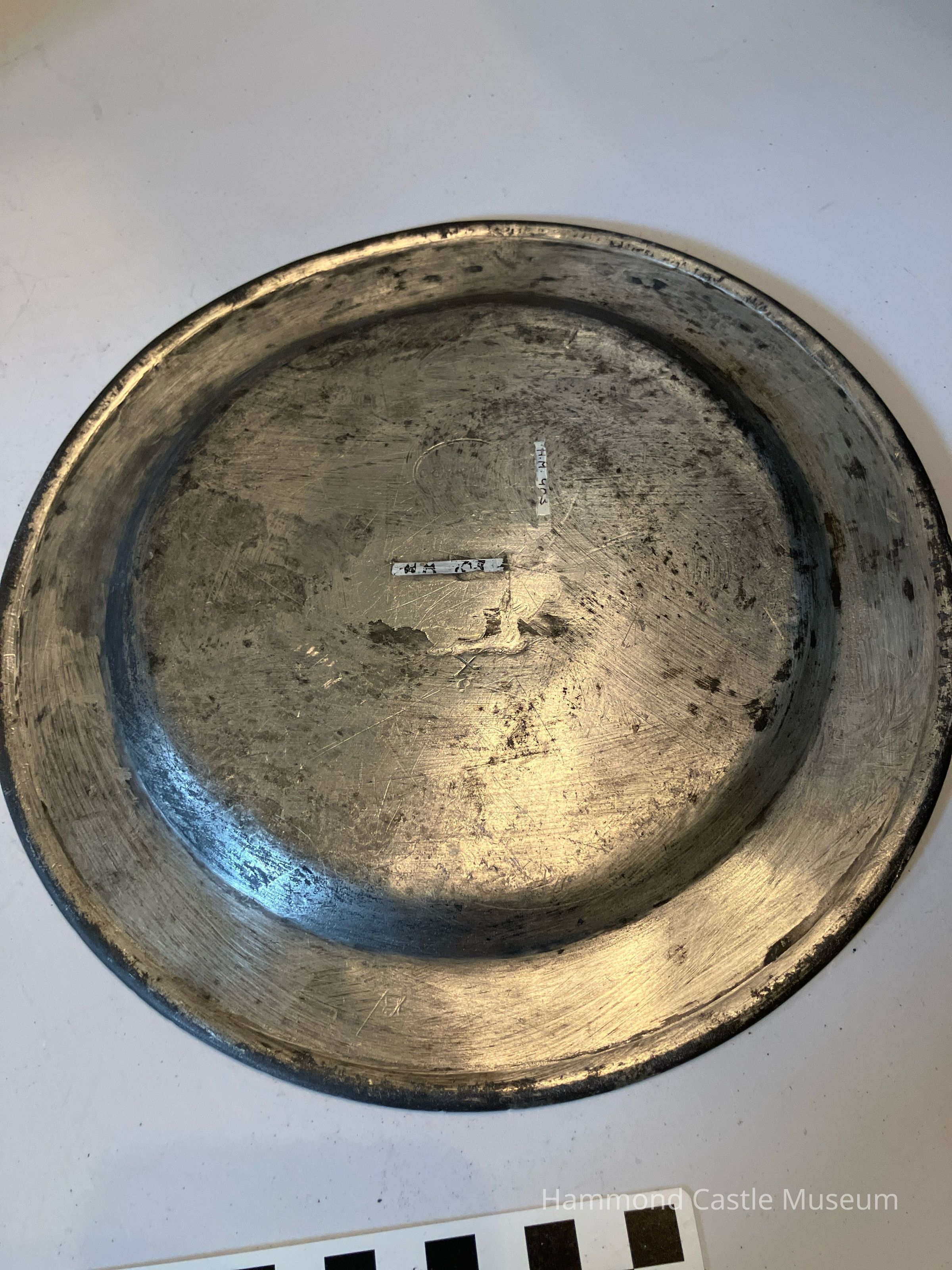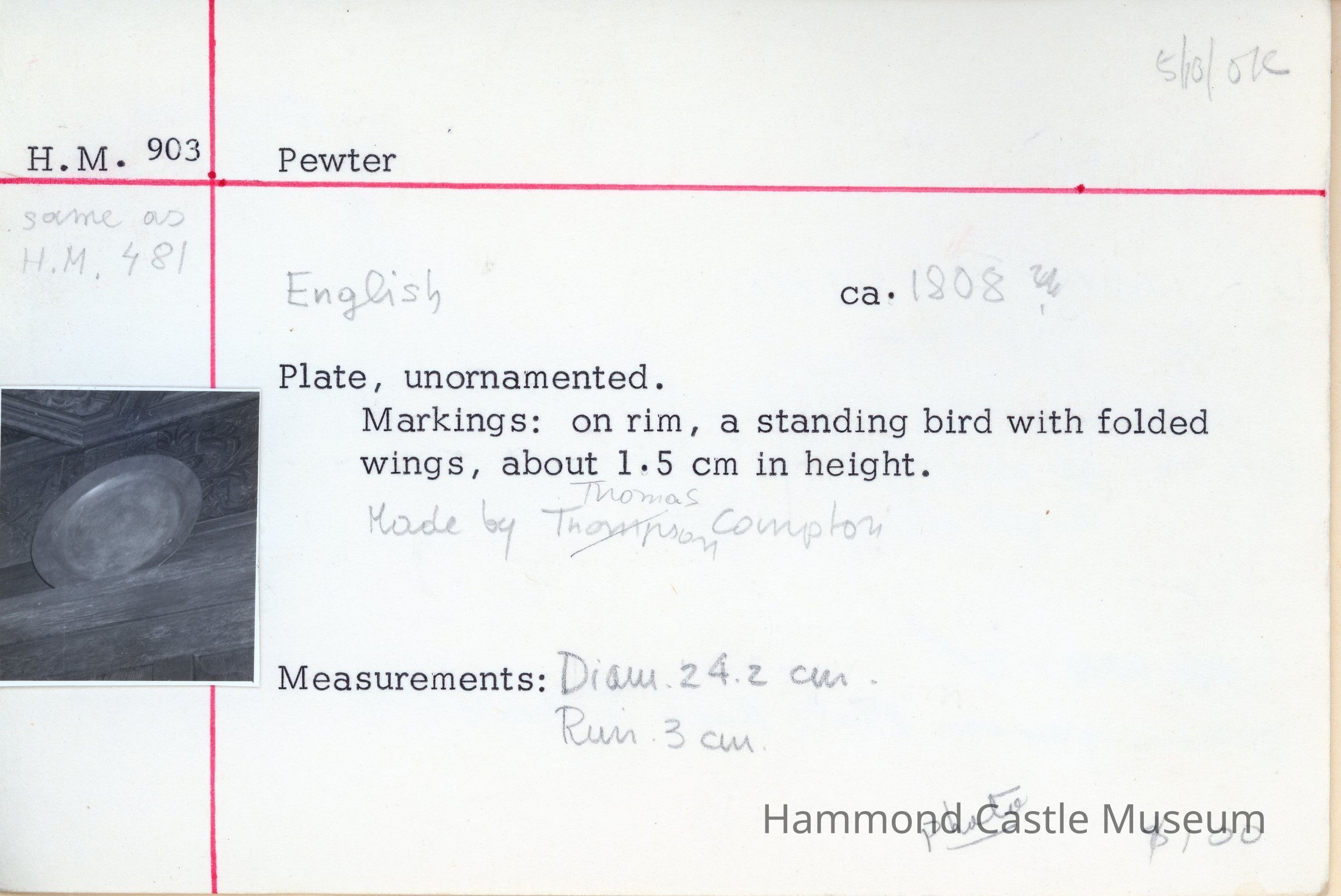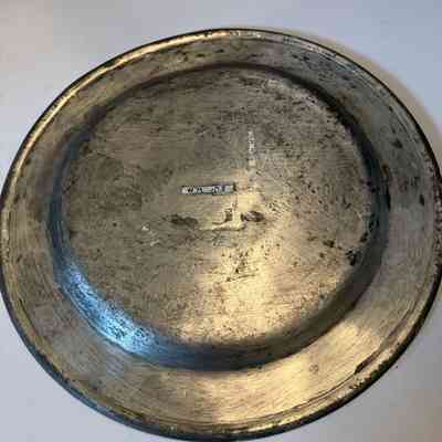 19thc Pewter Plate, ornamented. Markings: on rim, a standing bird with folded wings, about 1.5 cm in height. Made by Thomas Compton. English, circa 1808 Possibly also HM481