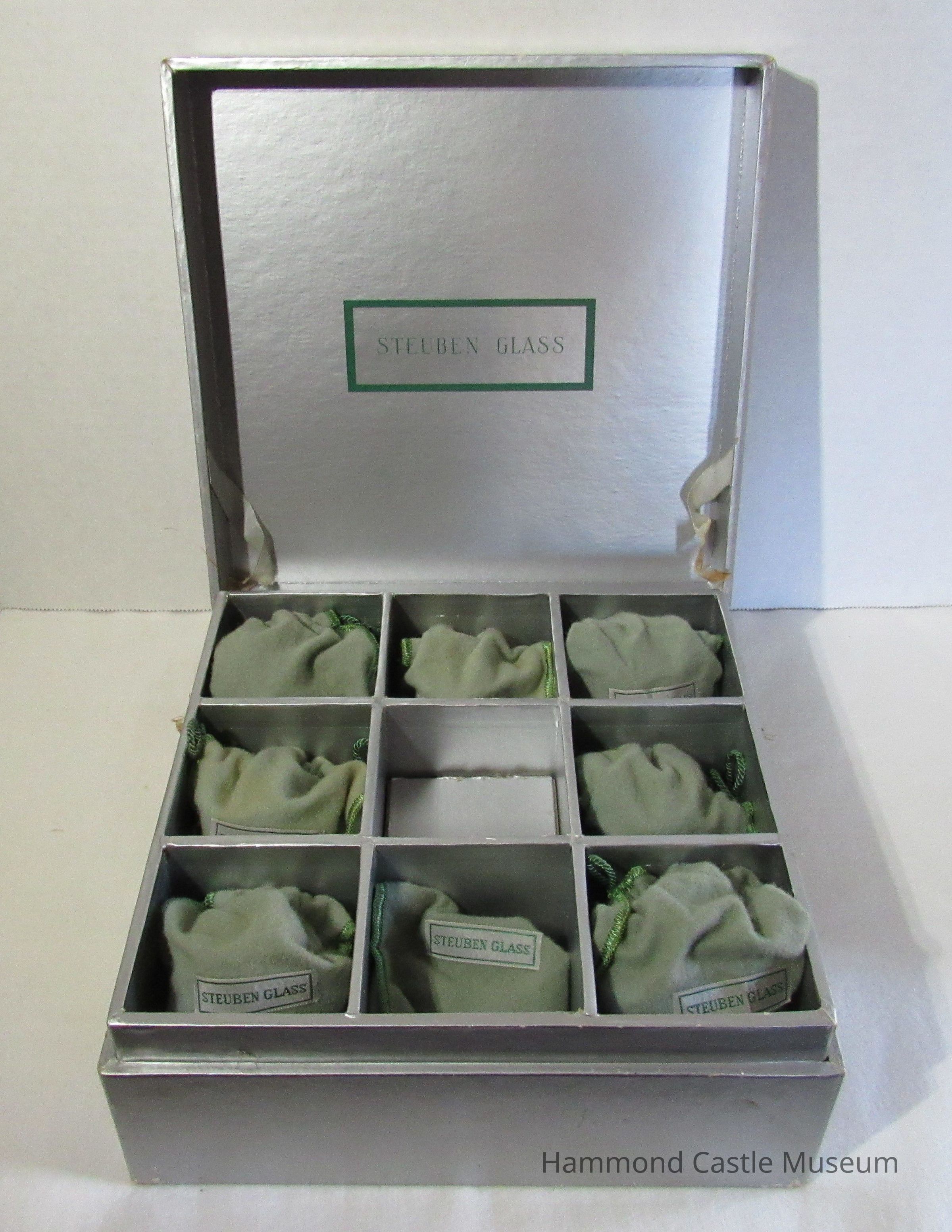 Steuben Glass Shot Glasses Boxed Set 16 pieces total: NN060.1 = the box NN060.2 - NN060.8 = 7 shot glasses NN060.9 - NN060.16 = 8 velvet bags