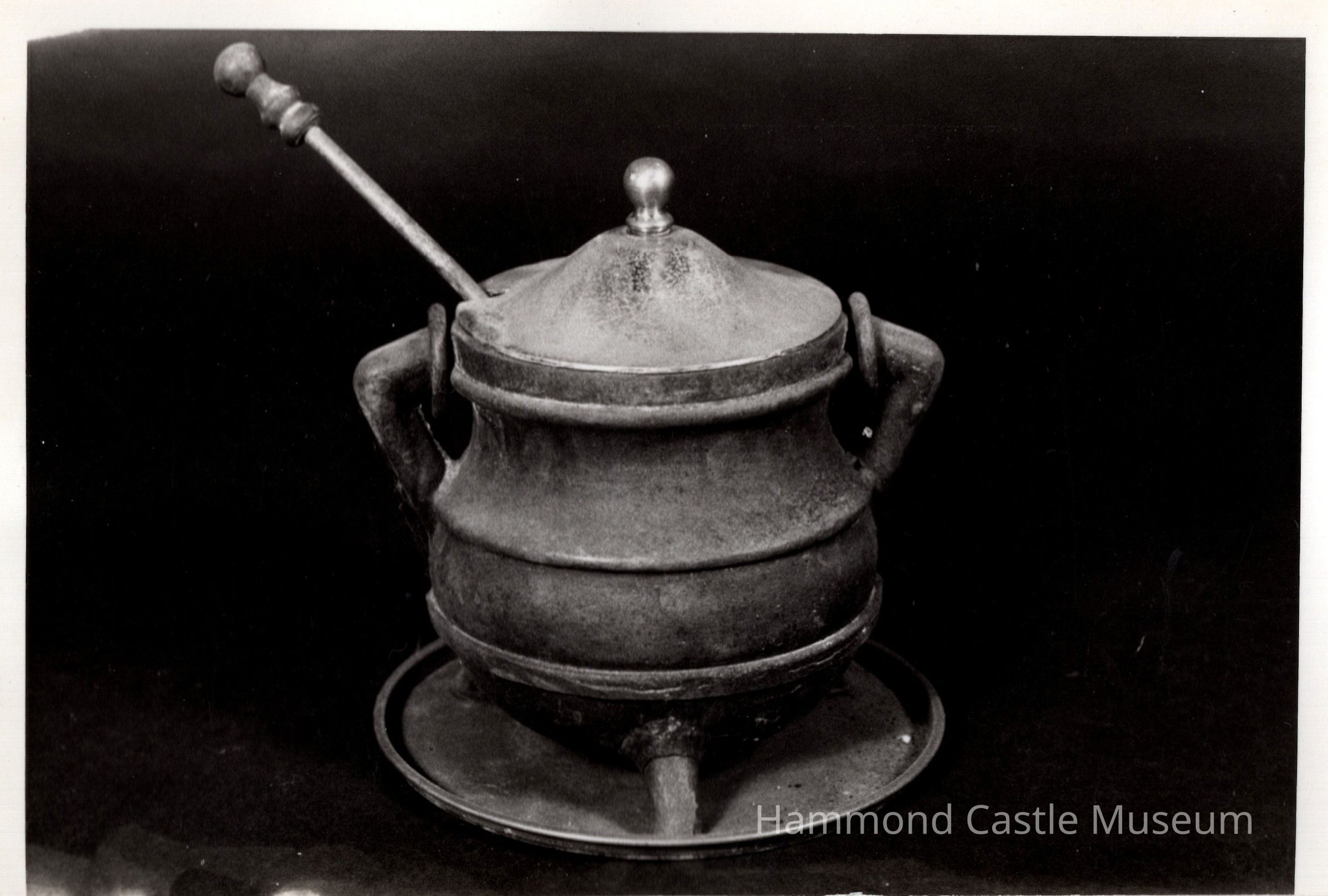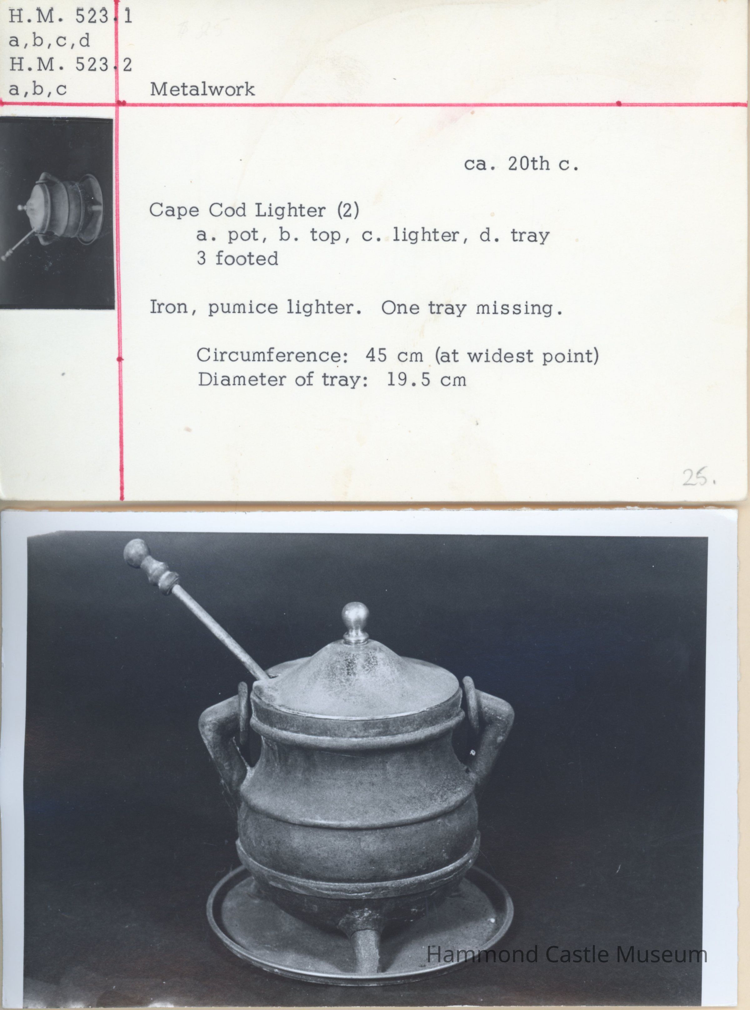 Larger Cape Cod Lighter (fire starter) with 3 parts: a) pot, b) top c) lighter, *no tray In lower guestroom during Hammond's lifetime Larger and fatter than HM-523.1