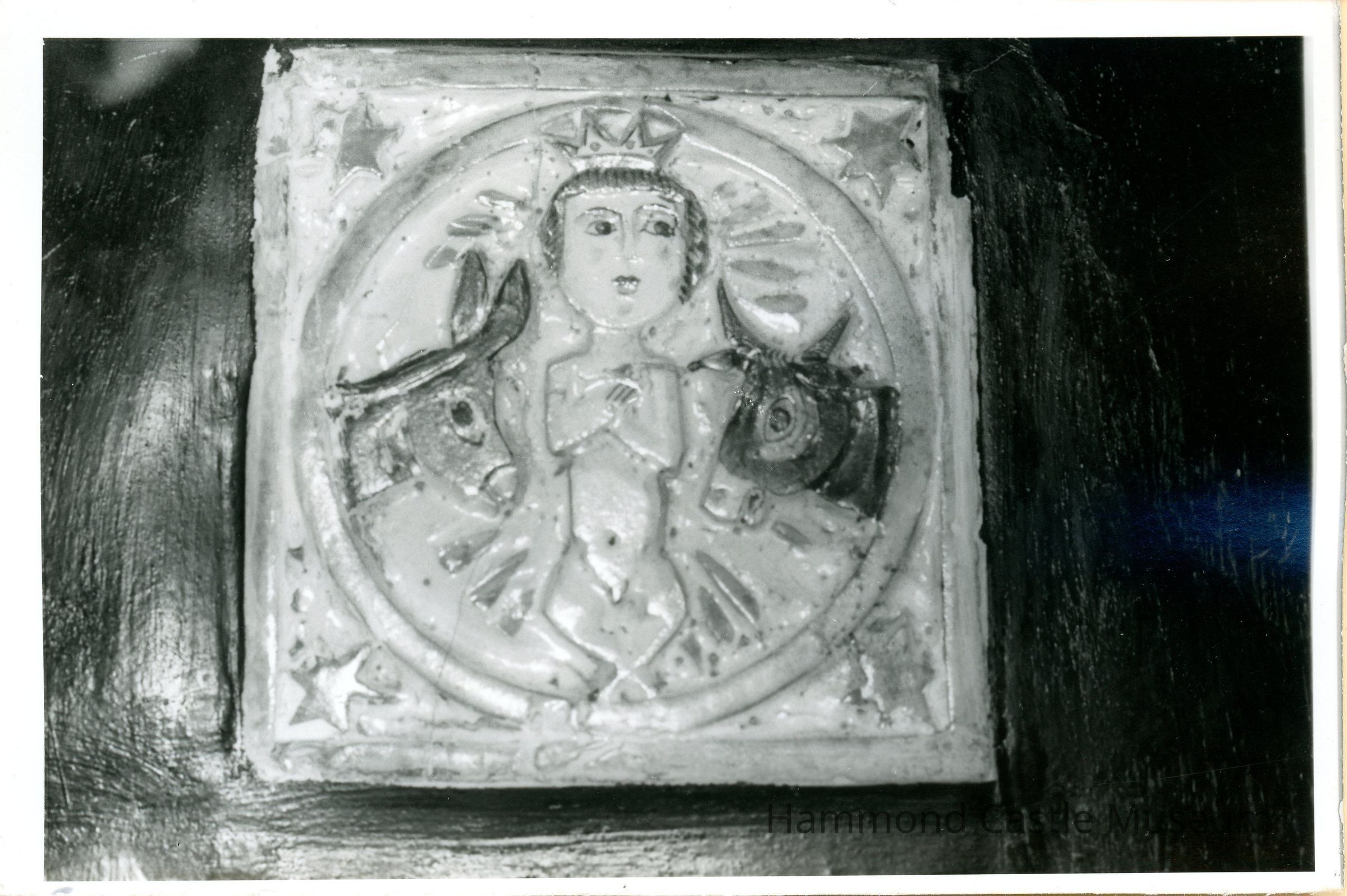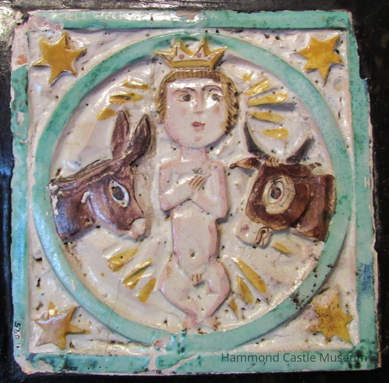 20th c. Sicilian (or Capri) painted decorative tiles of Christ Child w a donkey and cow. 1 ceramic tile in relief, painted in colorful glazes. purchased 1928-08-15 from Libreria Arcadia, Capri