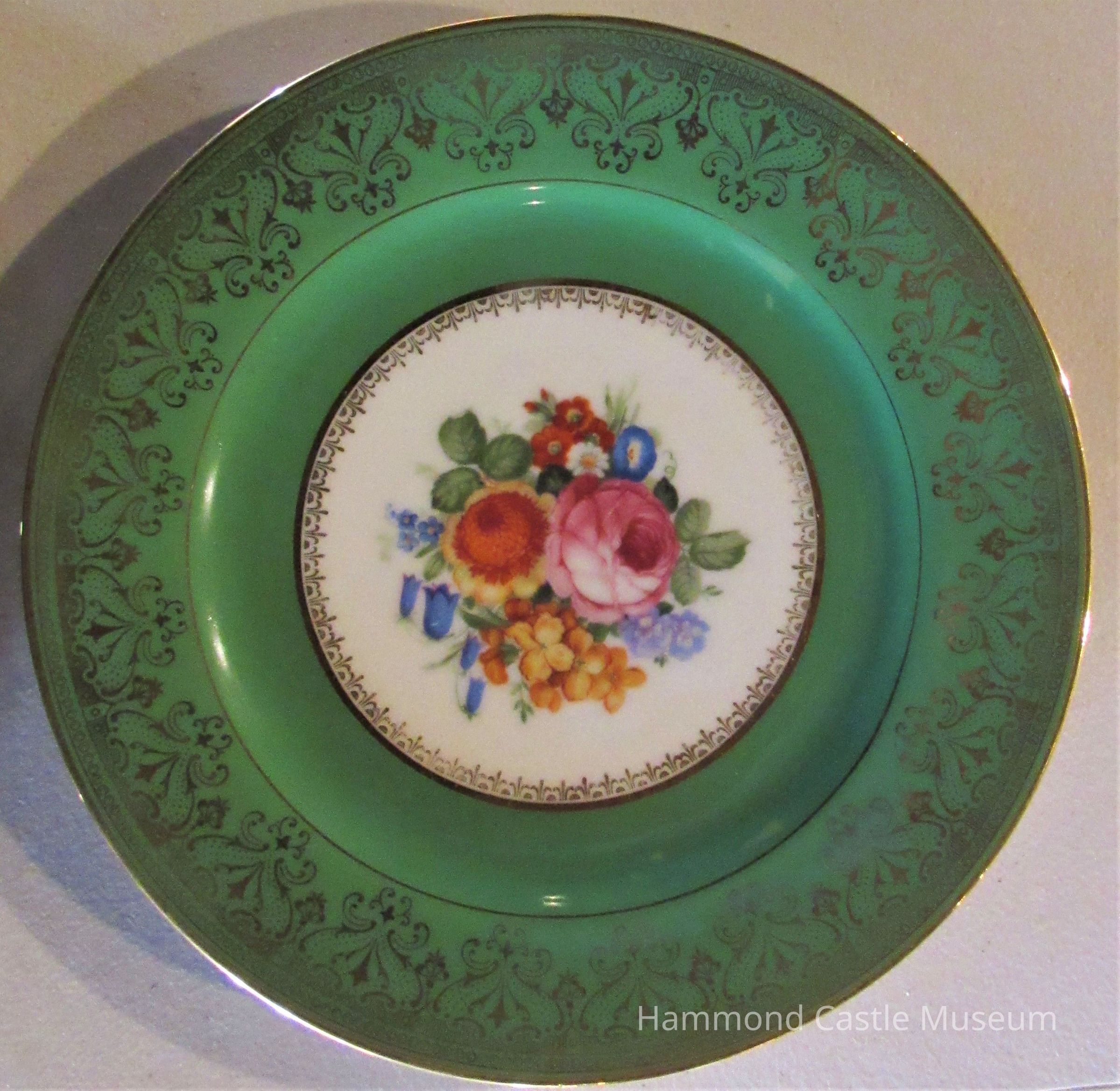 Bavarian ceramic plates. Green/gold rim, peony design at center. Only first and last of series are marked.