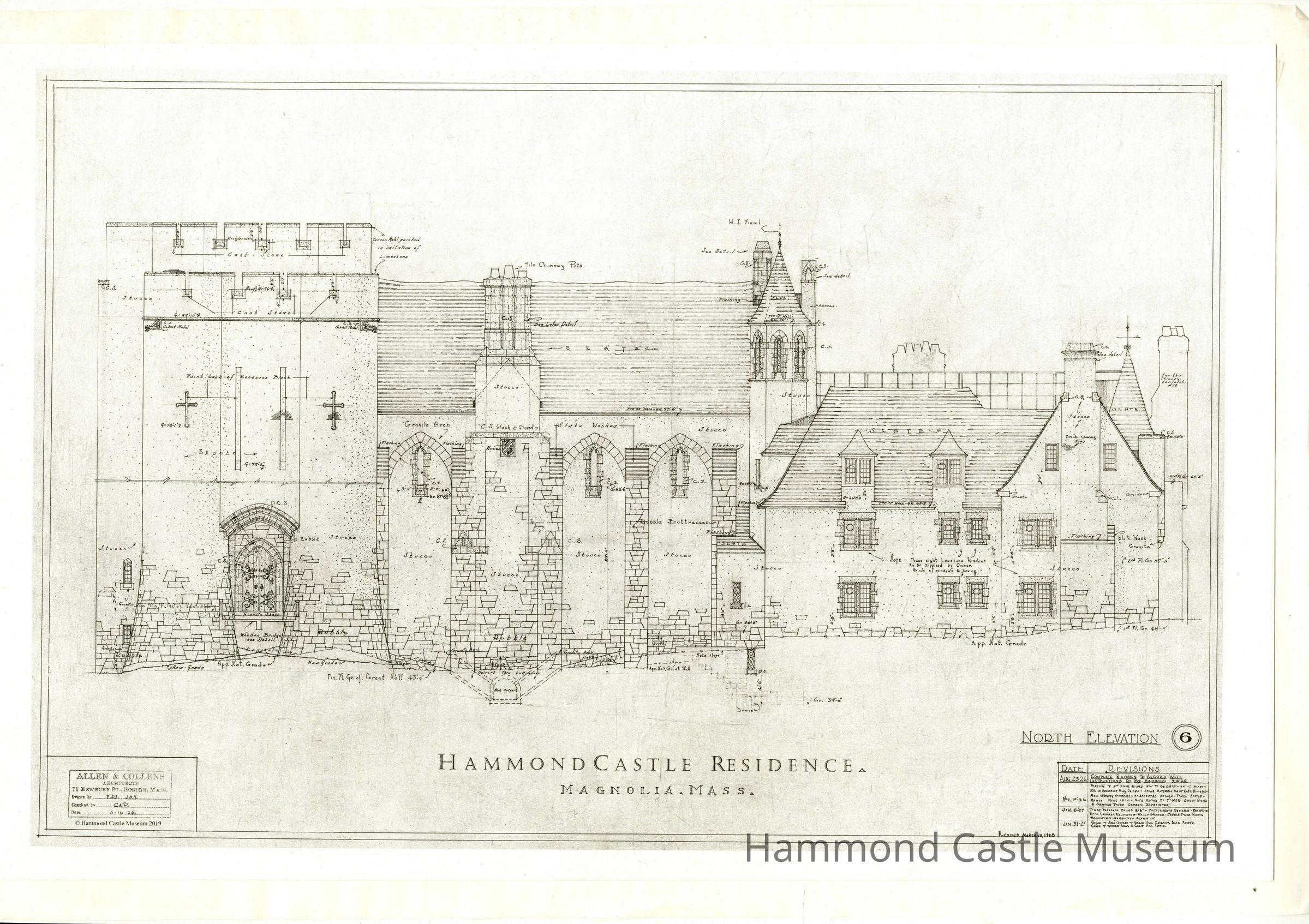 Reprint of 1926-06-16 north elevation of castle done by Allen & Collens, redrawn in 2019