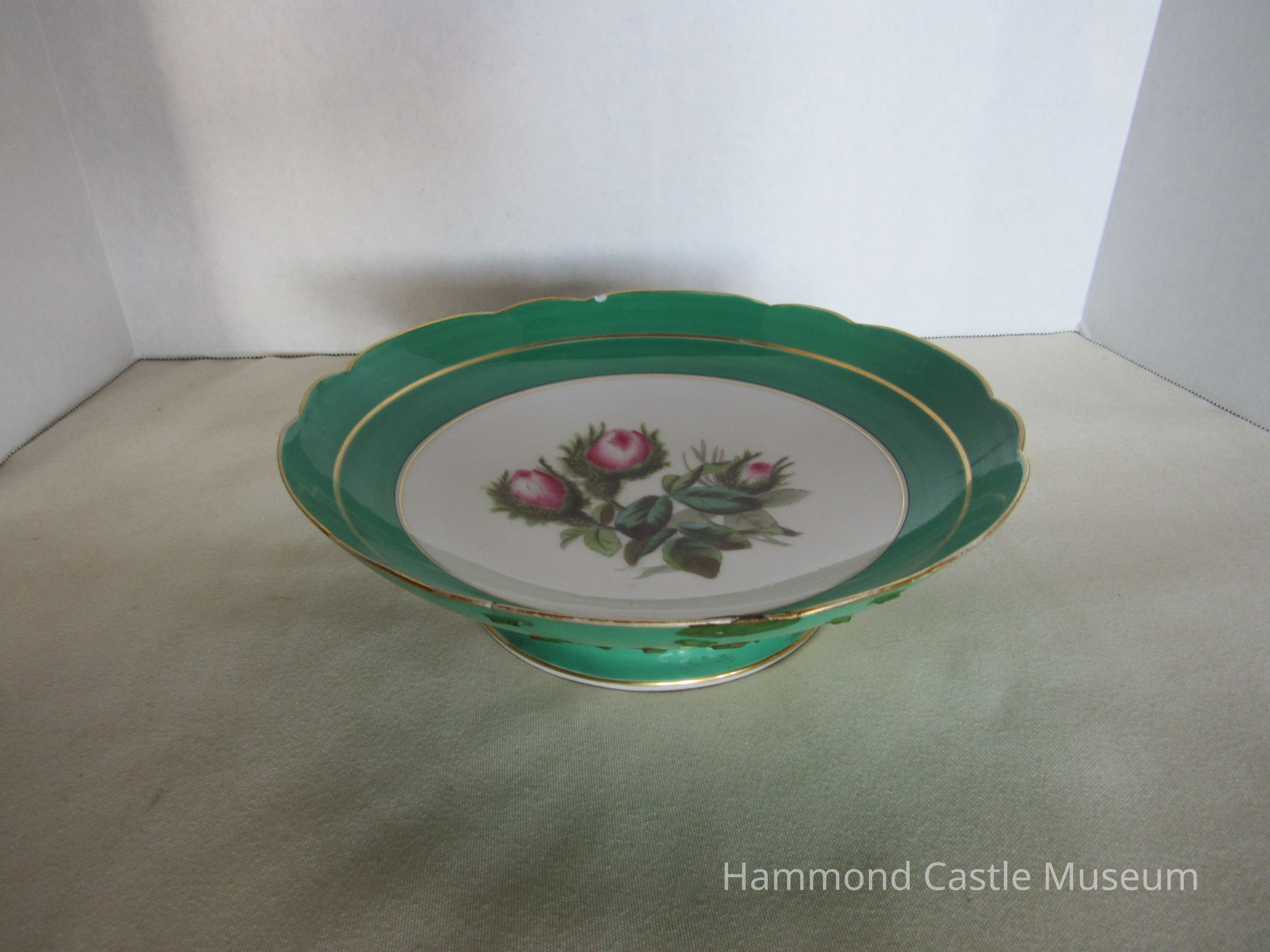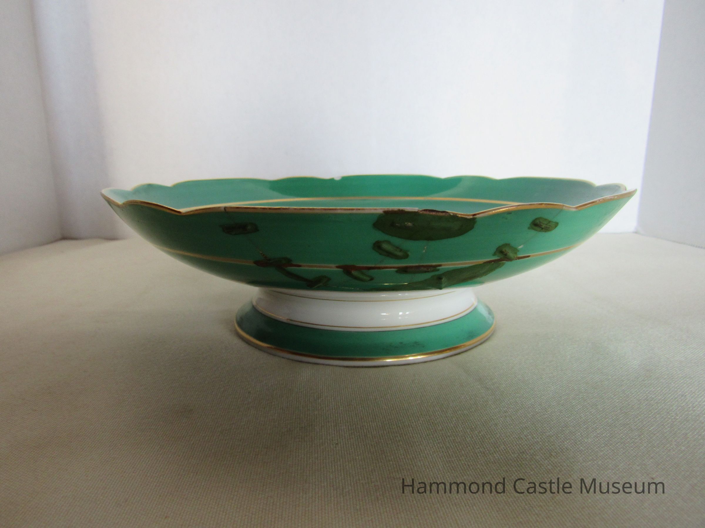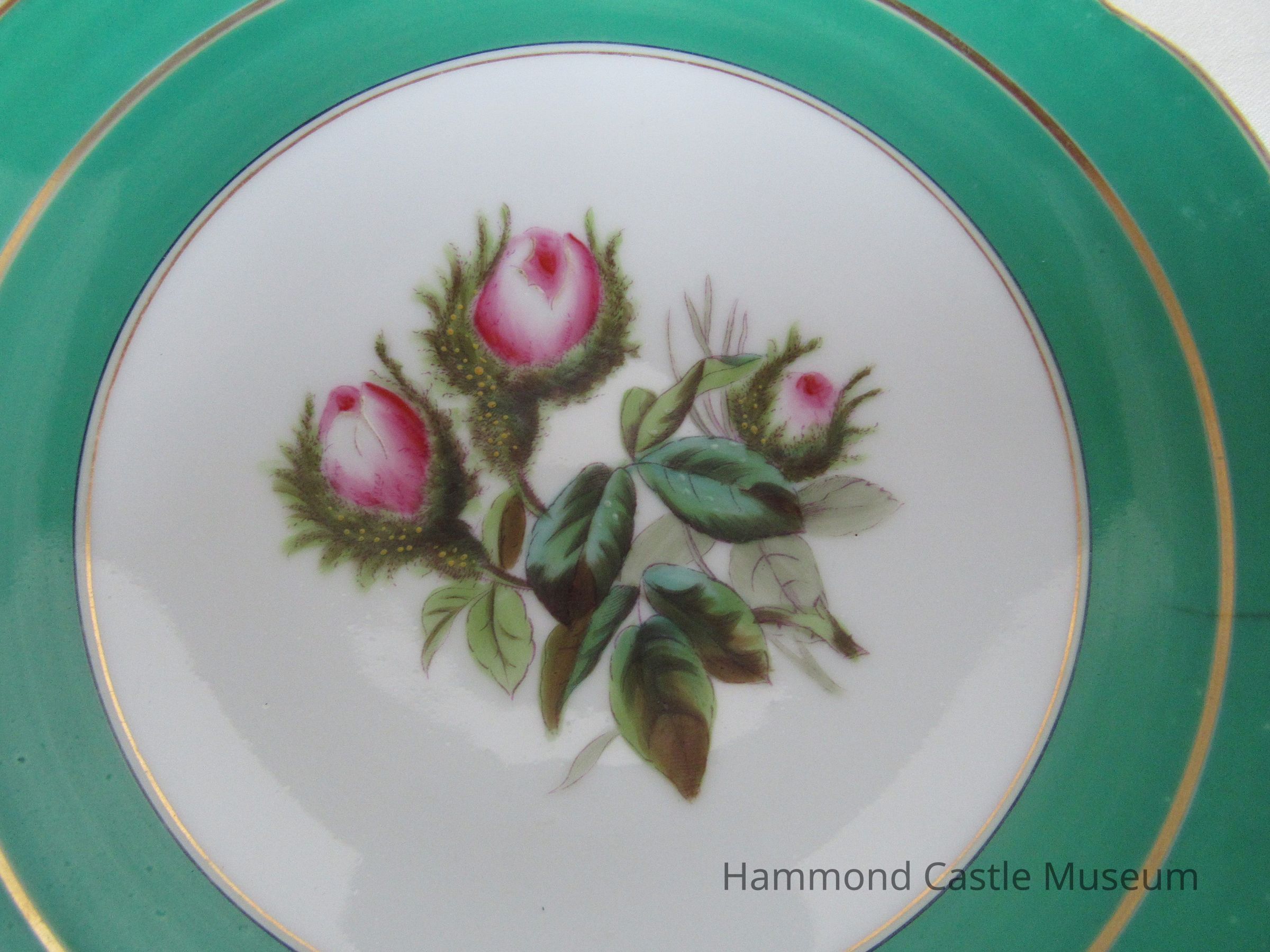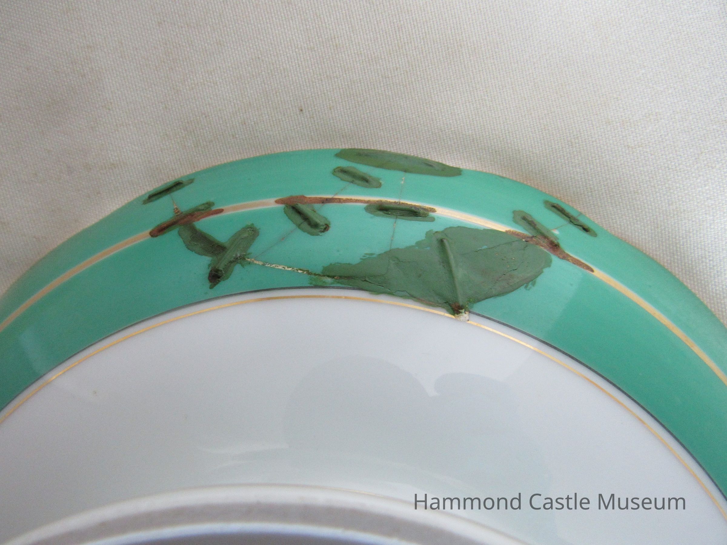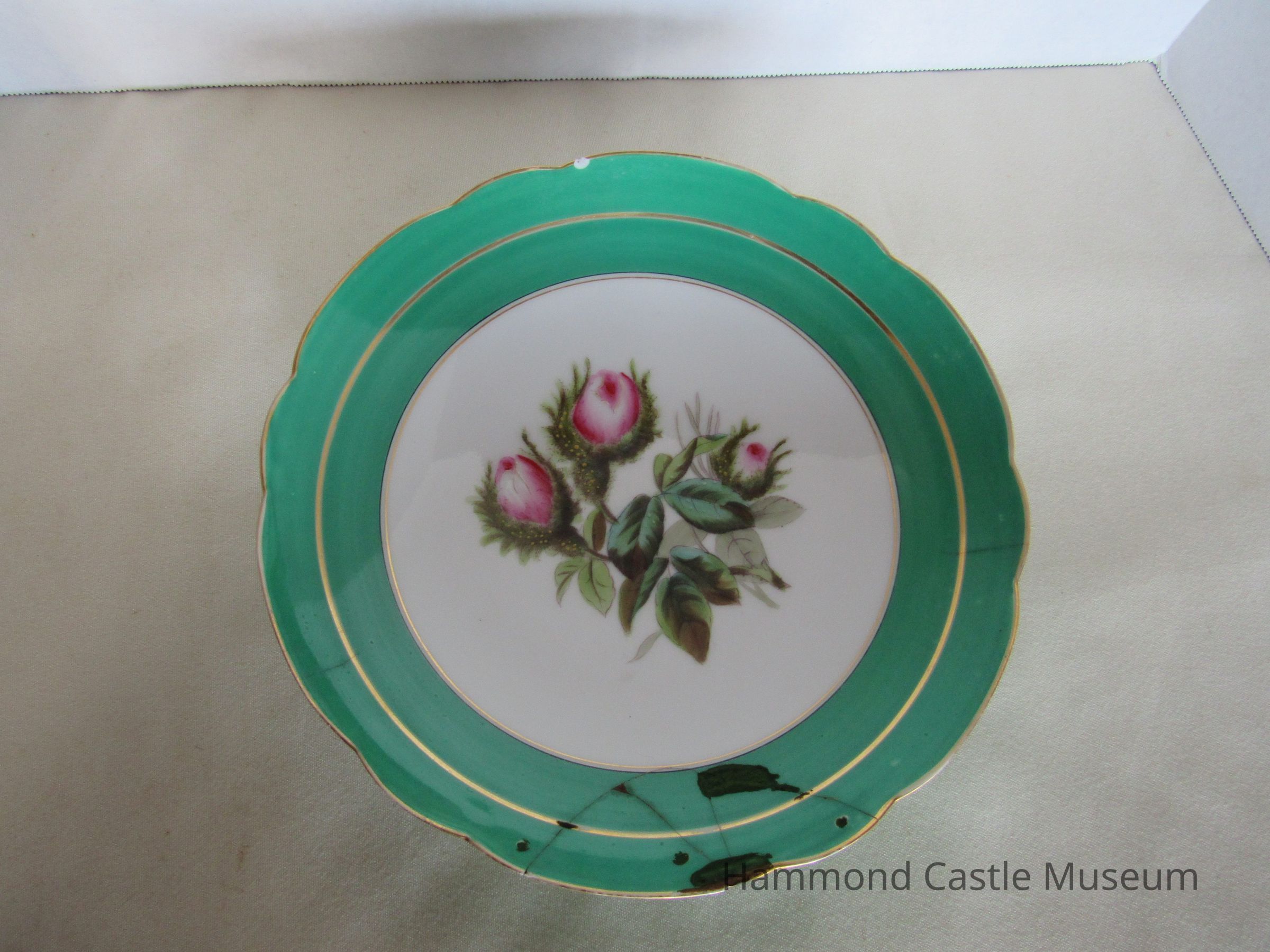 Soup bowl. Slight scallop at green/gold border. Three pink flowers at center of each bowl. Repair work done on two plates.