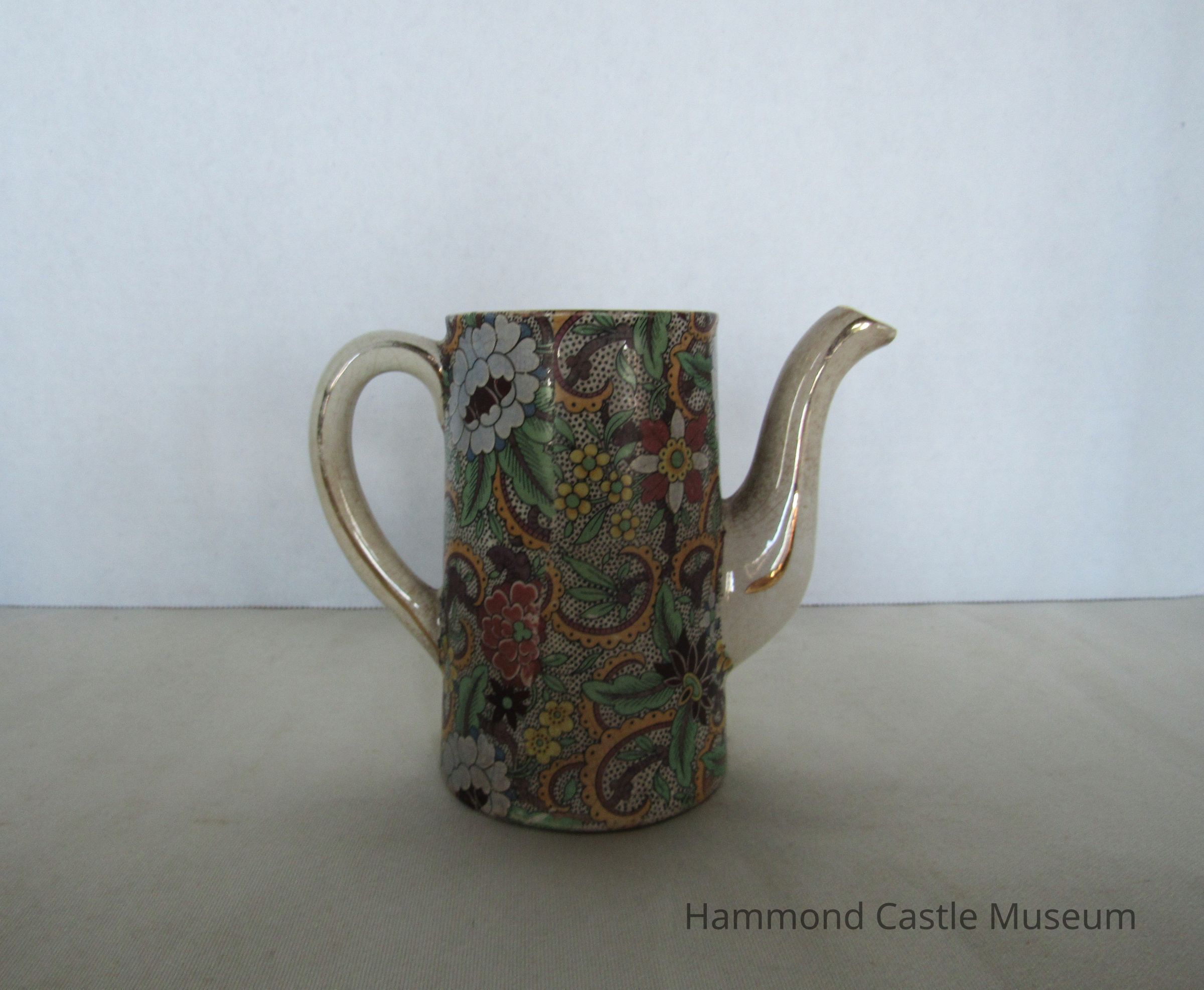 Small English tea or coffee pot with broken spout. Paisley pattern. Missing top? Markings: ENGLAND (sideways horseshoe or omega around a lowercase S)