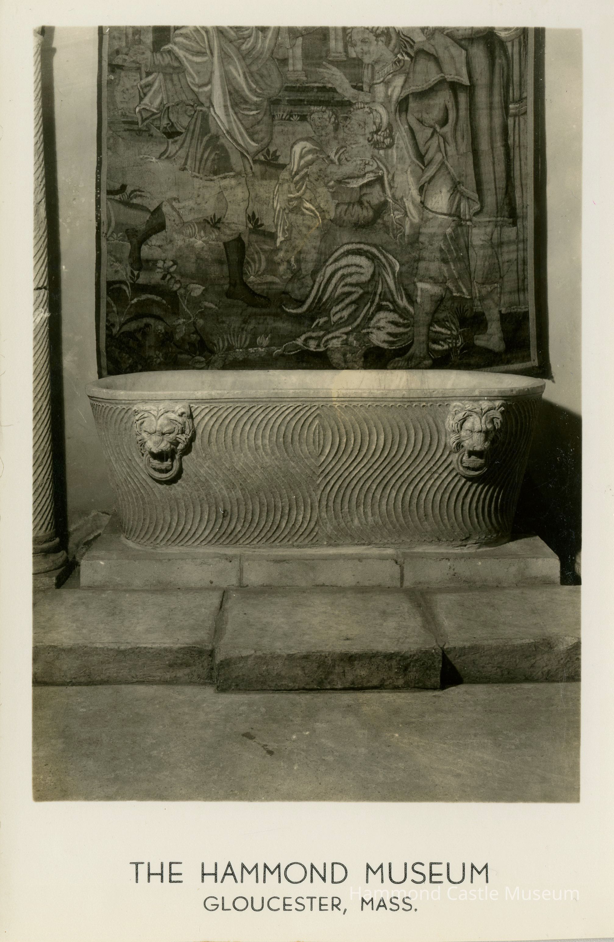Early postcard of 2nd Tower gallery with lion sarcophagus, tapestry above