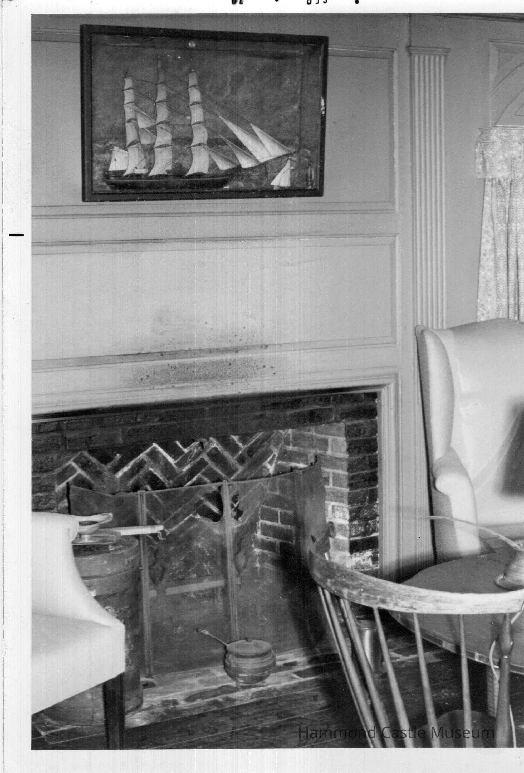 Diorama with 3 masted ship w square rigging & 4 jibs Small sailboat in owner right corner 1965 Probate Inventory - Sitting Room